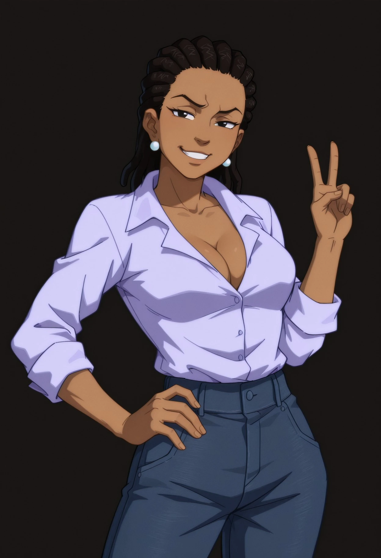 Crng_Cstm, Black Hair, Dreadlocks, Hair Pulled Back, Black Eyes, Earrings, White Earrings, Dark-skinned Female, Dark Skin, Lavender Shirt, Collared Shirt, Cleavage, Blue Pants