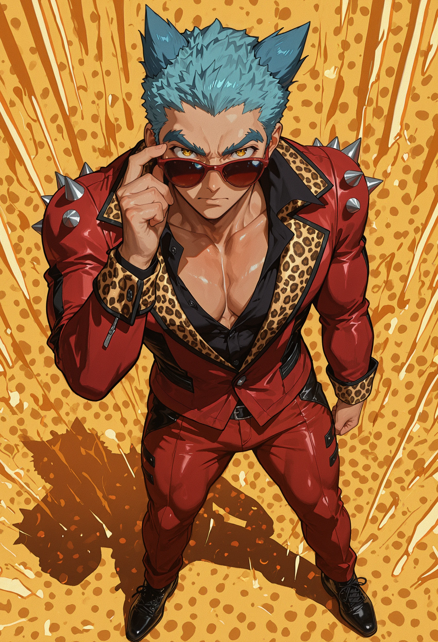 sleeveless jacket, red jacket, red pantspurple jacket, purple pants, black belt, sleeves rolled upred bikesuit, shoulder spikes, leopard print lapels, leopard print sleeve cuffs, contrast lapels, full-length zipperred jumpsuit, full-length zippershort jumpsuit, white jumpsuit, full-length zipper, two-sided fabric, white hoodAnime screencaps were tagged with