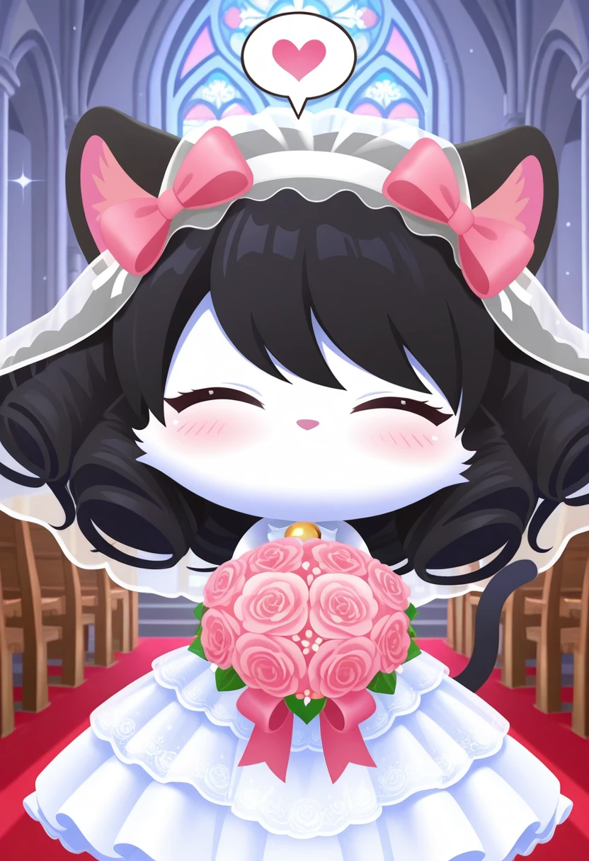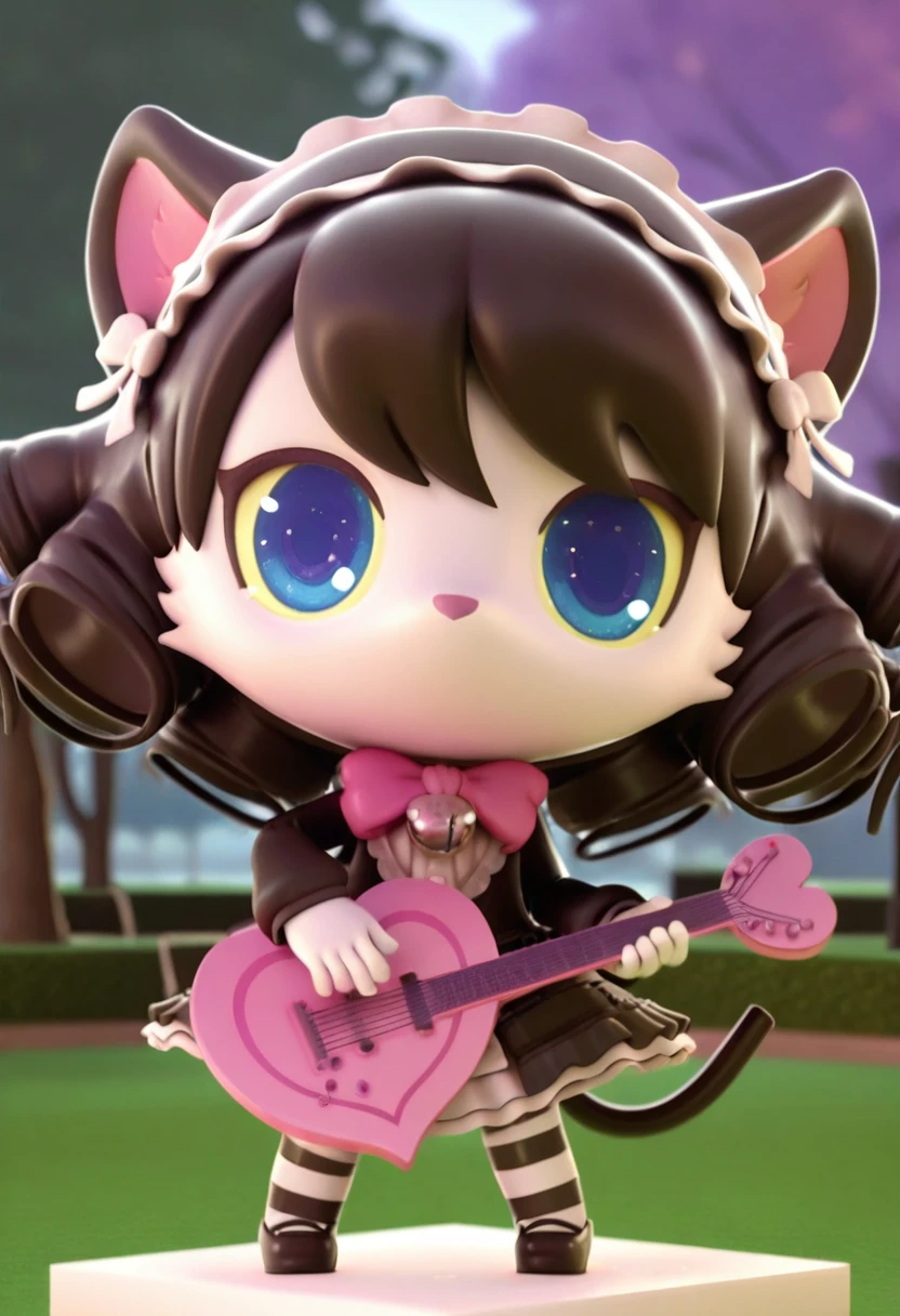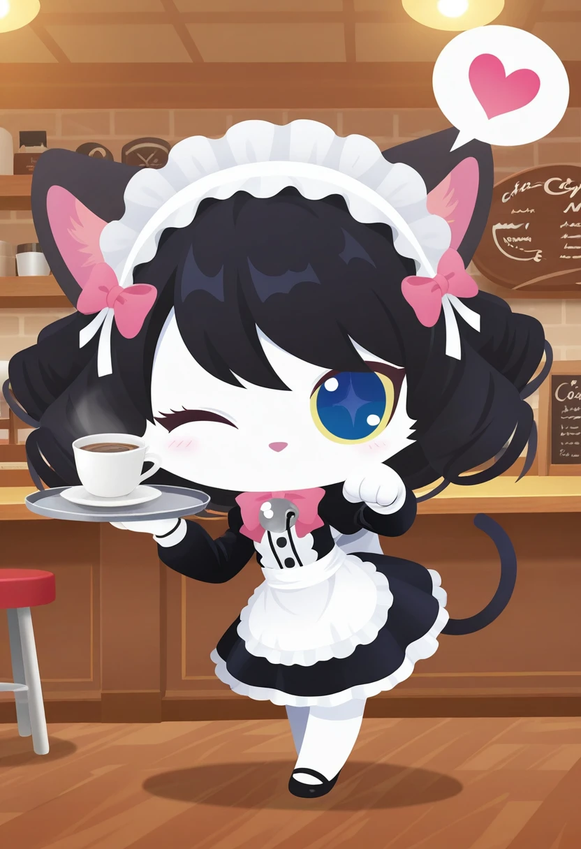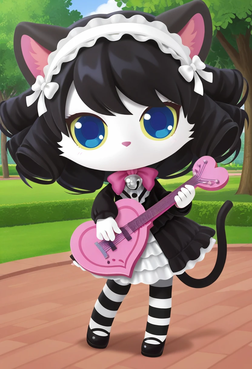 prompts: cyanmyu, tail, blue eyes,colored sclera, yellow sclera, white skin, chibi, black hair, goth dress, hair bow, striped pantyhose, furry,