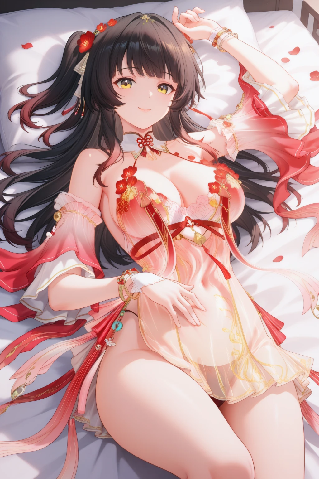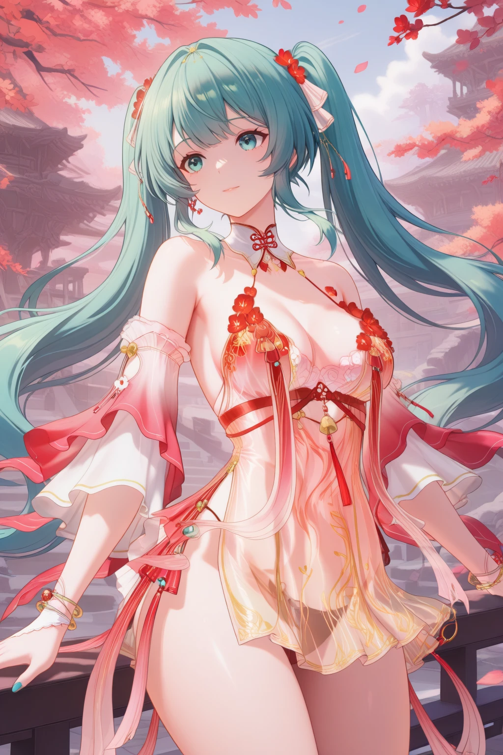 hanfu, see-through dress, detached sleeves, detached collar, ribbon, bracelet, red panties,