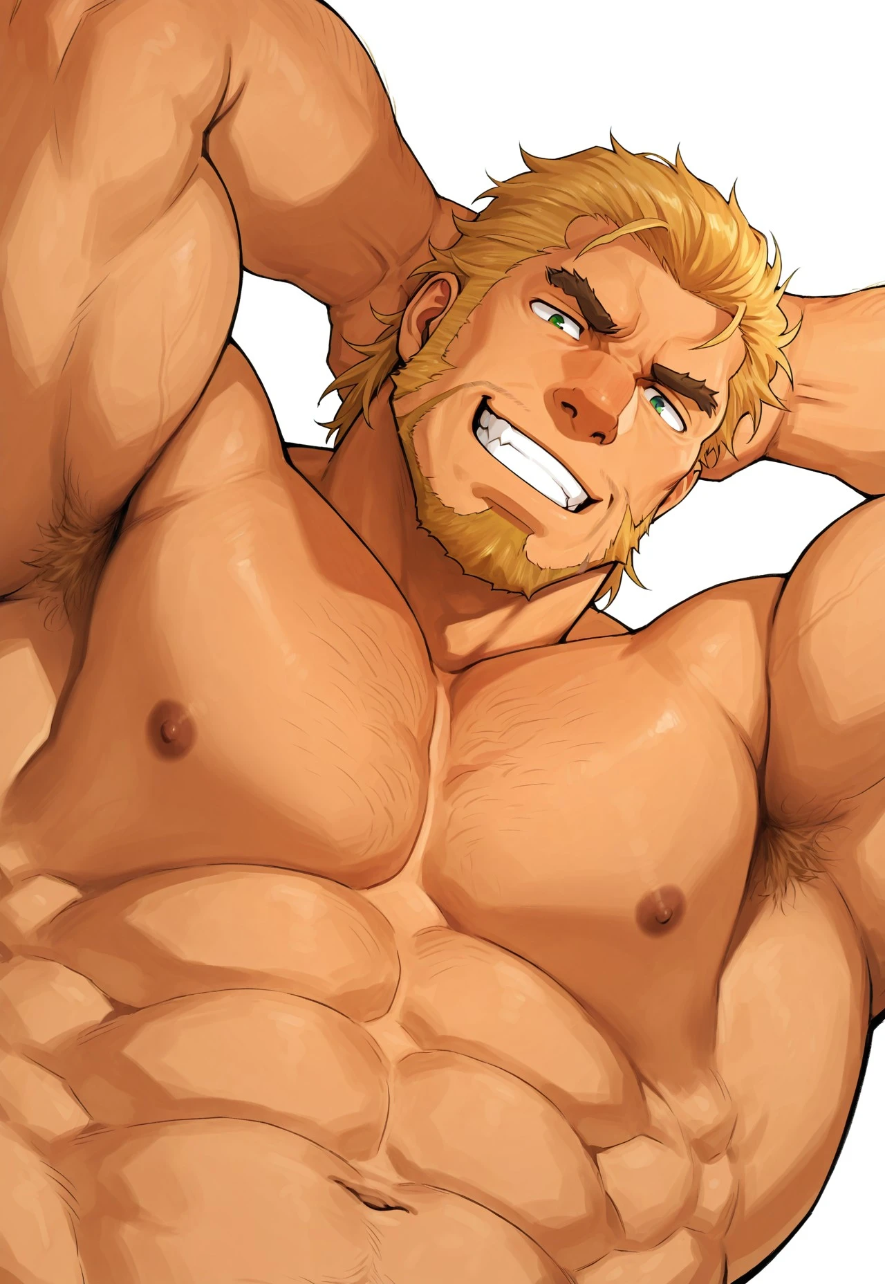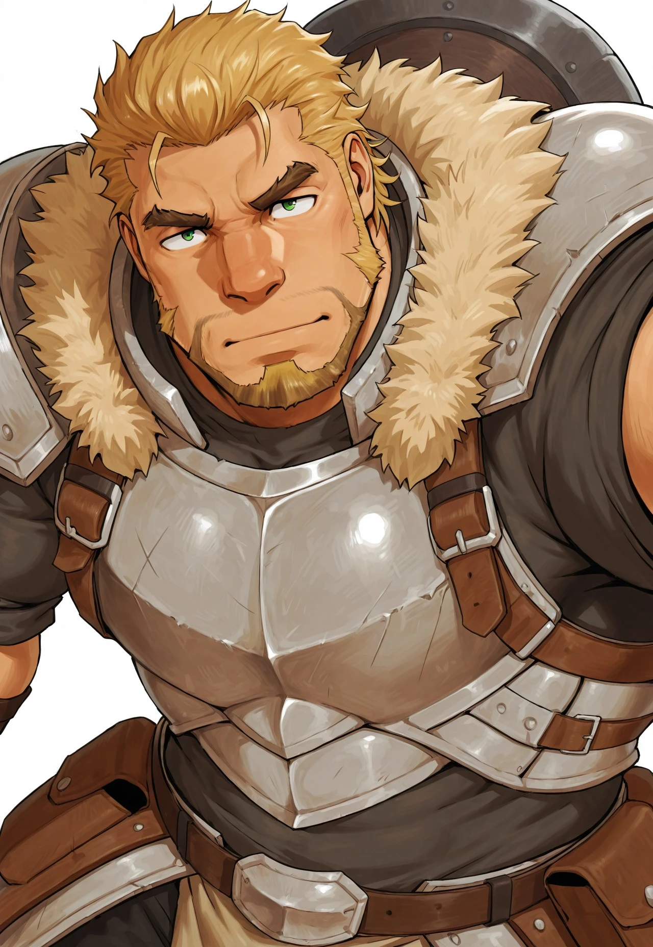 brut331d0s, mature male, 1boy, male focus, solo, facial hair, beard, sideburns, blonde hair, short hair, thick eyebrows, green eyes, bara,