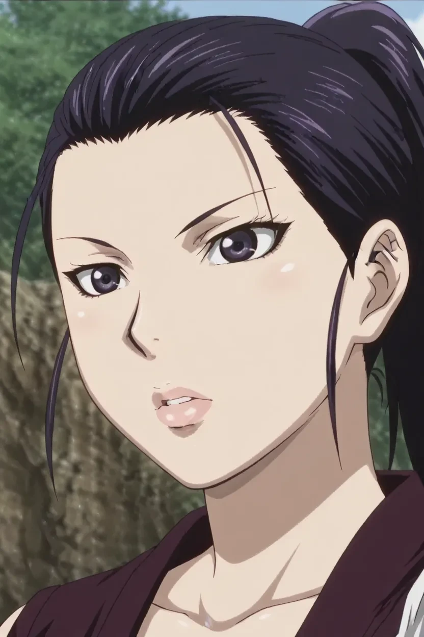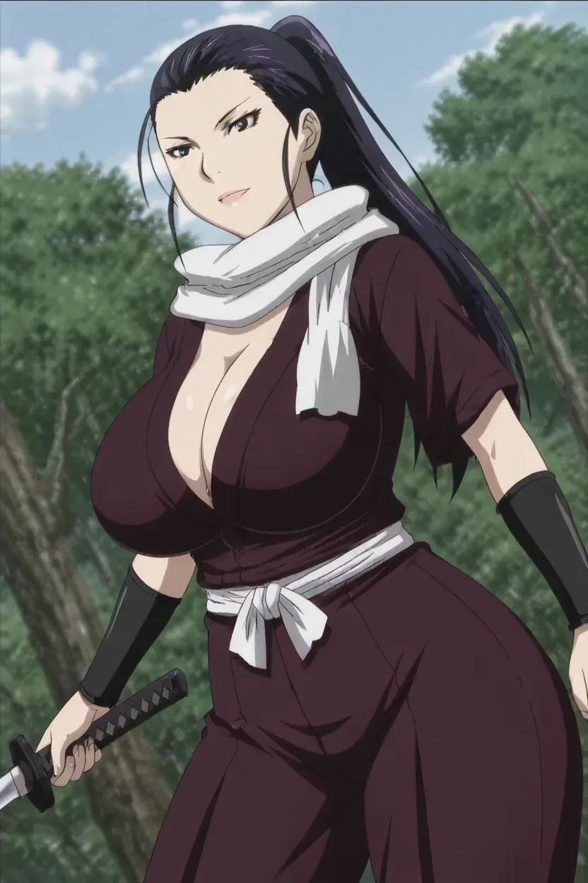 1girl, Kirino MANYUU (Manyuu Hikenchou), black_hair, ponytail, long hair, black_eyes, lips, glossy lips, thick lips, huge breasts, Manyuu Hikenchou_art_style, 4k, HD, excellent quality, high-resolution, clear animation