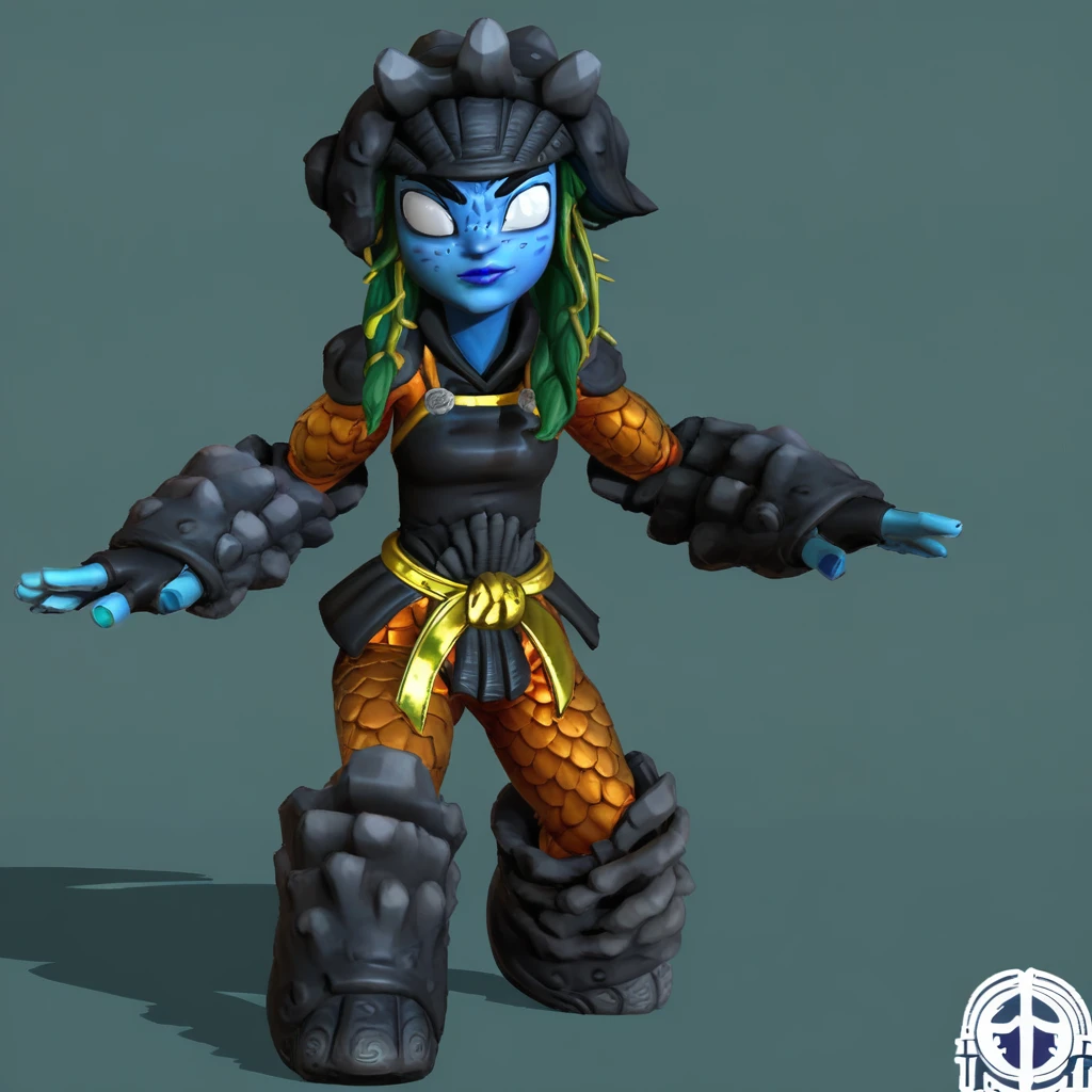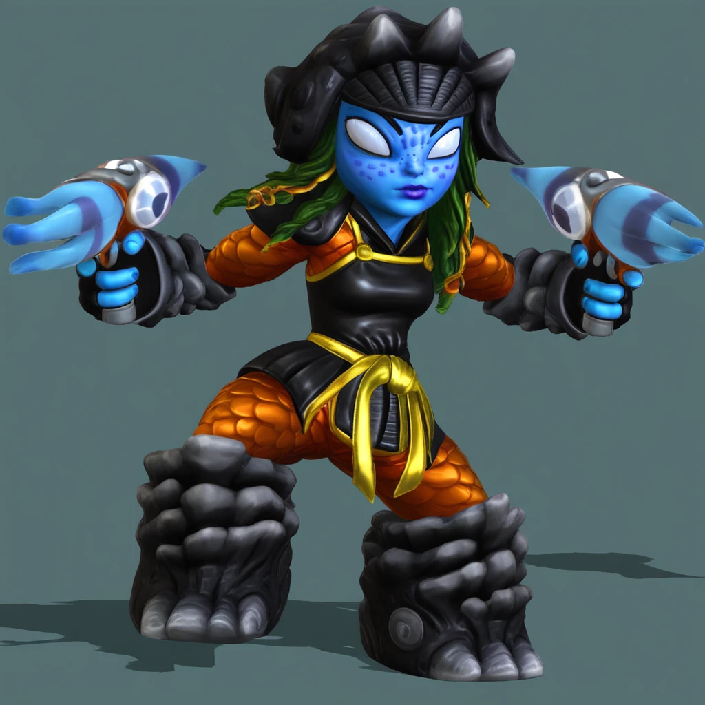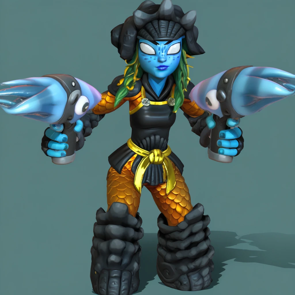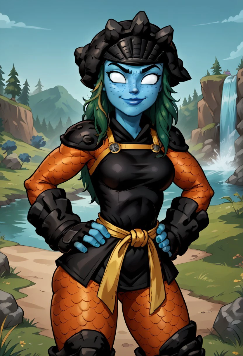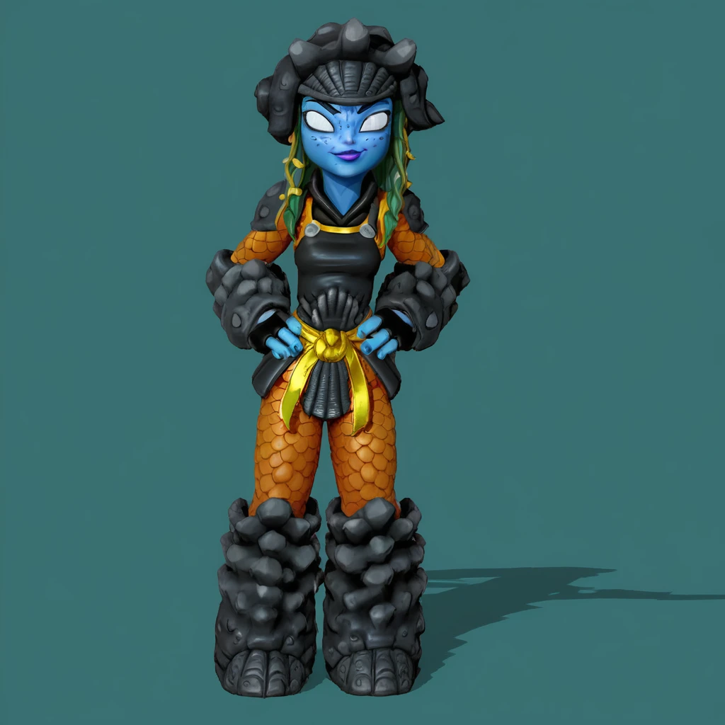 1girl, Skylanders, Tidepool, colored skin, blue skin, blue-skinned female, freckles, green hair, long hair, white eyes, no pupils, blue lips, black fingernails, black boots, black gloves, fingerless gloves, tied belt, belt knot, yellow belt, yellow shoulder straps, black helmet, helmet, headgear, black headgear, bodysuit, scaled bodysuit, orange bodysuit, orange scales, rocky boots, rocky gloves, rocky helmet,