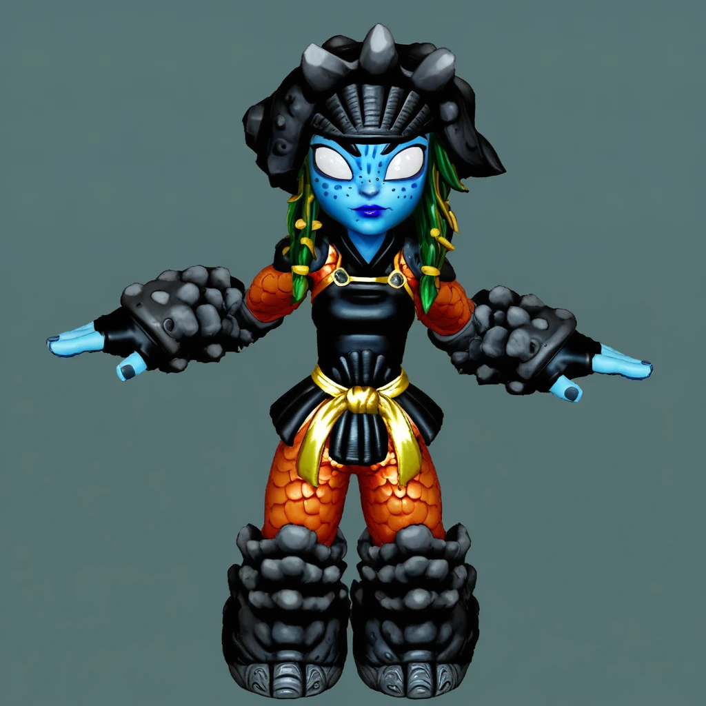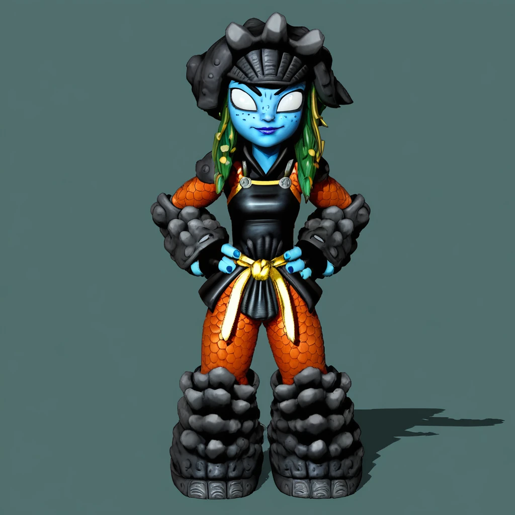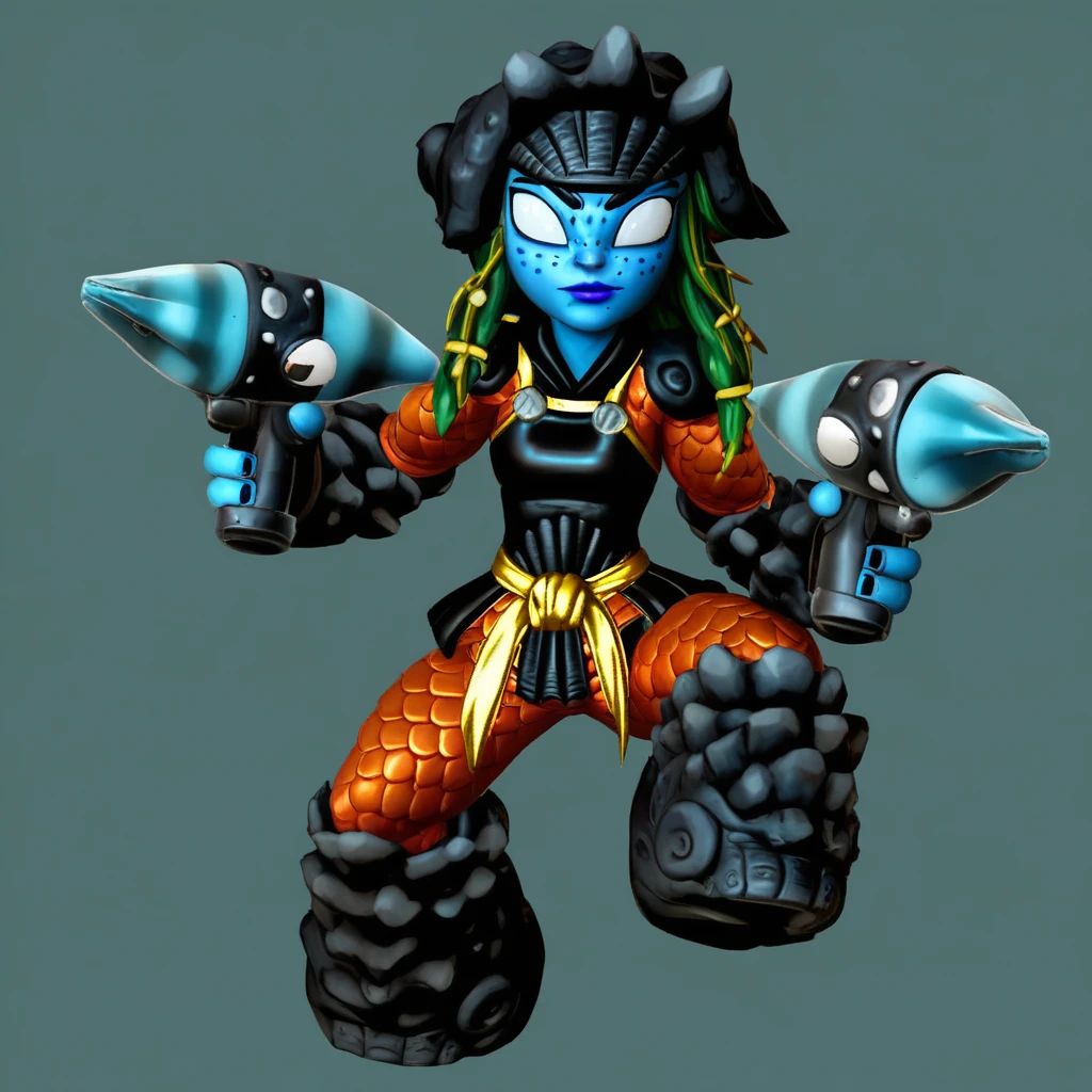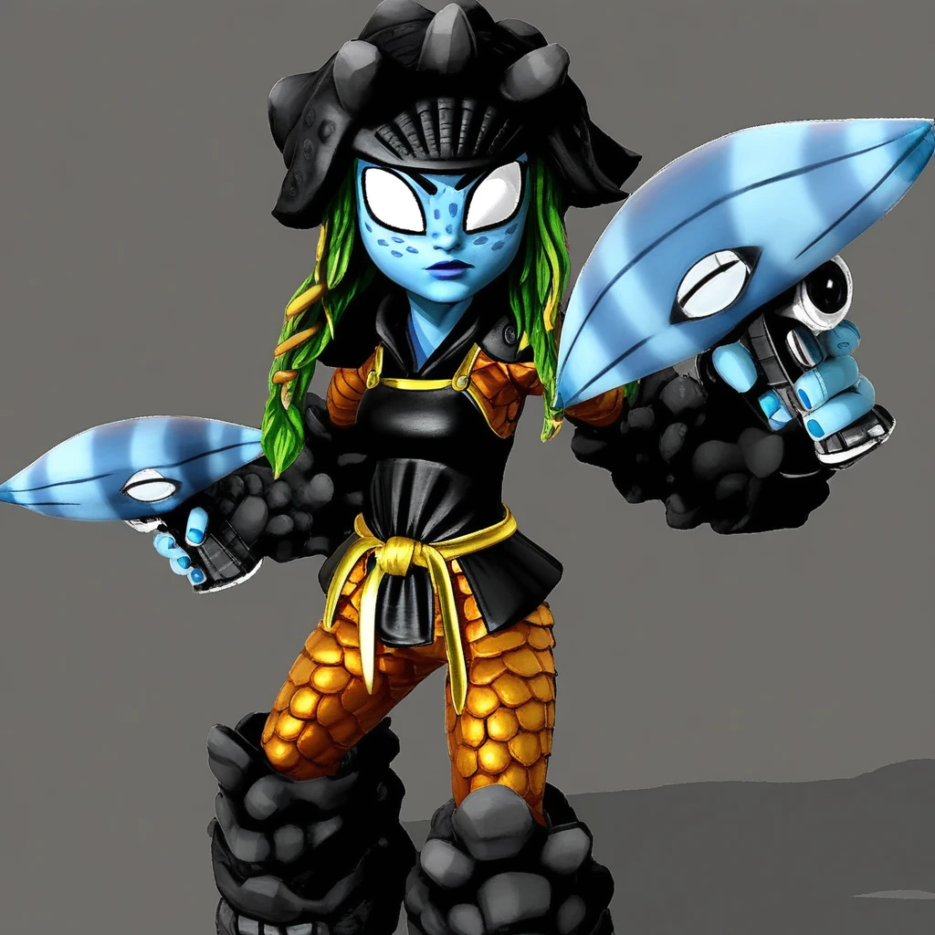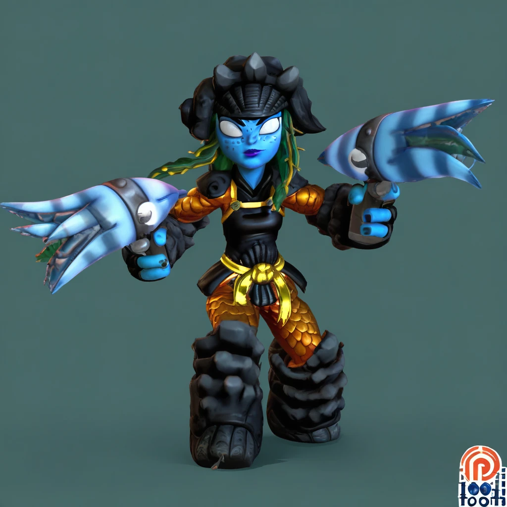 1girl, Skylanders, Tidepool, colored skin, blue skin, blue-skinned female, freckles, green hair, long hair, white eyes, no pupils, blue lips, black fingernails, black boots, black gloves, fingerless gloves, tied belt, belt knot, yellow belt, yellow shoulder straps, black helmet, helmet, headgear, black headgear, bodysuit, scaled bodysuit, orange bodysuit, orange scales, rocky boots, rocky gloves, rocky helmet,