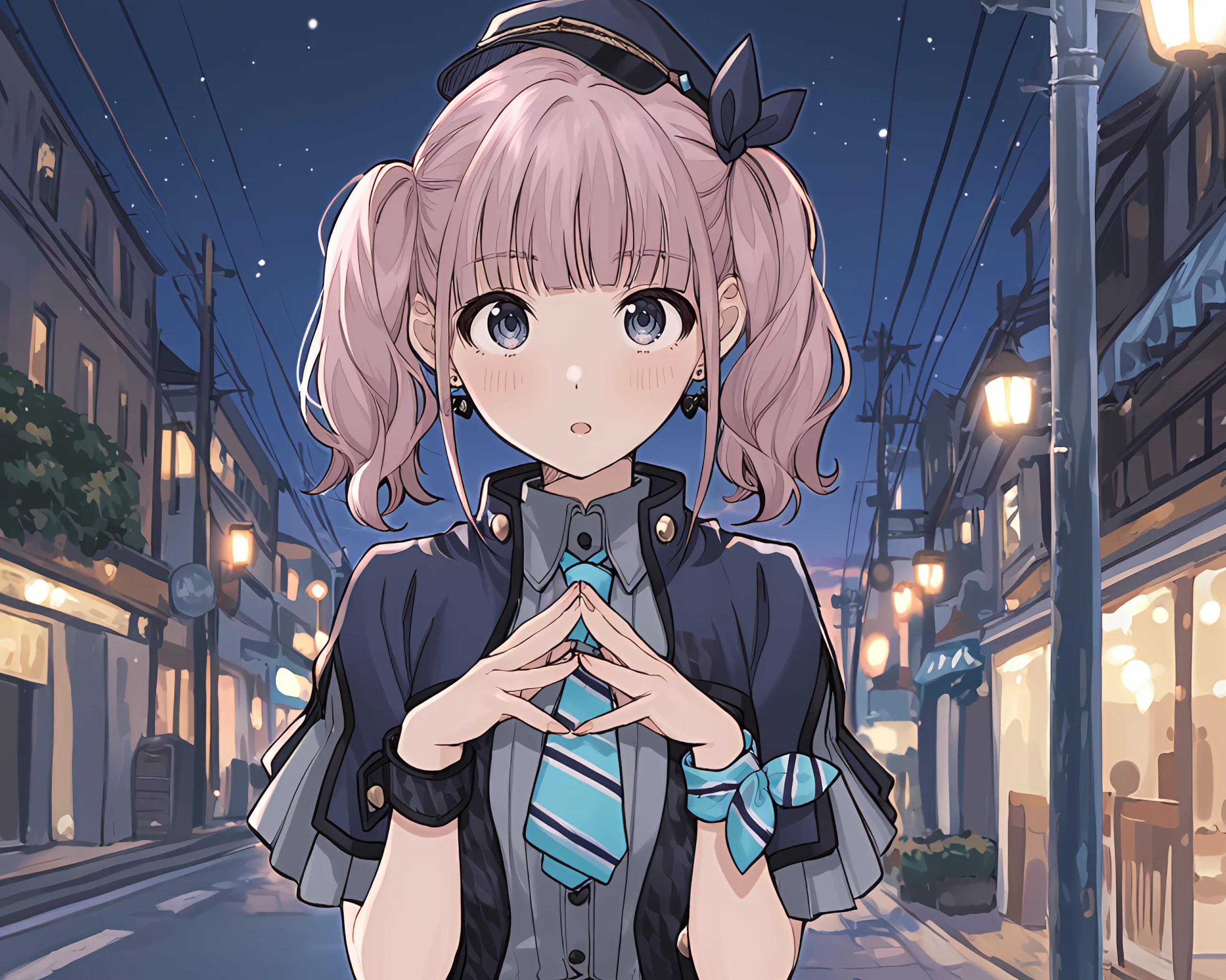 1girl, hinacry2, solo, qhina3 wristband, qhina3 kneehighs, qhina3 shirt, qhina3 skirt, qhina3 jacket, qhina3 footwear, qhinava3 hat, twintails, hair ribbon, earrings