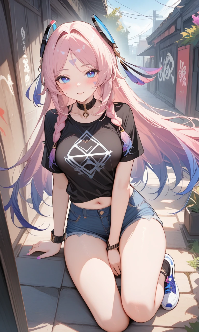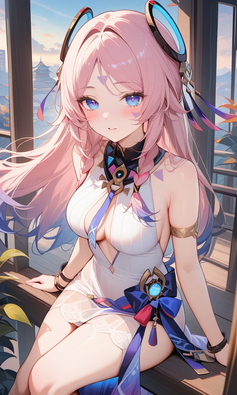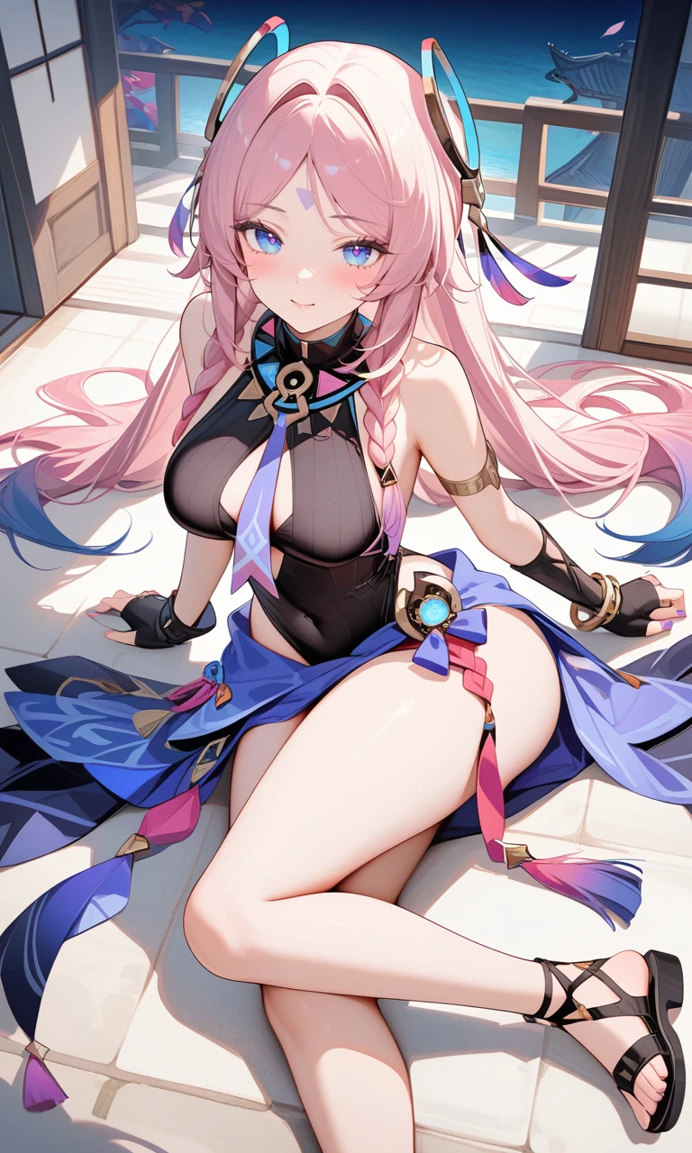 tj_citlali,long hair,double braid,blue eyes,bright pupils,face mark,ring hair ornament,lavender eyelashes,gradient hair,multicolored hair,pink hair,purple hair,hair intakes,parted bangs,