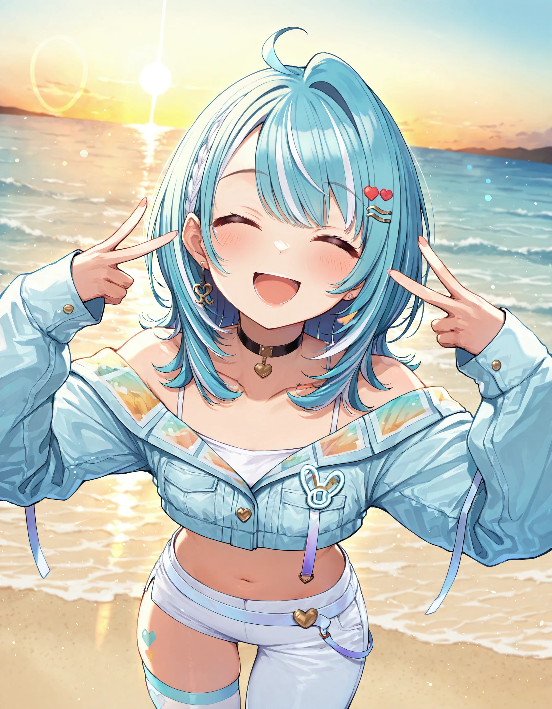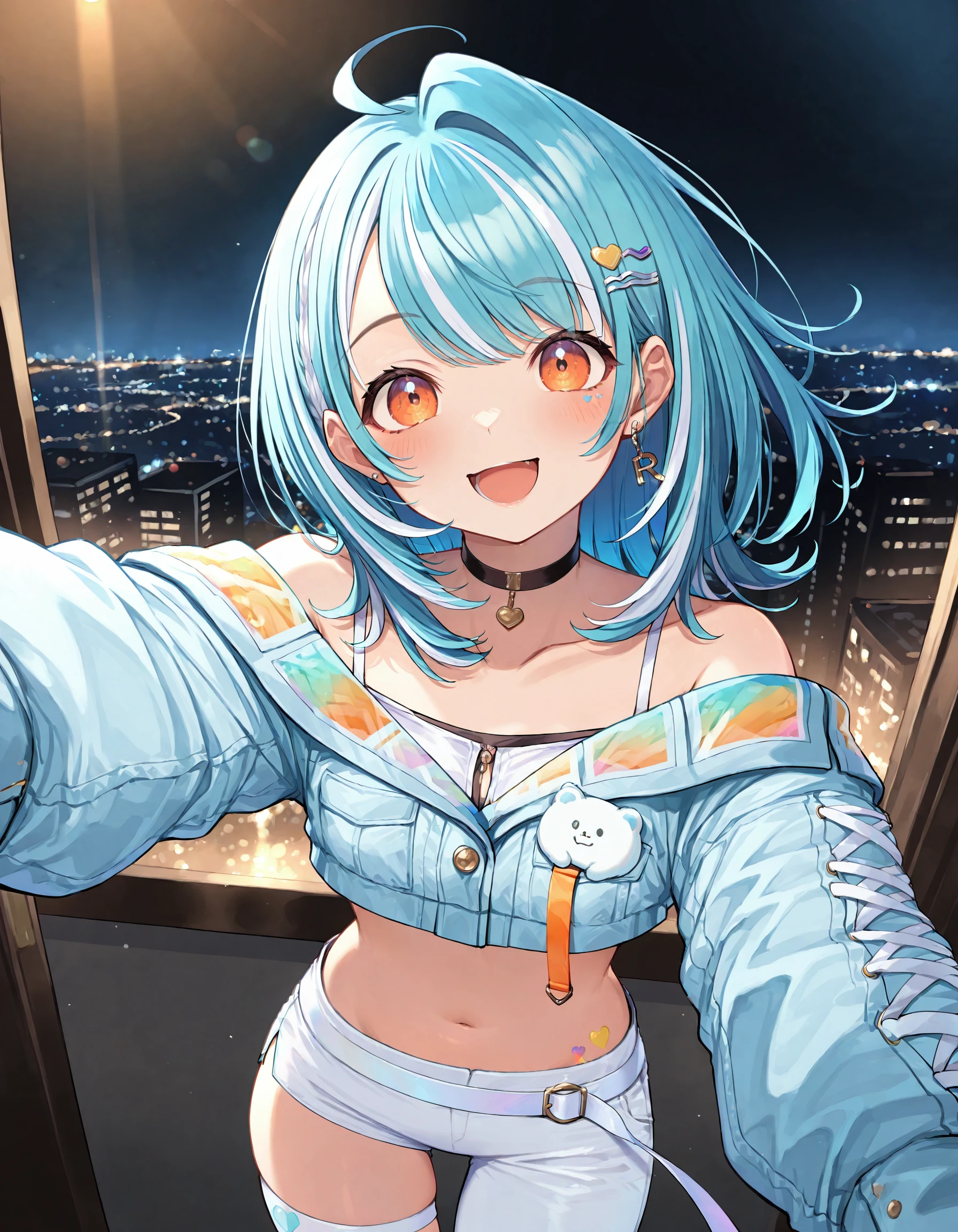 shiranami-ramune,virtual youtuber,blue hair,multicolored hair,white streaks,streaked hair,medium hair,bangs,ahoge,orange eyes,hair ornament,hairclip,heart,crop top,midriff,navel,collarbone,cropped jacket,blue jacket,off shoulder,long sleeves,sleeves past wrists,white pants,pants,single pantsleg,asymmetrical legwear,