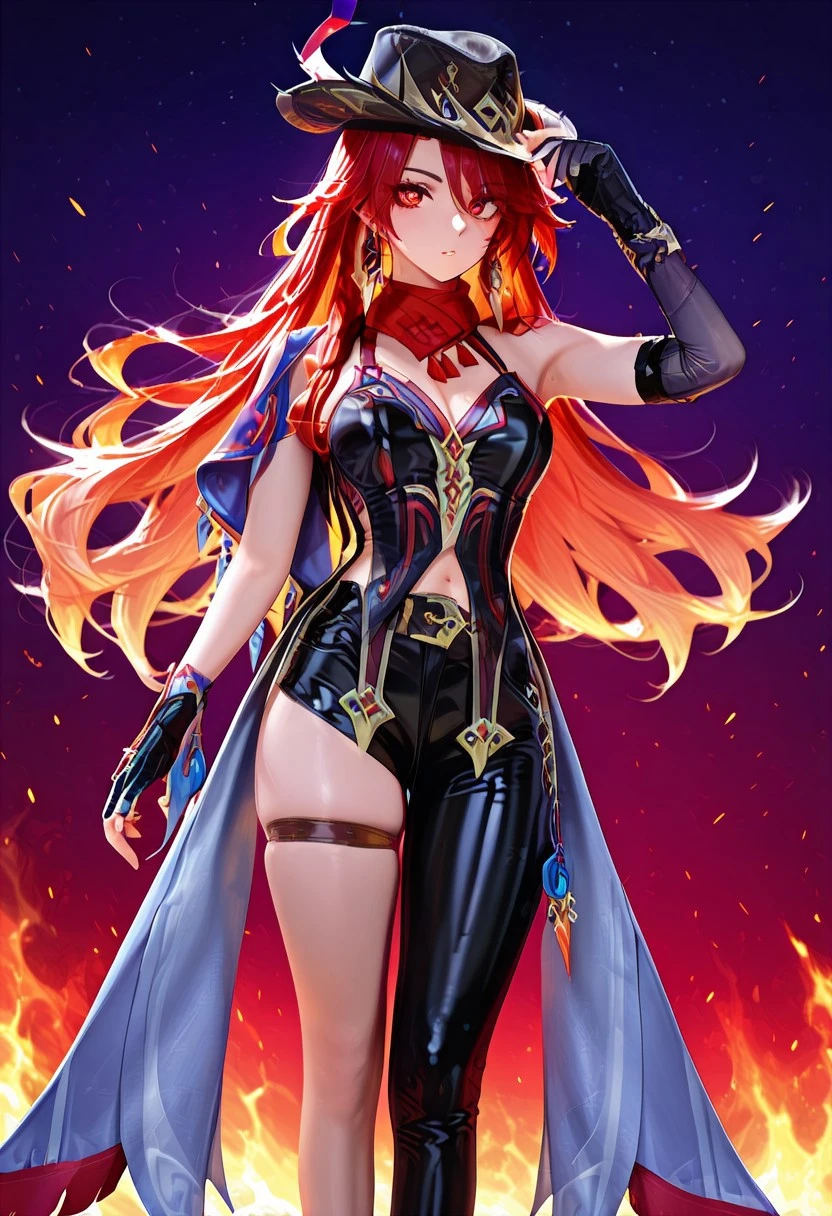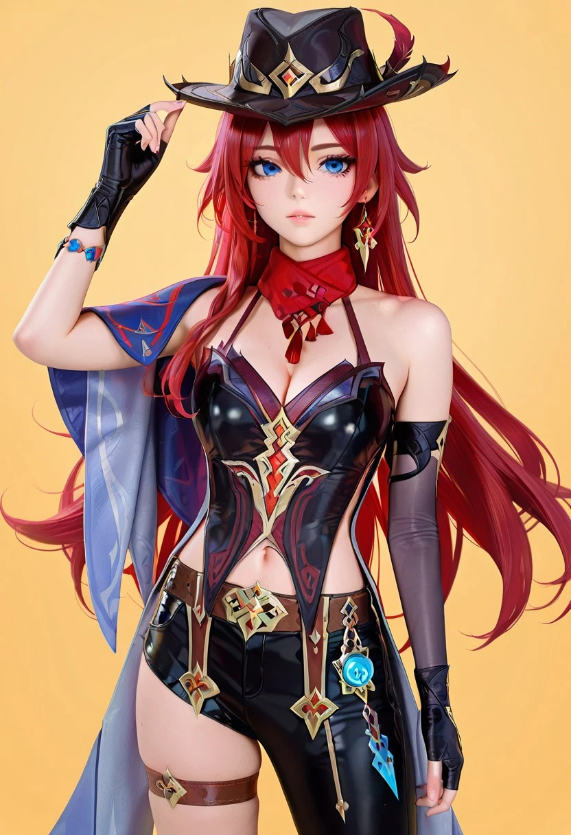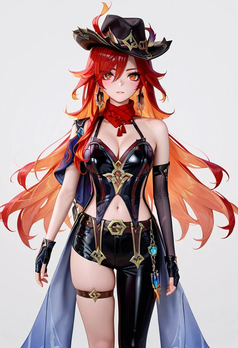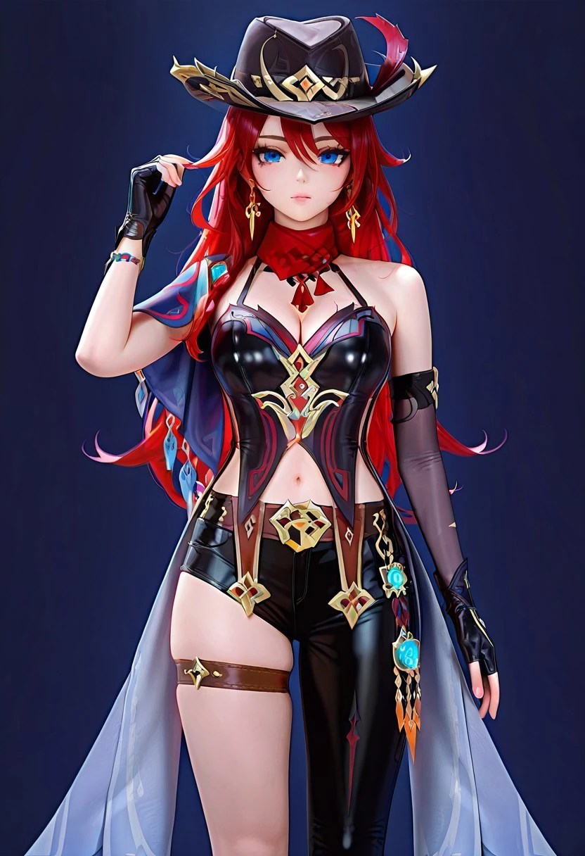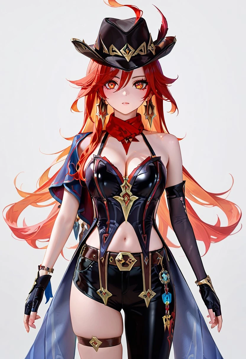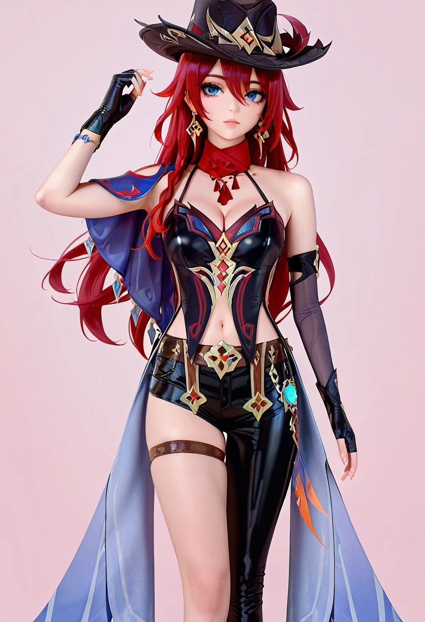 chscclstyl, shorts,single leg pant, hat, cleavage, jewelry, bare shoulders, earrings, , black gloves, belt, fingerless gloves, scarf, black headwear, thigh strap, red scarf, hat feather, asymmetrical clothes
