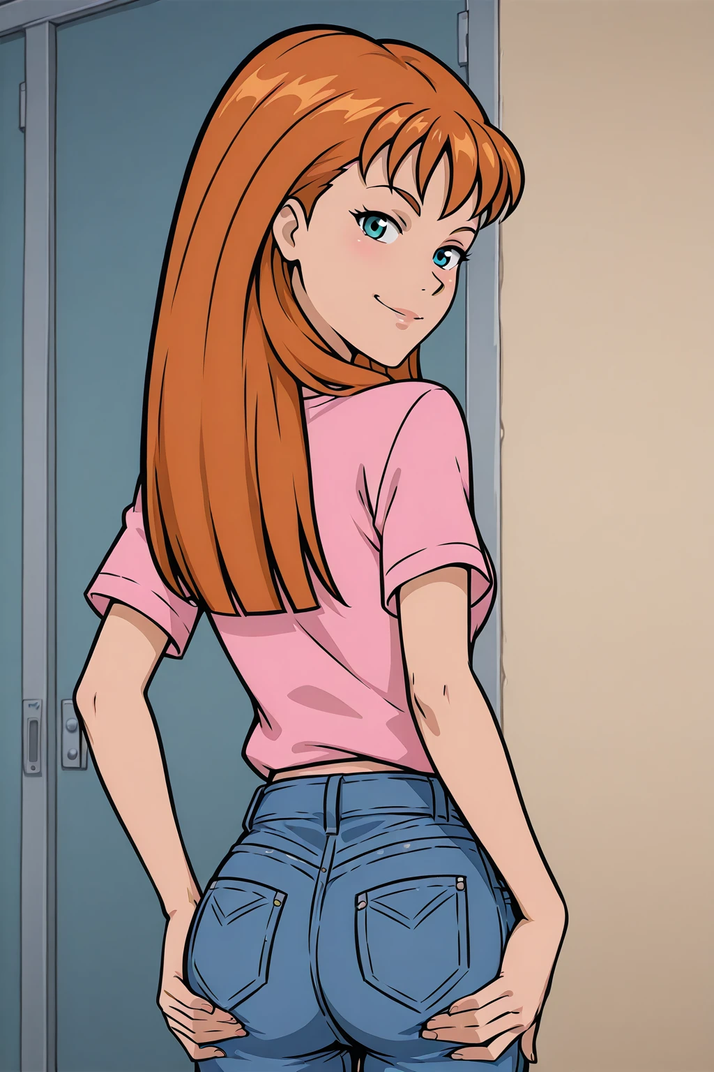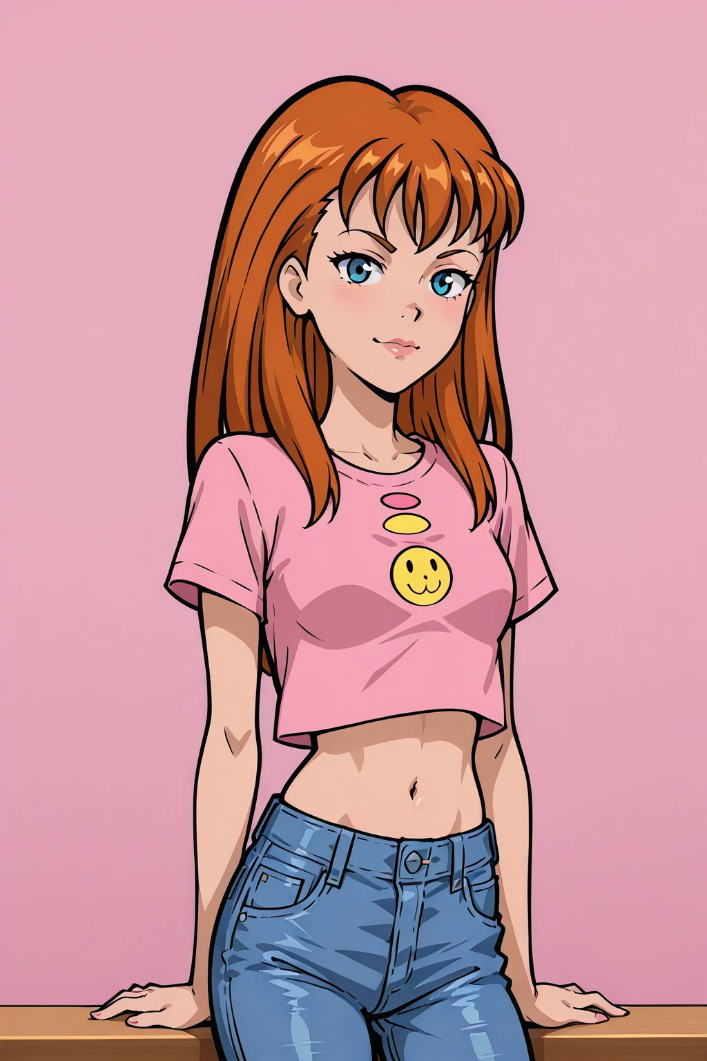 Outfit: pink shirt, jeans, brown shoes,