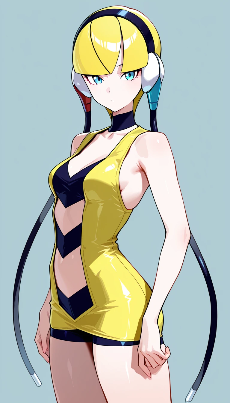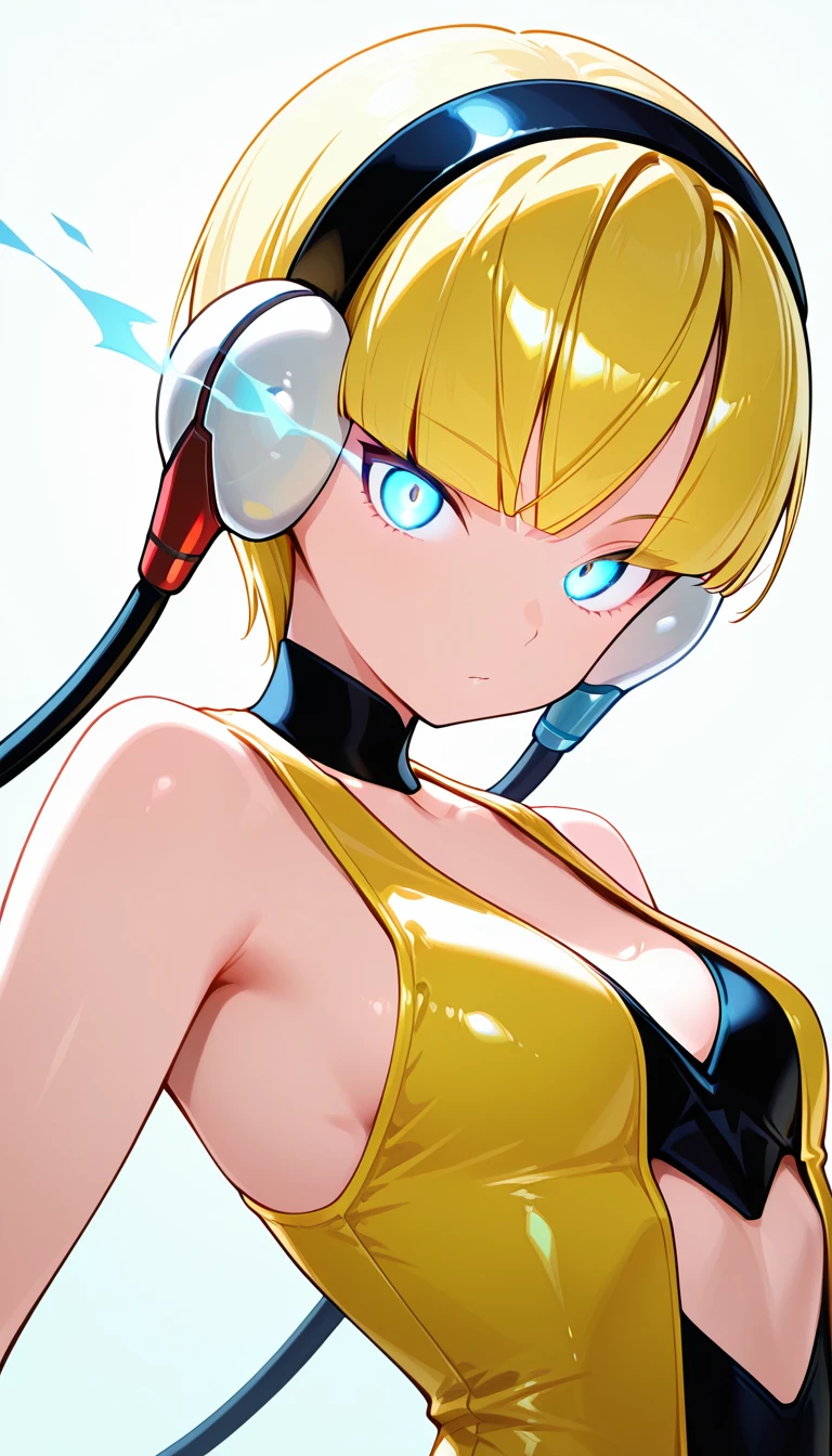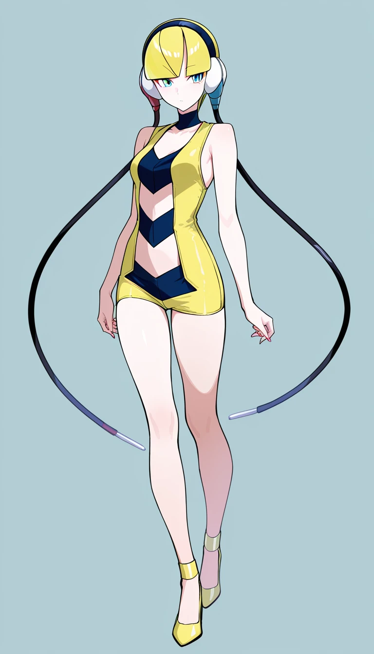 elesa, headphones, blue eyes, blonde hair, blunt bangs, short hair, outfit1