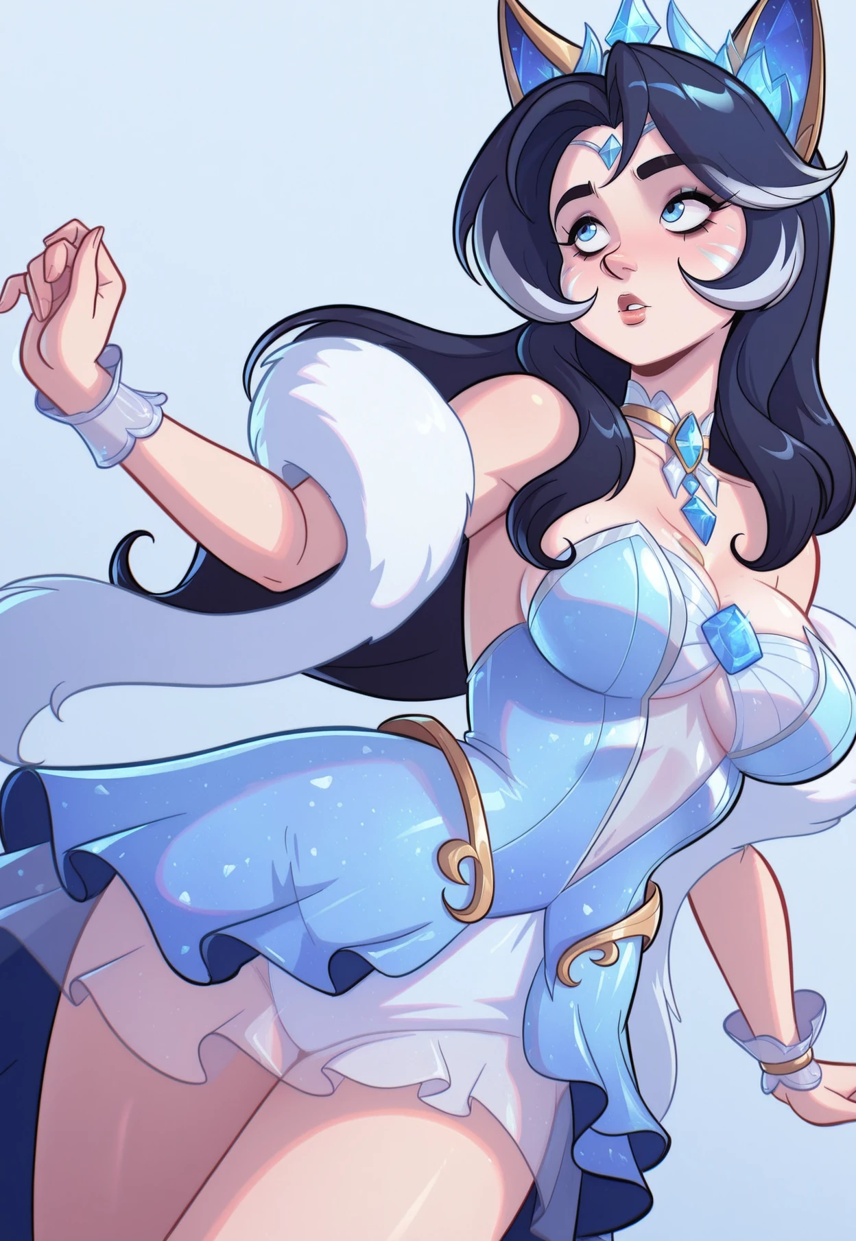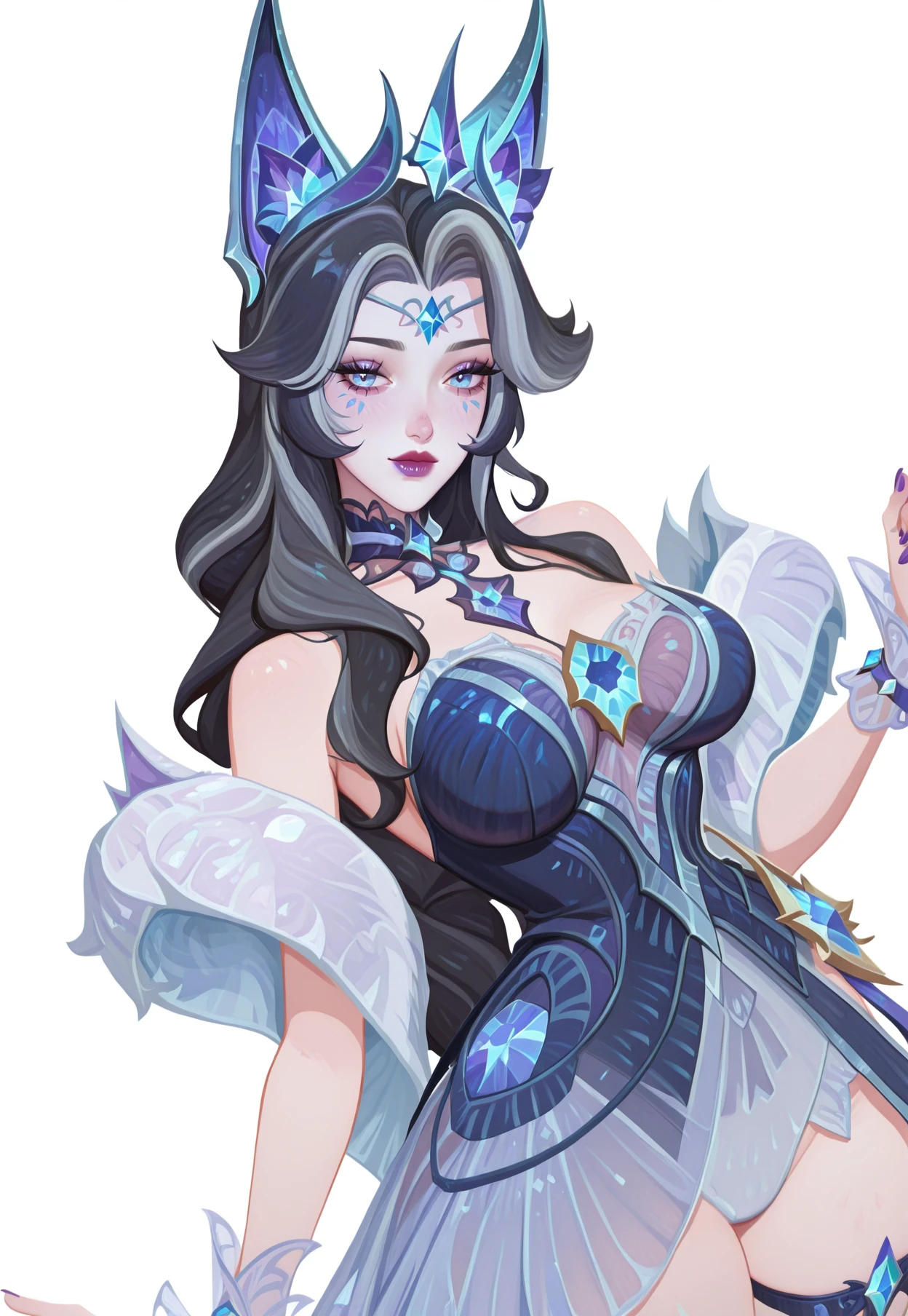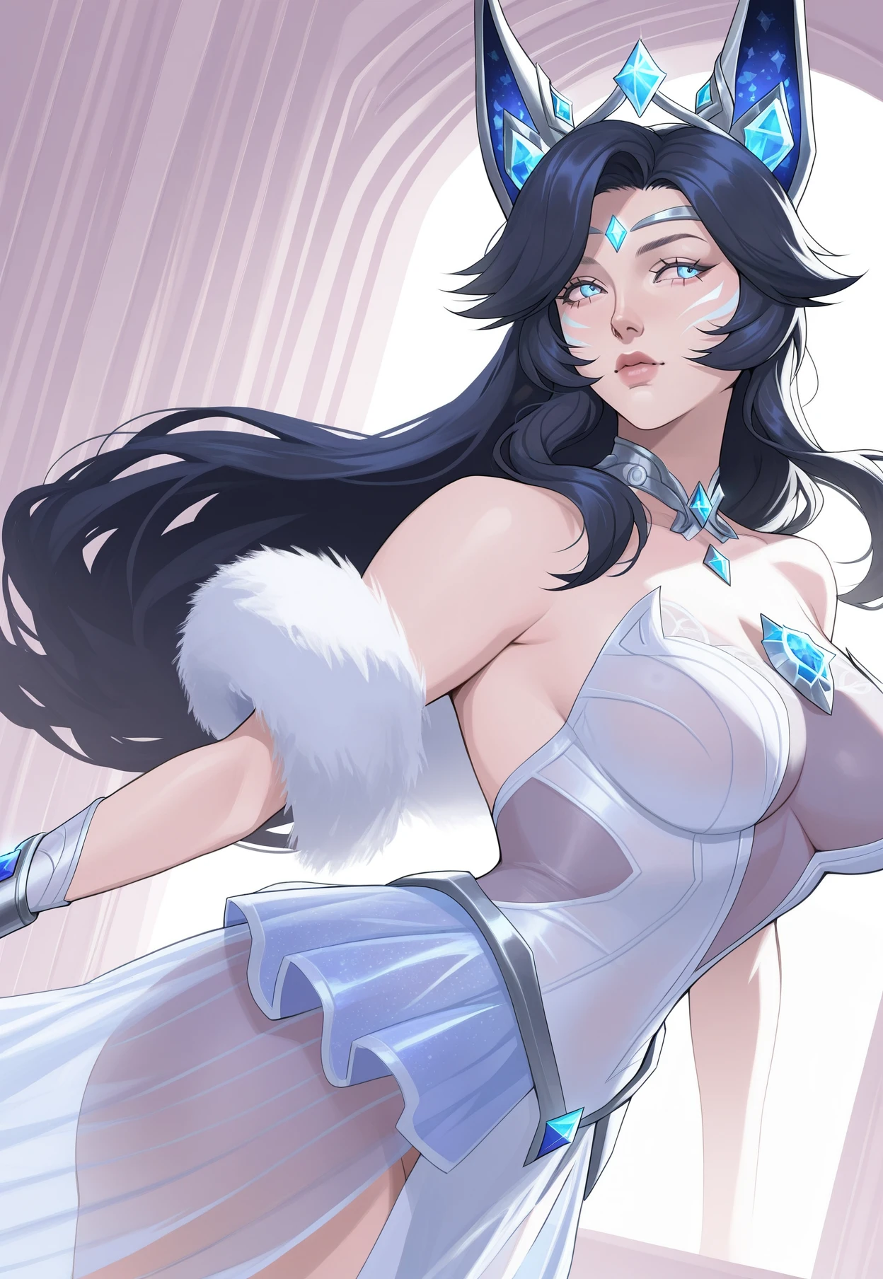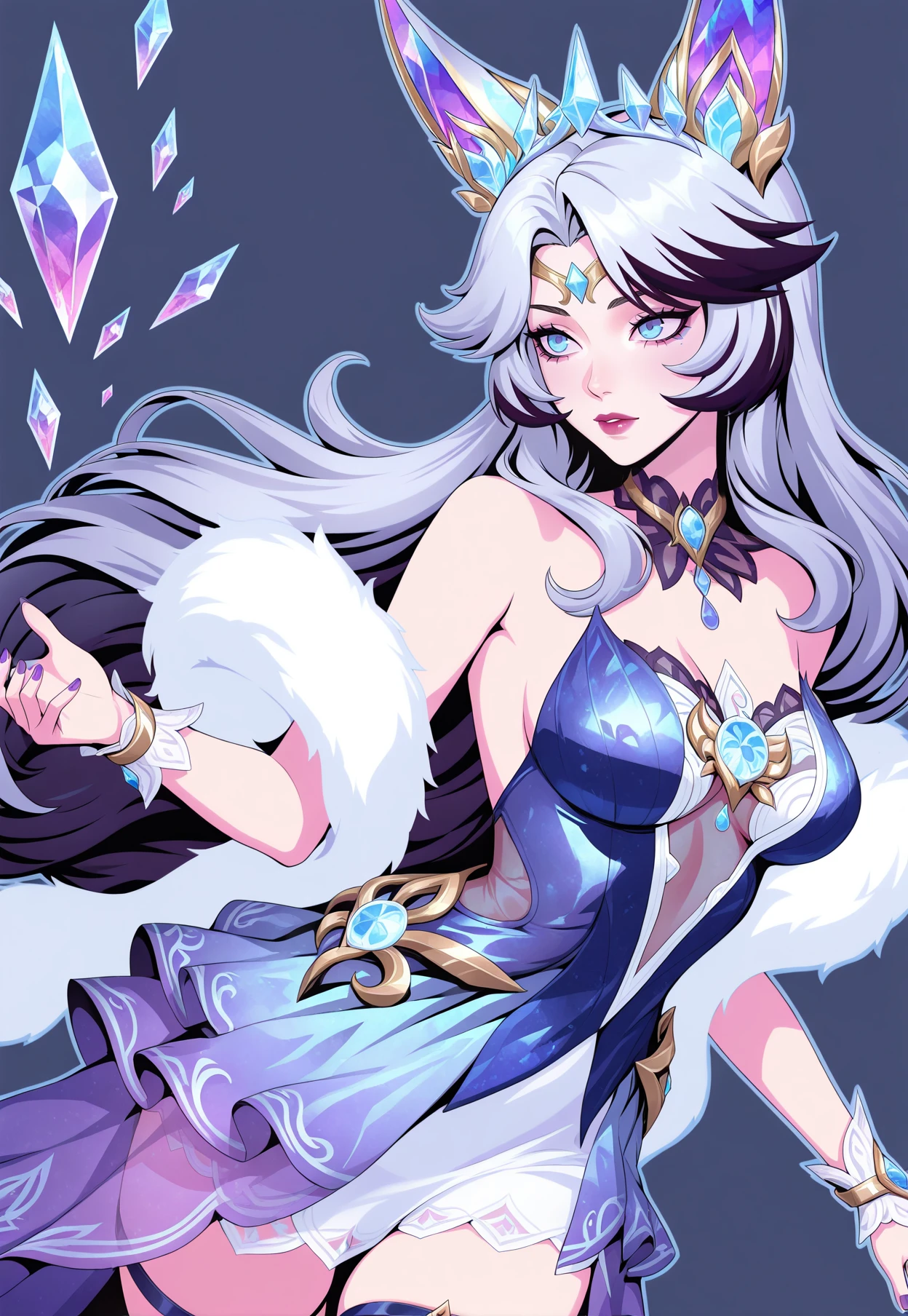 CR_Ahri,dark hair, silver hair, blue eyes, crystal tiara, fox ears, crysral ears, white fur shawl,translucent dress, layered skirt, blue and white dress, gold trim, crystal chest ornament, crystal choker, arm bracelet, thigh garter, long purple nails