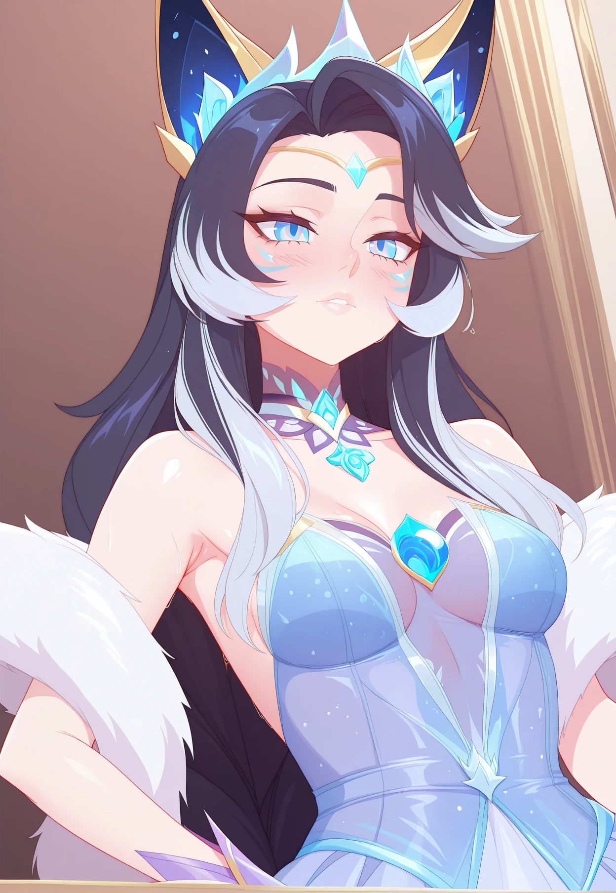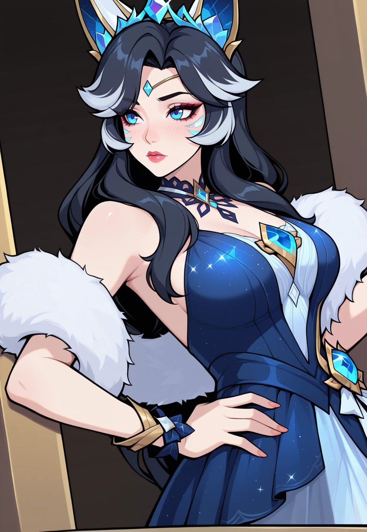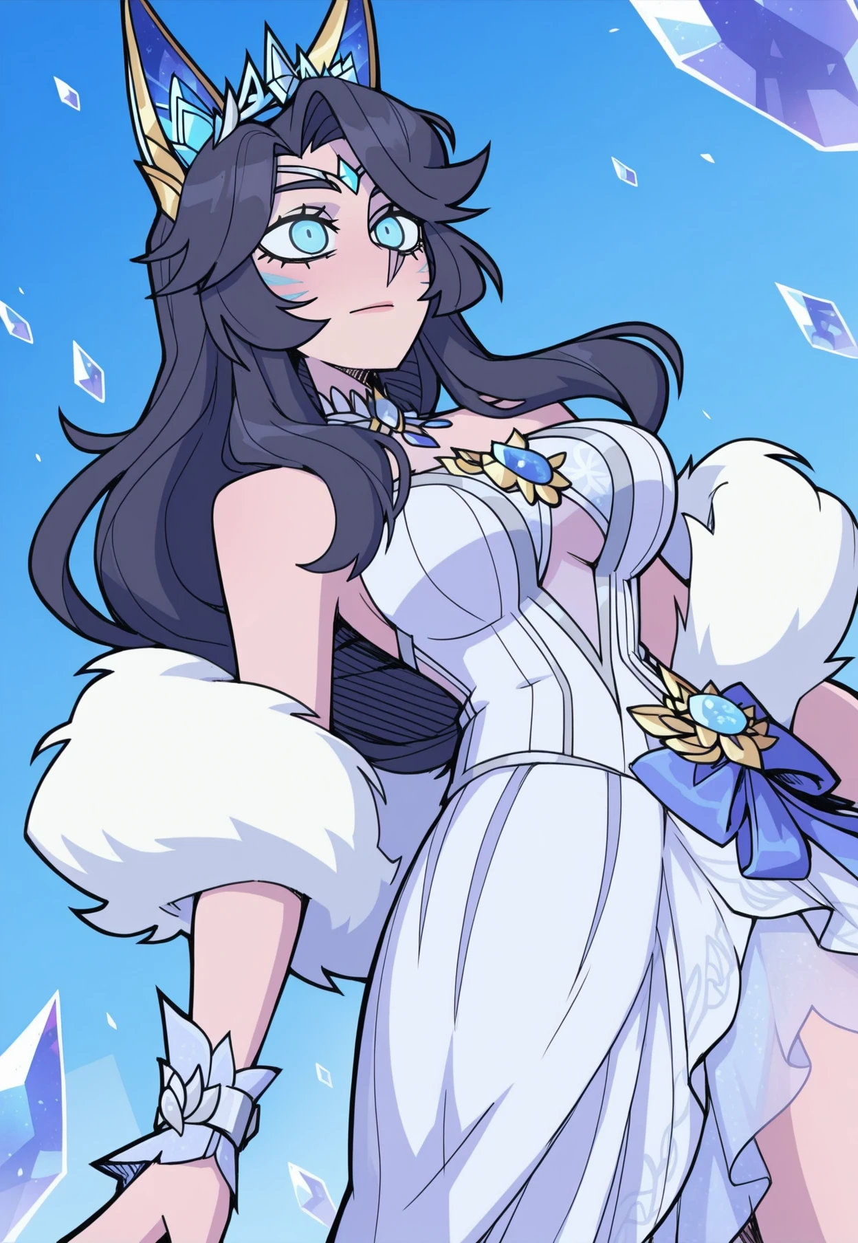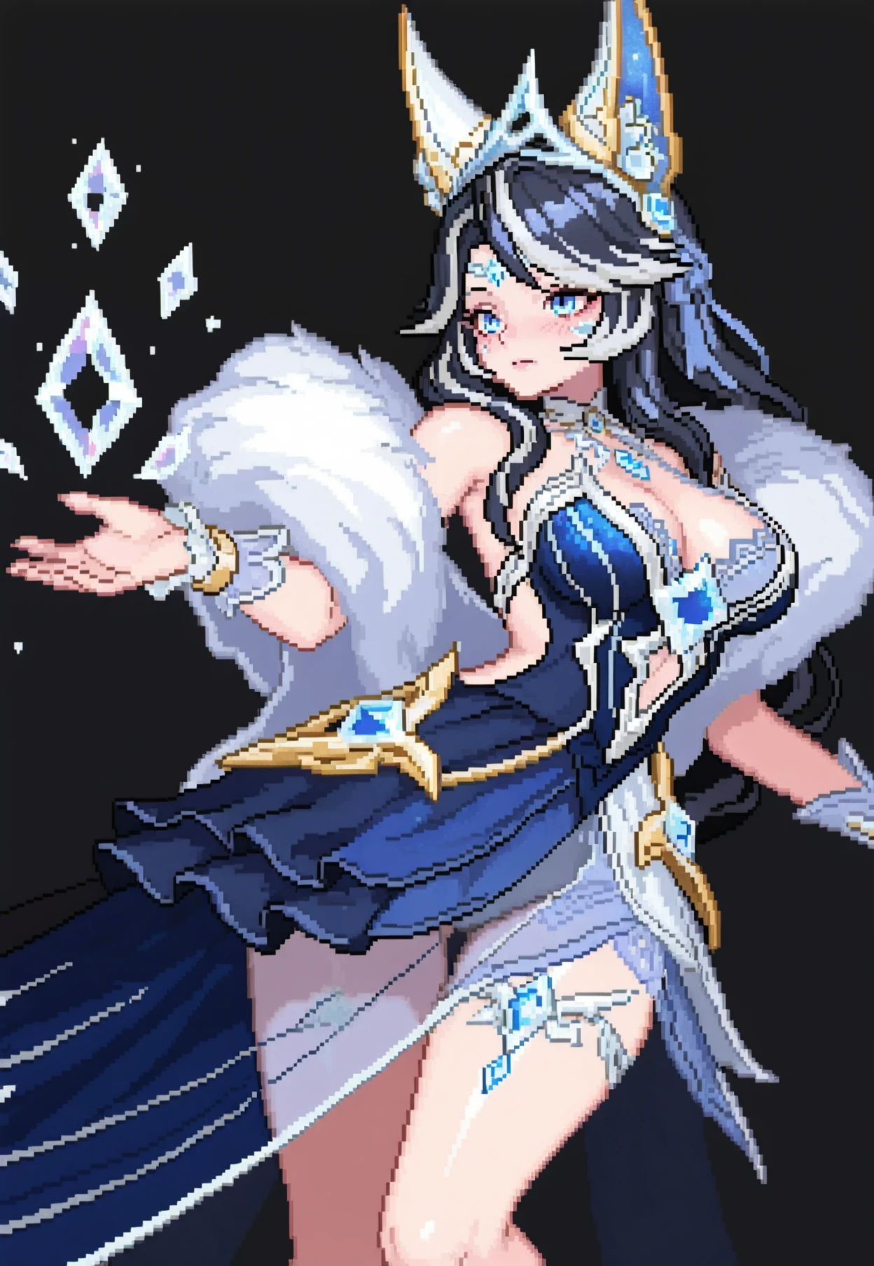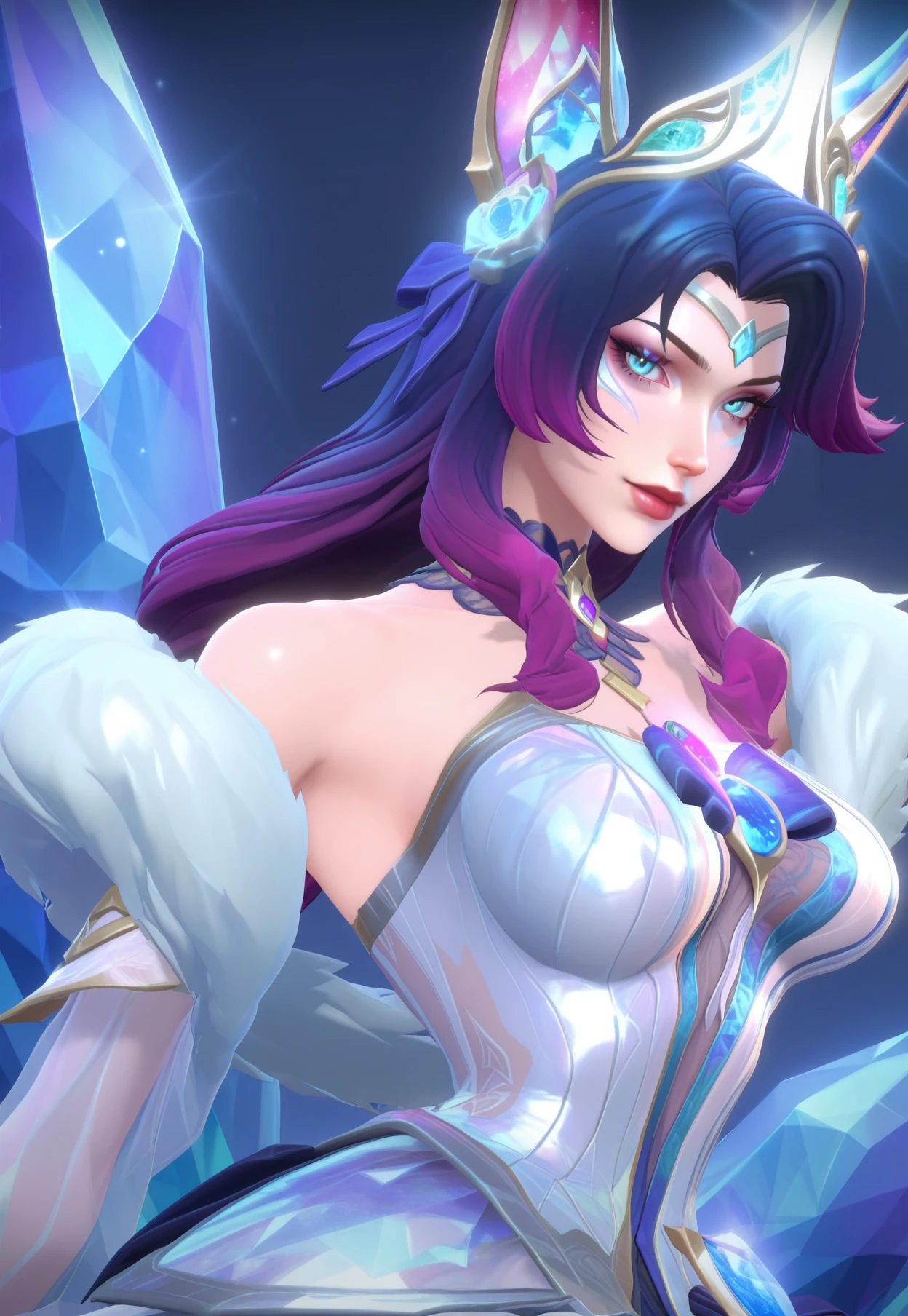 CR_Ahri,dark hair, silver hair, blue eyes, crystal tiara, fox ears, crysral ears, white fur shawl,translucent dress, layered skirt, blue and white dress, gold trim, crystal chest ornament, crystal choker, arm bracelet, thigh garter, long purple nails