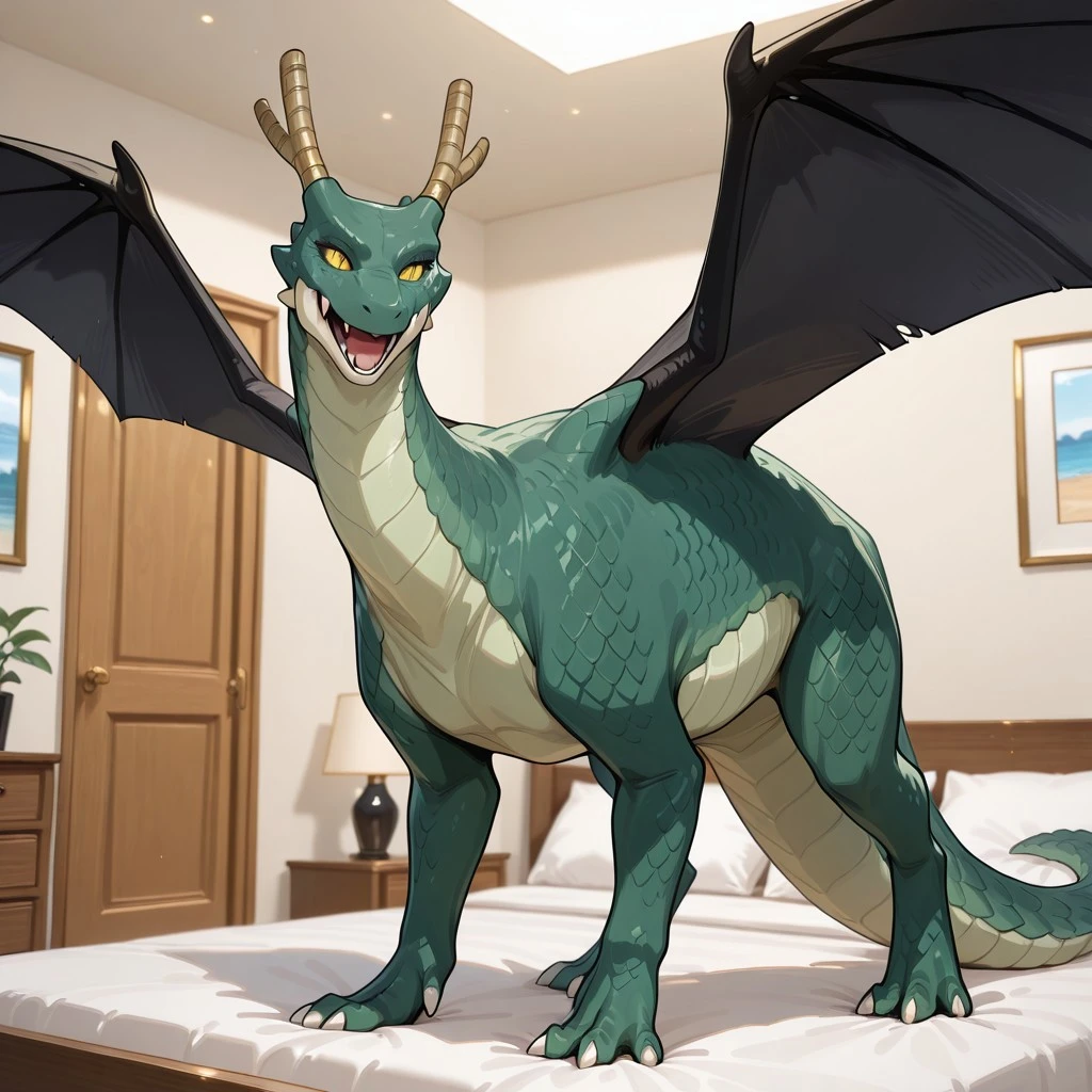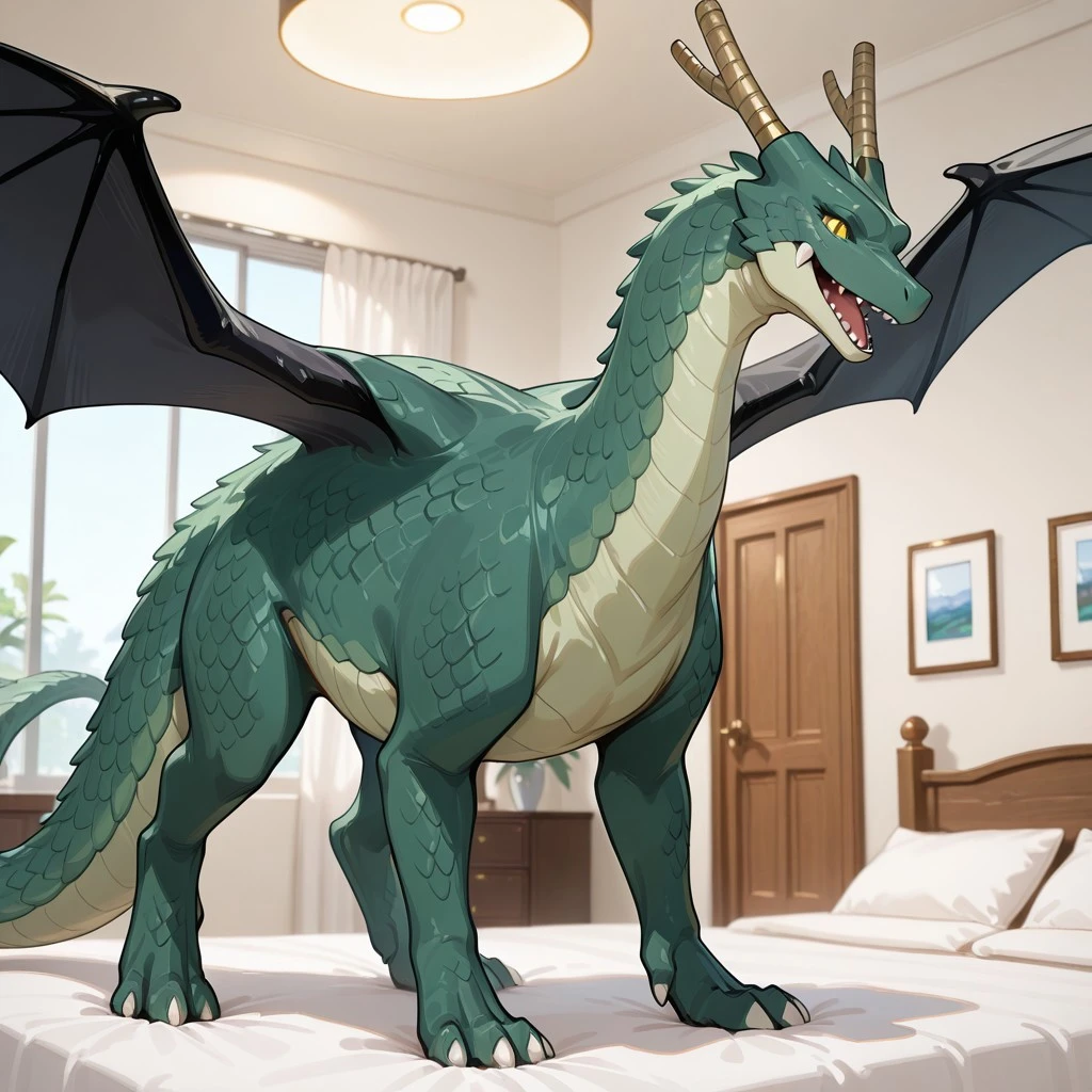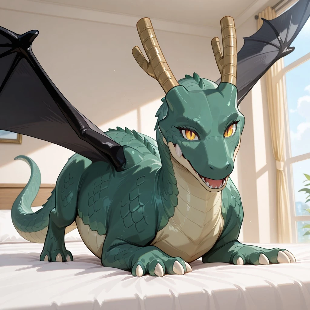 Additional prompts: dragon, green scales, black wings, horns, tail, claws, female, 1girl, yellow eyes, slit pupils
