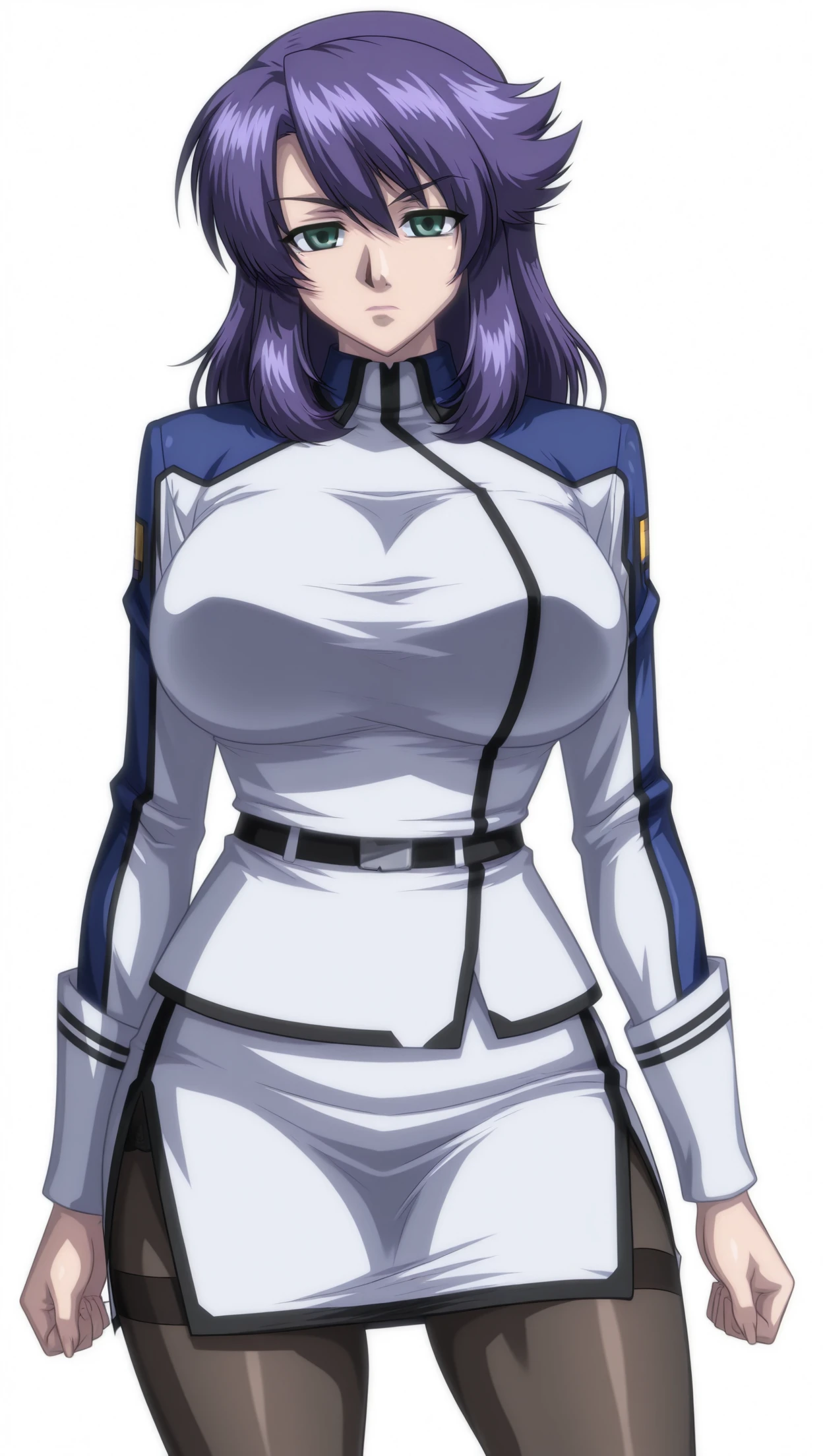 anime coloring, masterpiece, best quality, amazing quality, rieribishop, 1girl, long hair, purple hair, green eyes, ???????????, jacket, long sleeves, belt, skirt, pantyhose, solo, pose, standing, looking at viewer, from front, ((((white background, simple background))))