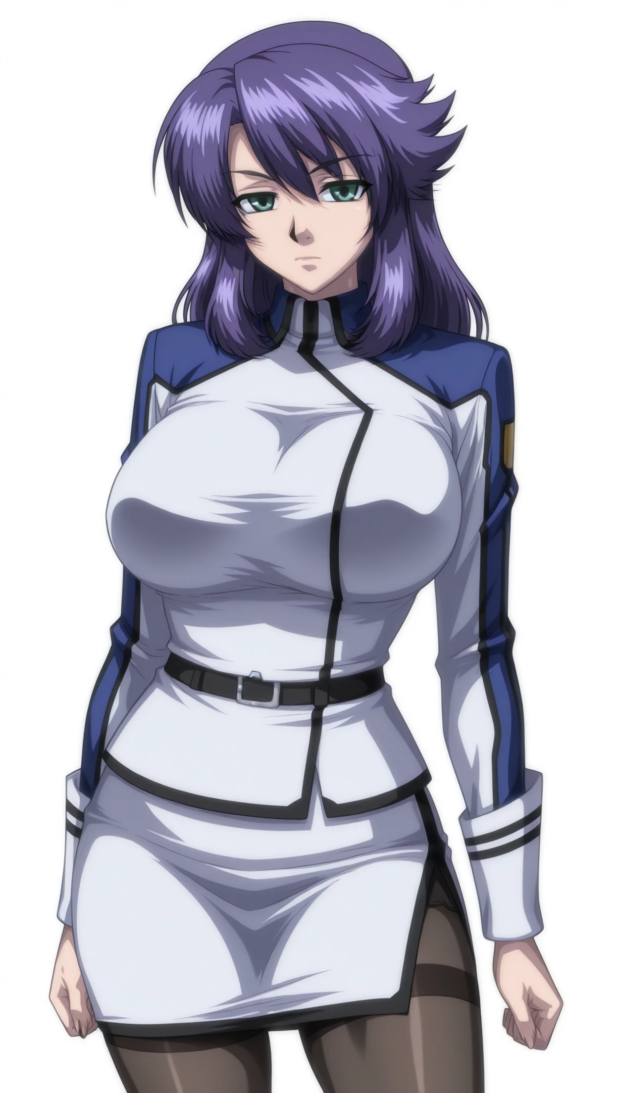 rieribishop, 1girl, long hair, purple hair, green eyes, big breasts, jacket, long sleeves, belt, skirt, pantyhose