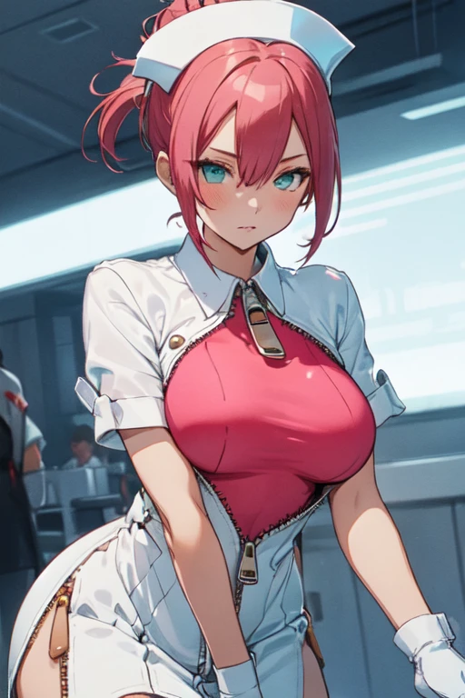 Garn3tRumble, 1girl, solo, short hair, large breasts, white gloves, white dress, pink hair, short sleeves, red hair, open clothes, aqua eyes, white headwear, short dress, side slit, zipper, folded ponytail, nurse cap, collared dress, unzipped, leotard under clothes, pink leotard, open dress