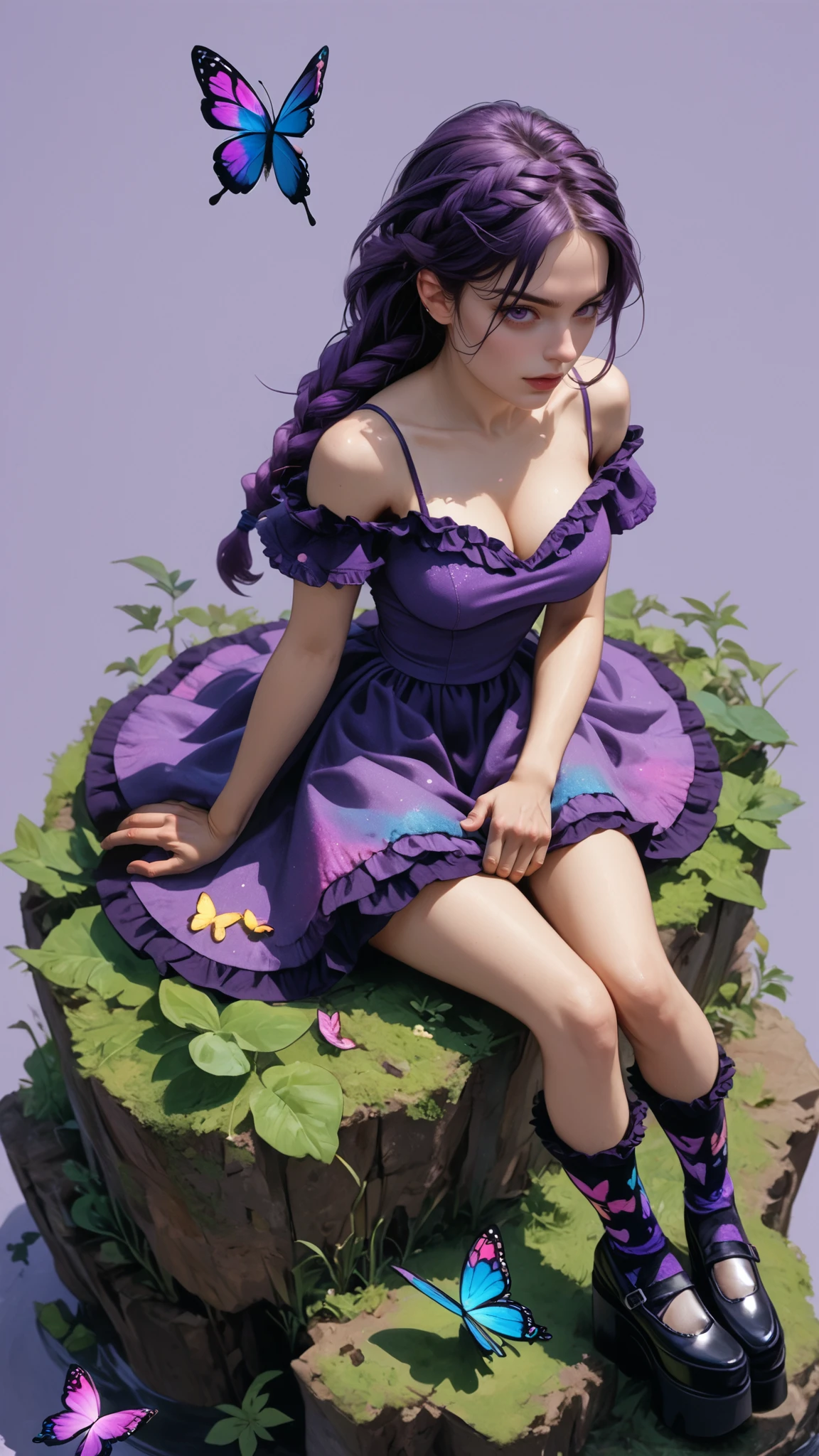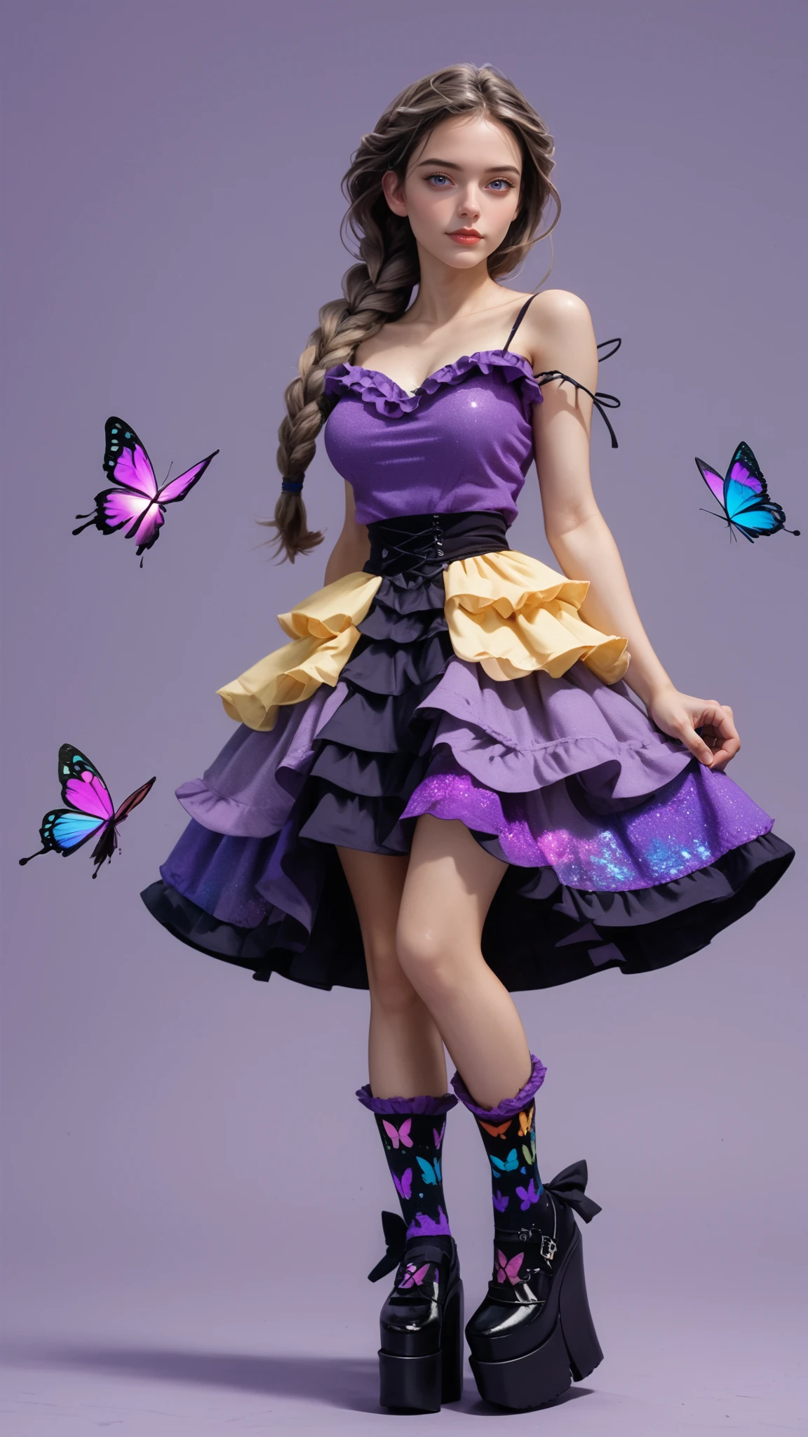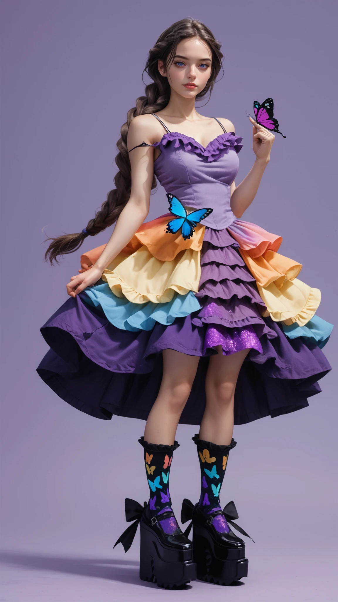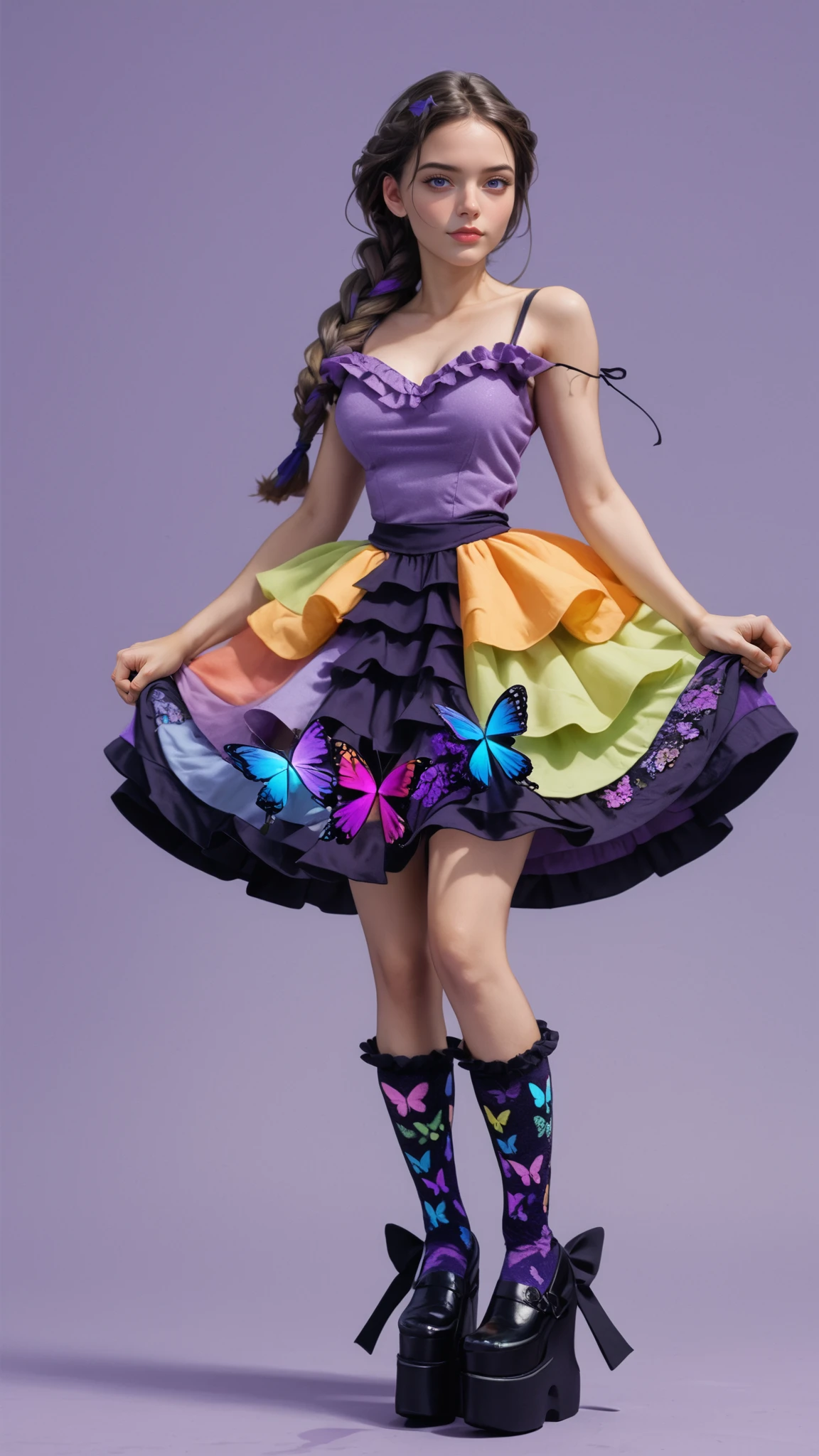 reij-papilio, purple dress, hip-length skirt, black knee-high ruffled socks, black platform shoes, butterfly details