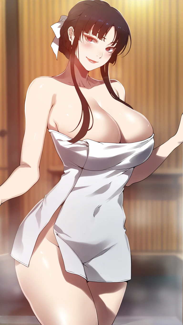 mrs h4n, red eyes, black hair, sidelocks, long hair,