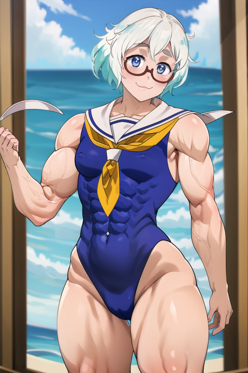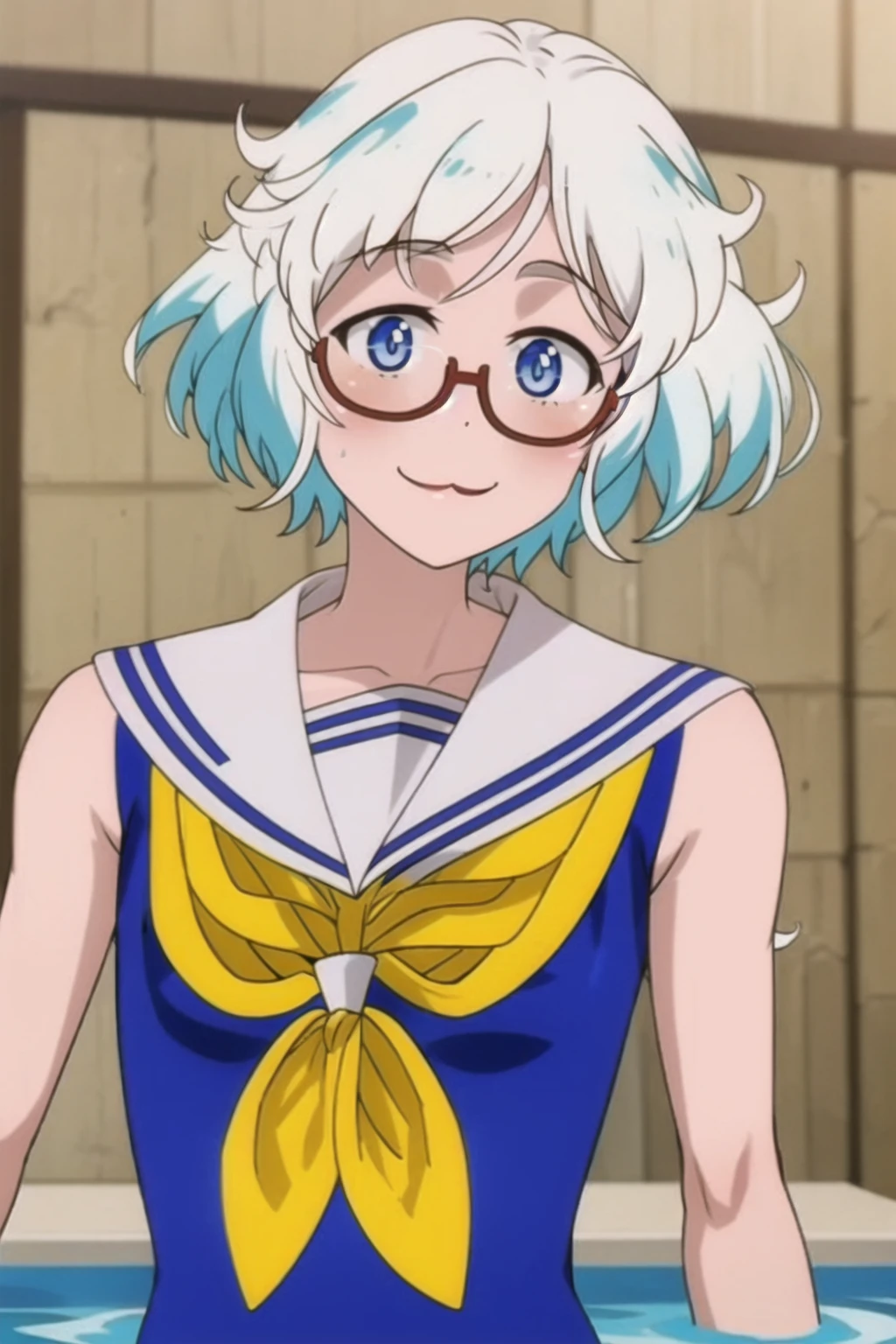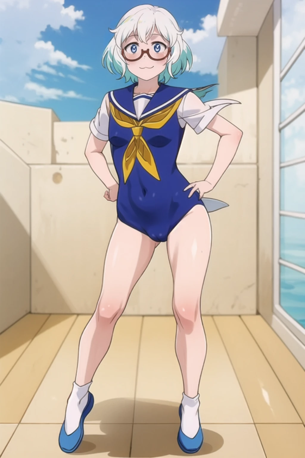 tags are : shiroumi kana , 1girl , aqua hair , blue eyes , fins , red-framed glasses , yellow neckerchief , one-piece swimsuit , sailor collar , short white hair , small breasts