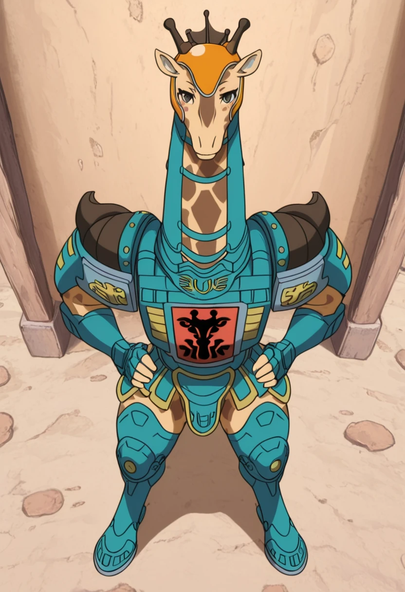 BSLongGiraffe, furry, giraffe, animal ears, animal nose, long neck, teal armor, orange helmet, fingerless gloves, horns