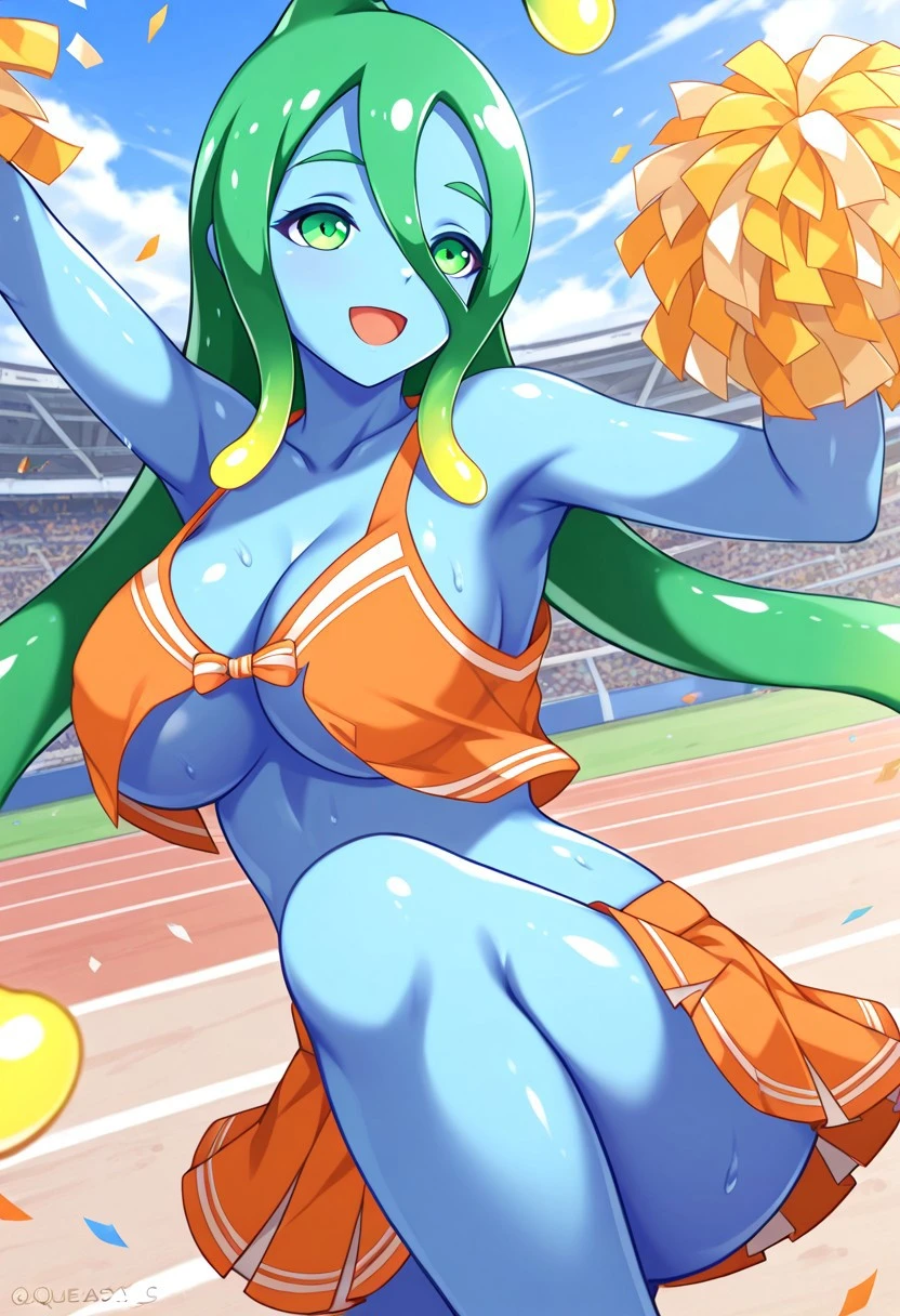 Normal form: mmSuu, monster girl, slime girl, large breasts, colored skin, blue skin, green hair, long hair, green eyes, wet skin, shiny skin, transparent body, tentacle hair
