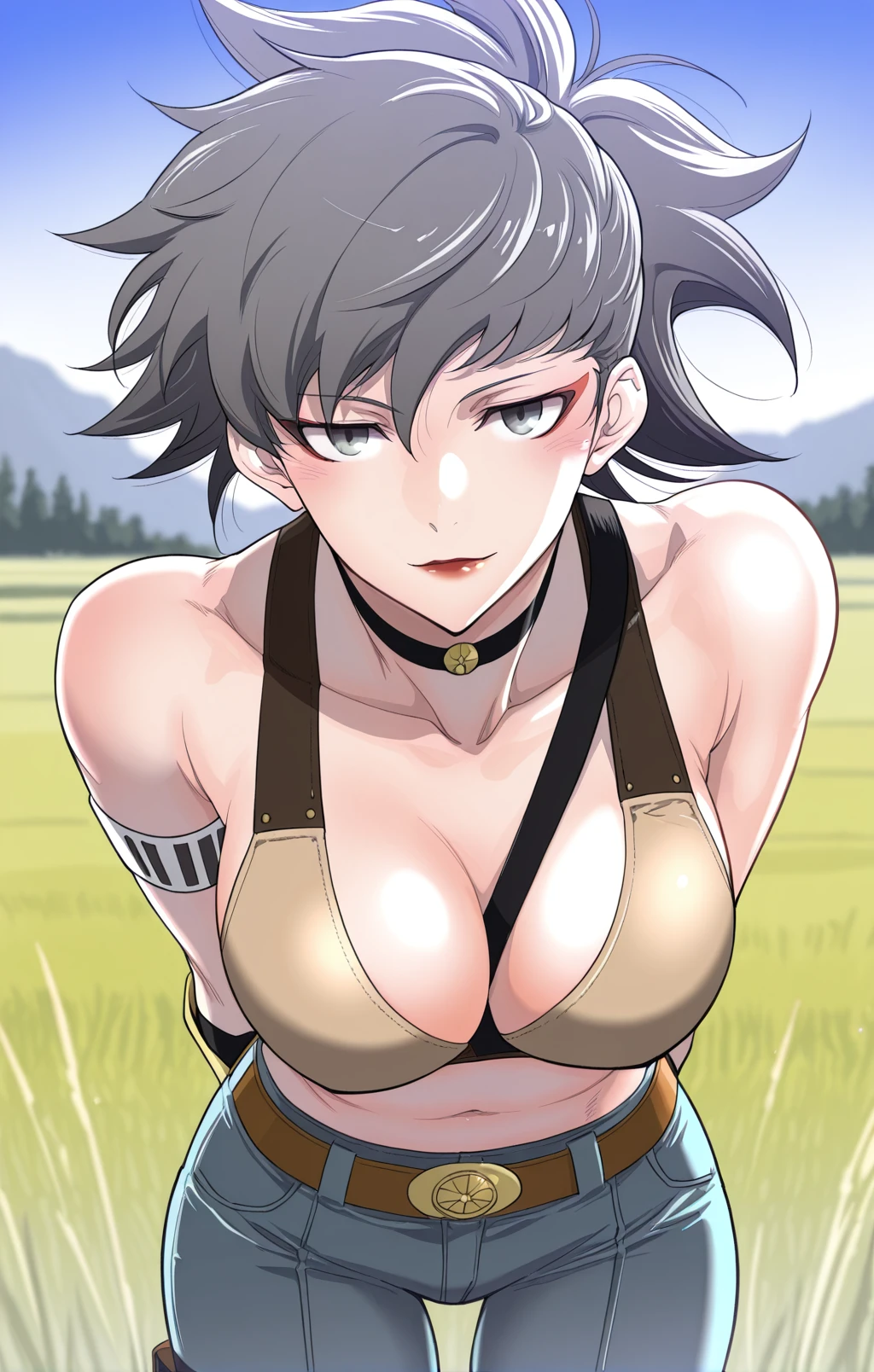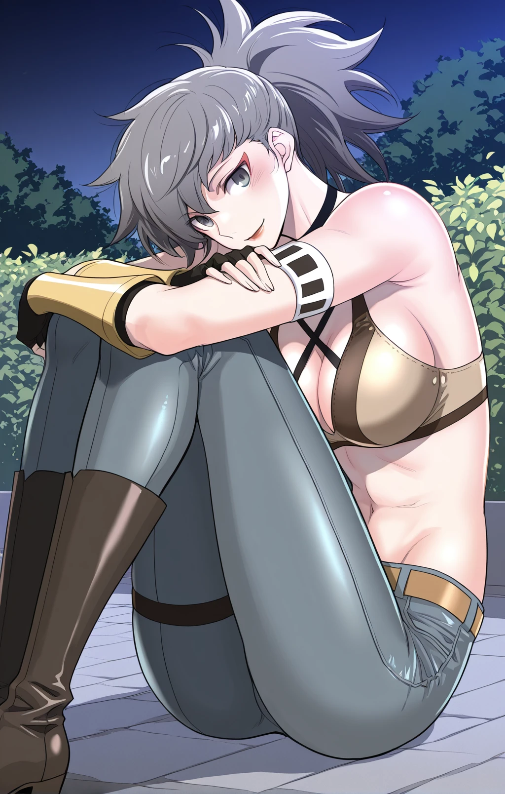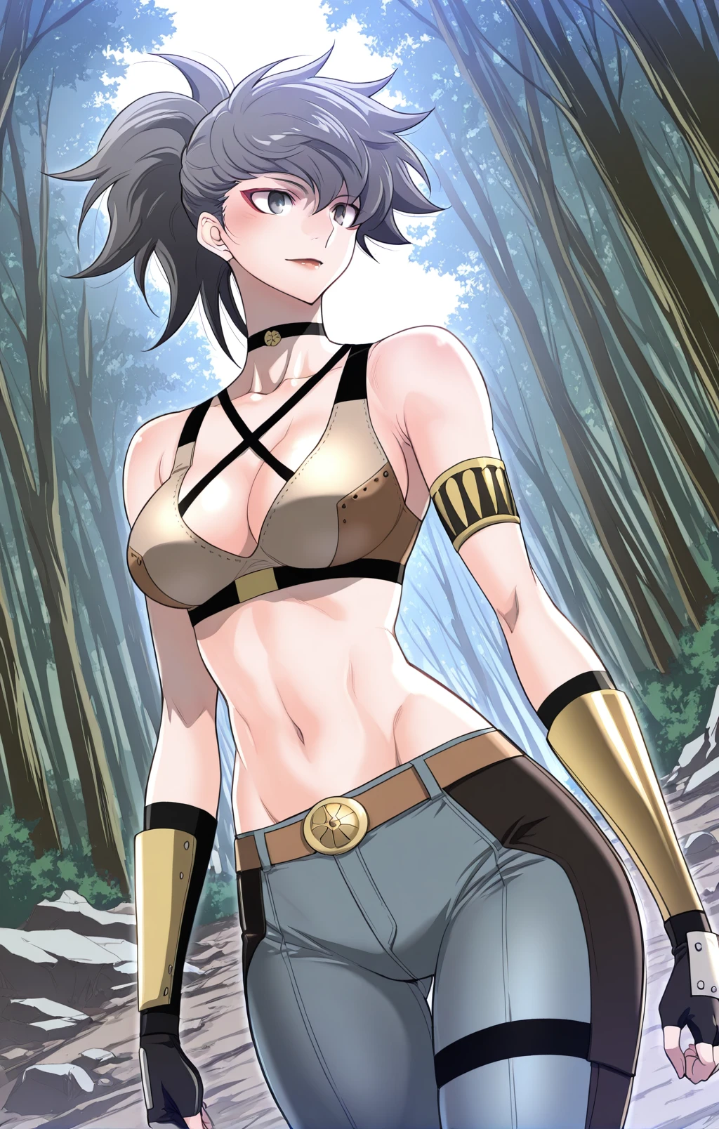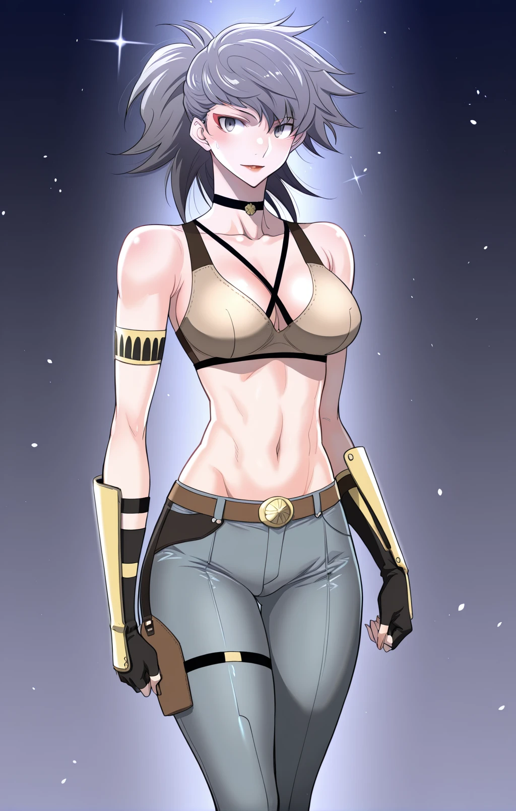 Choah_outfit1, tan combat bra, black straps, cross strap top, exposed cleavage, black choker, black fingerless gloves, white armband, arm strap, gold armguard, tight pants, blue-gray pants, brown belt, gold belt buckle, knee-high boots, black thigh strap,