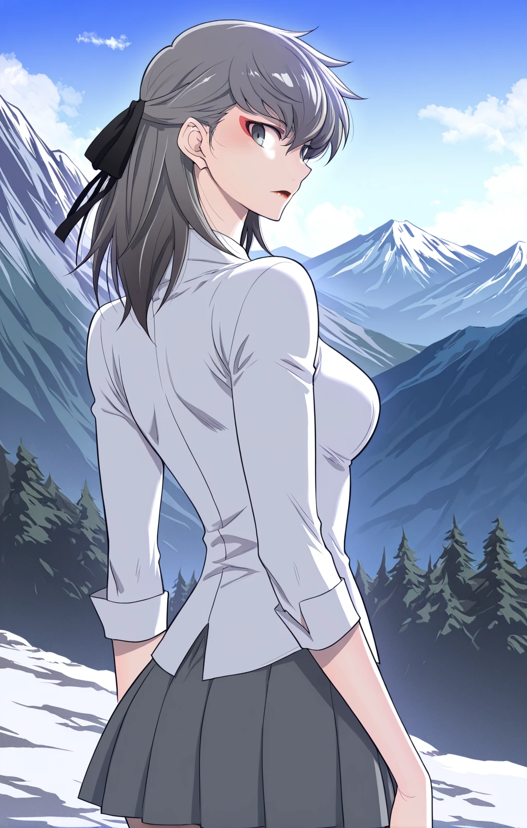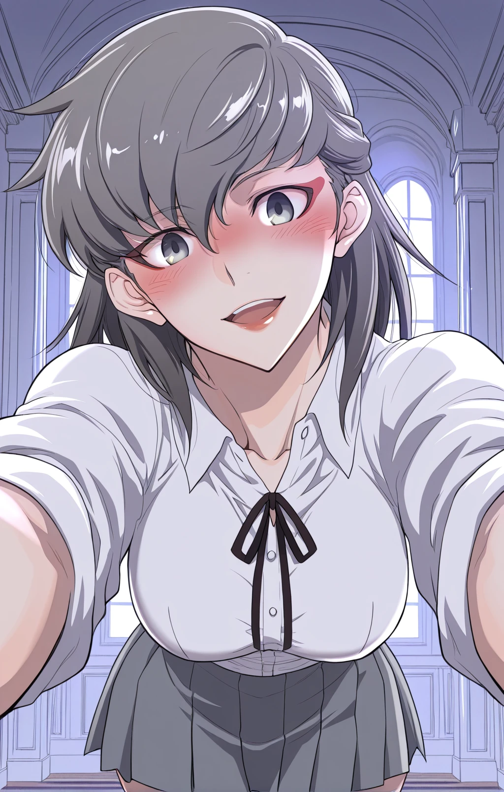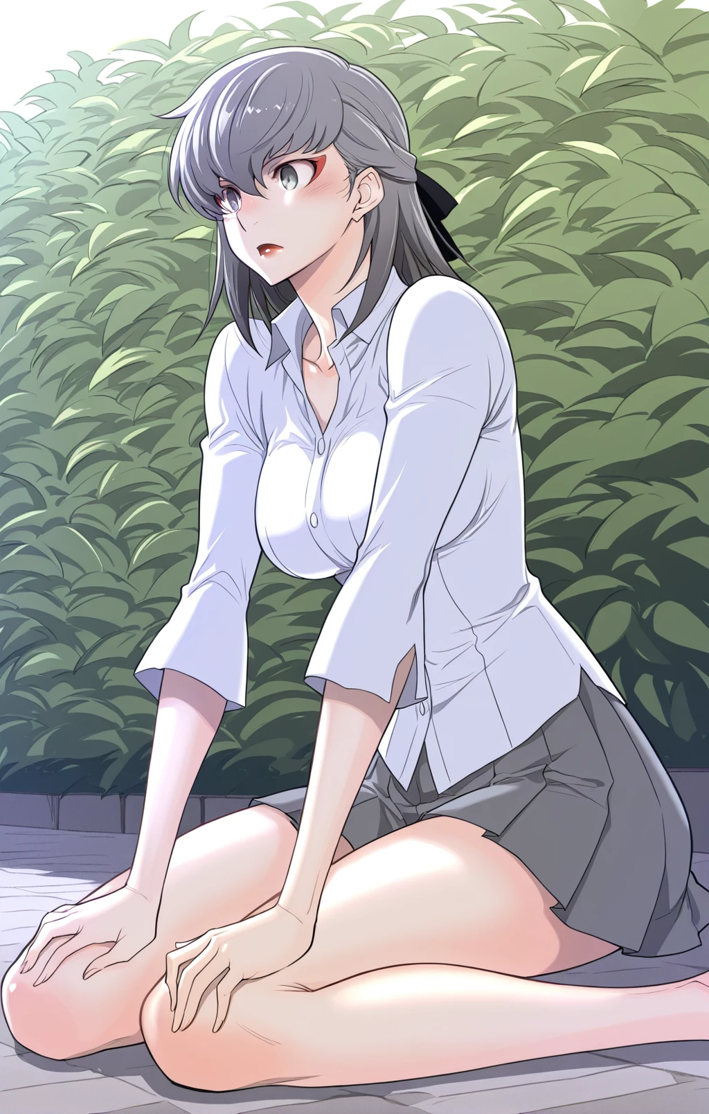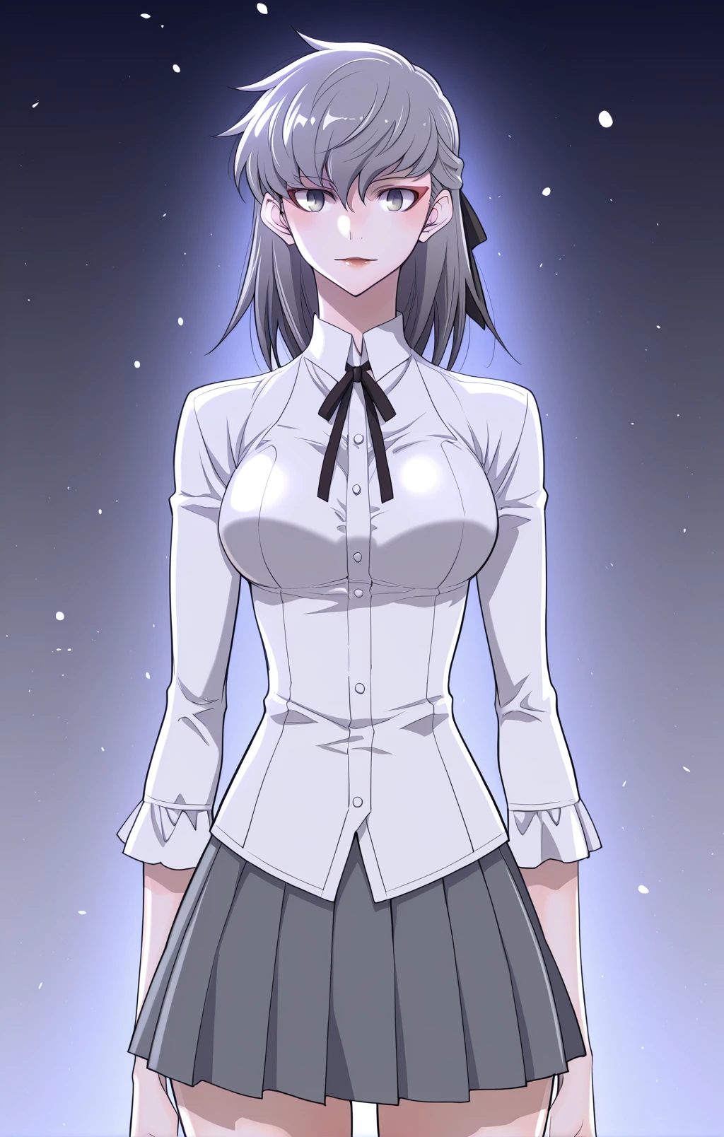 Choah, 1 girl, solo, ash gray hair, medium hair, long uneven bangs, straight hair, hair between eyes, black ribbon, hair tied back, gray eyes, red eye makeup,