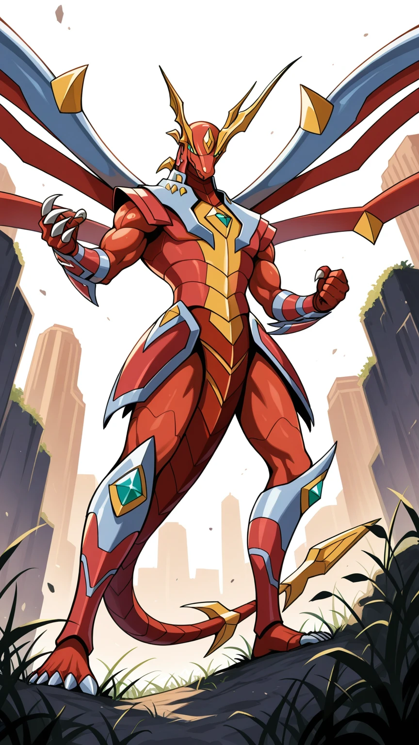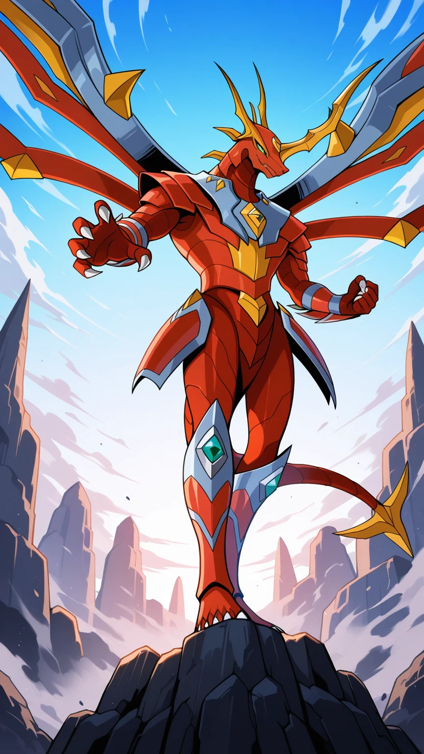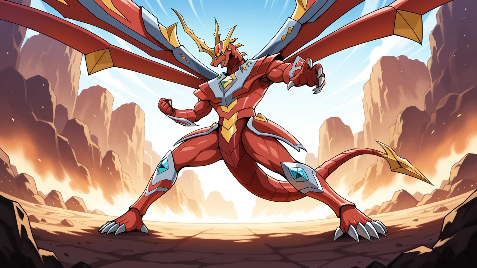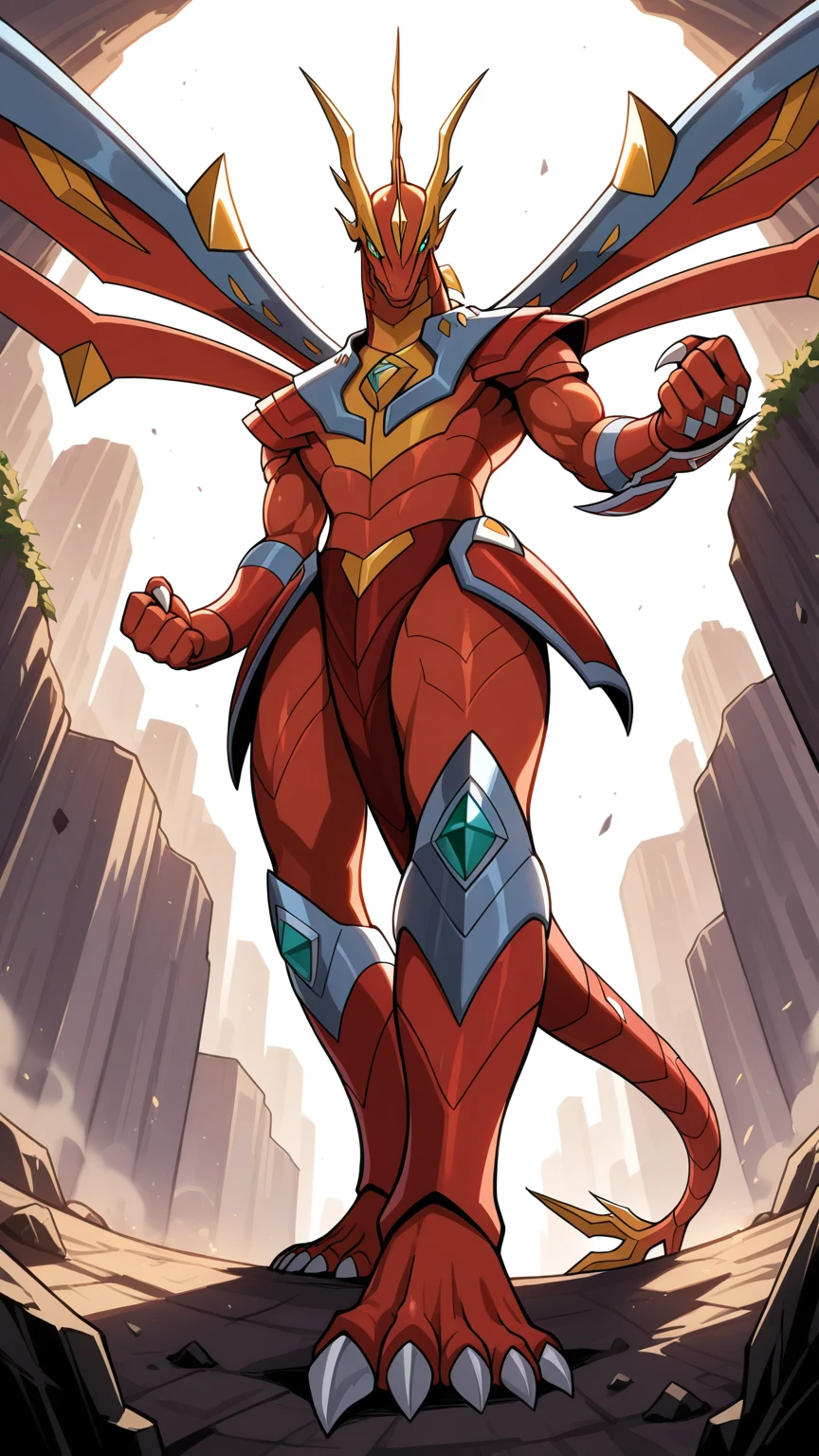 TitaniumDragonoid, Dragon, Wings, Claws, Horn, Green Eyes, Bakugan, Red Skin, Muscular, Humanoid body