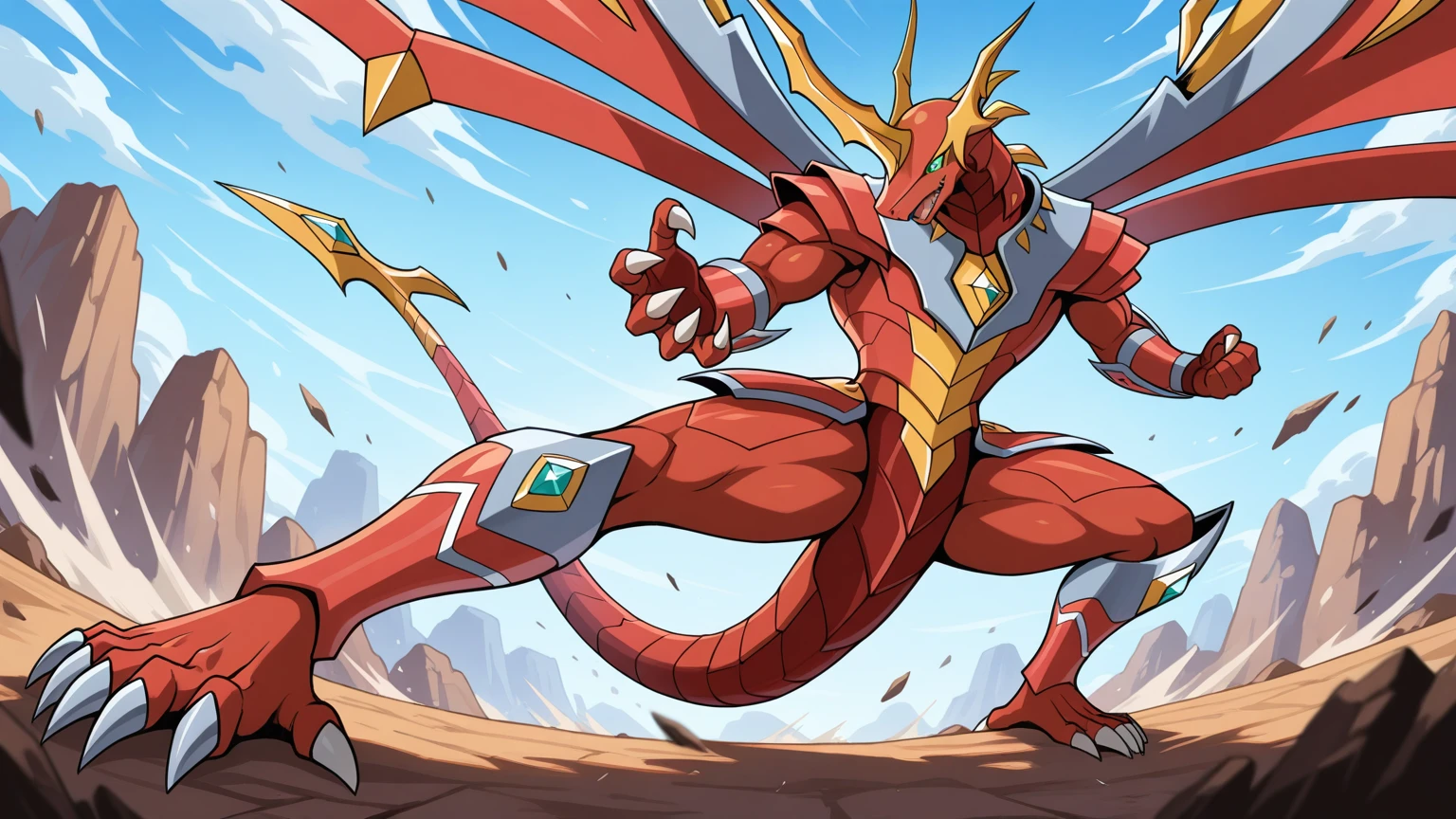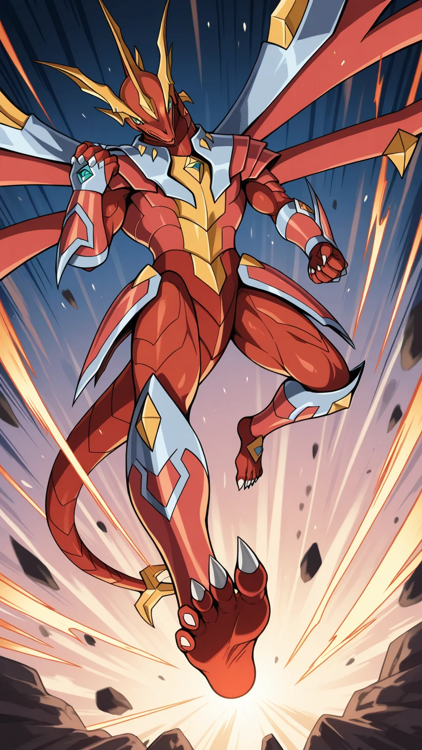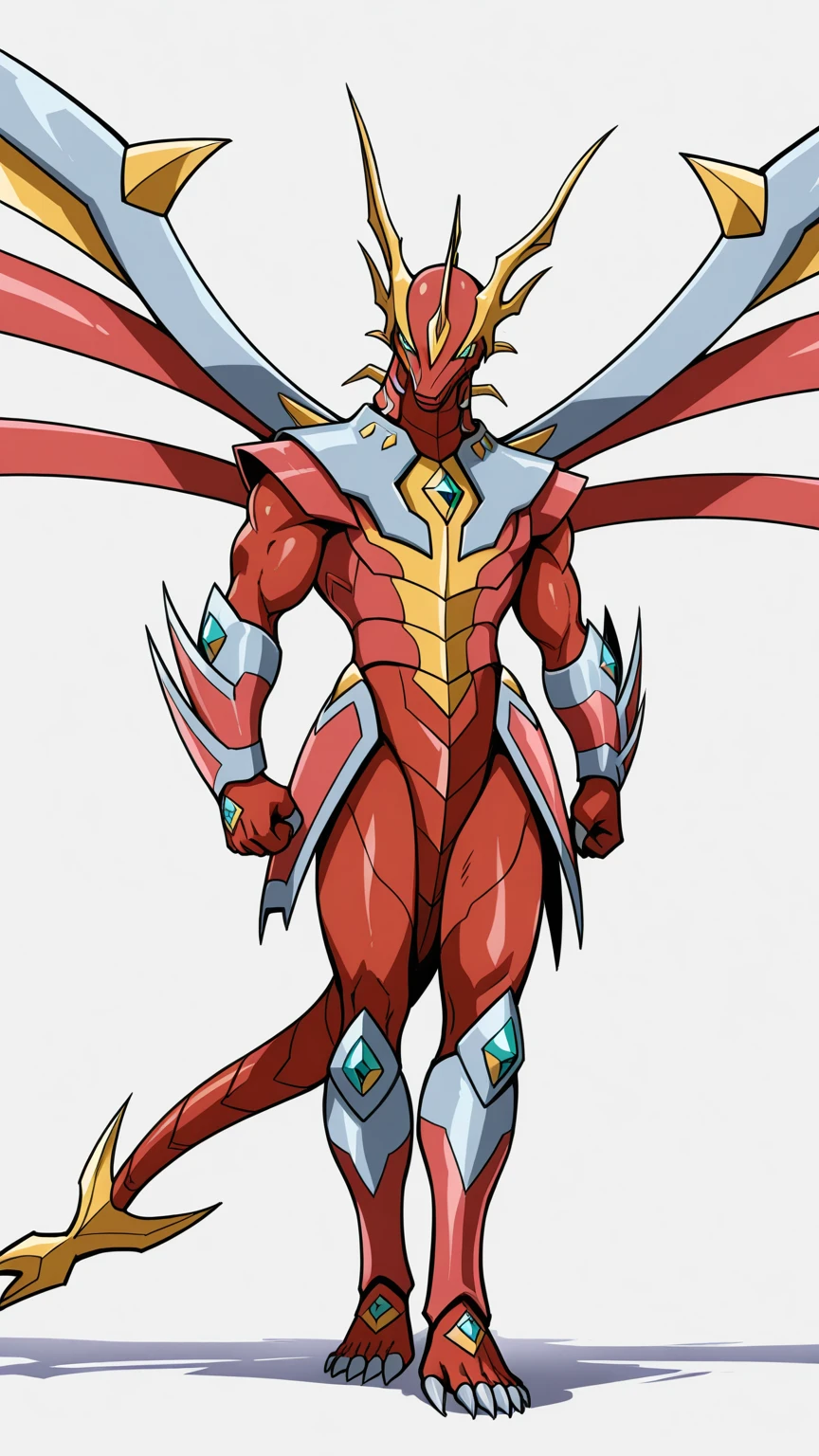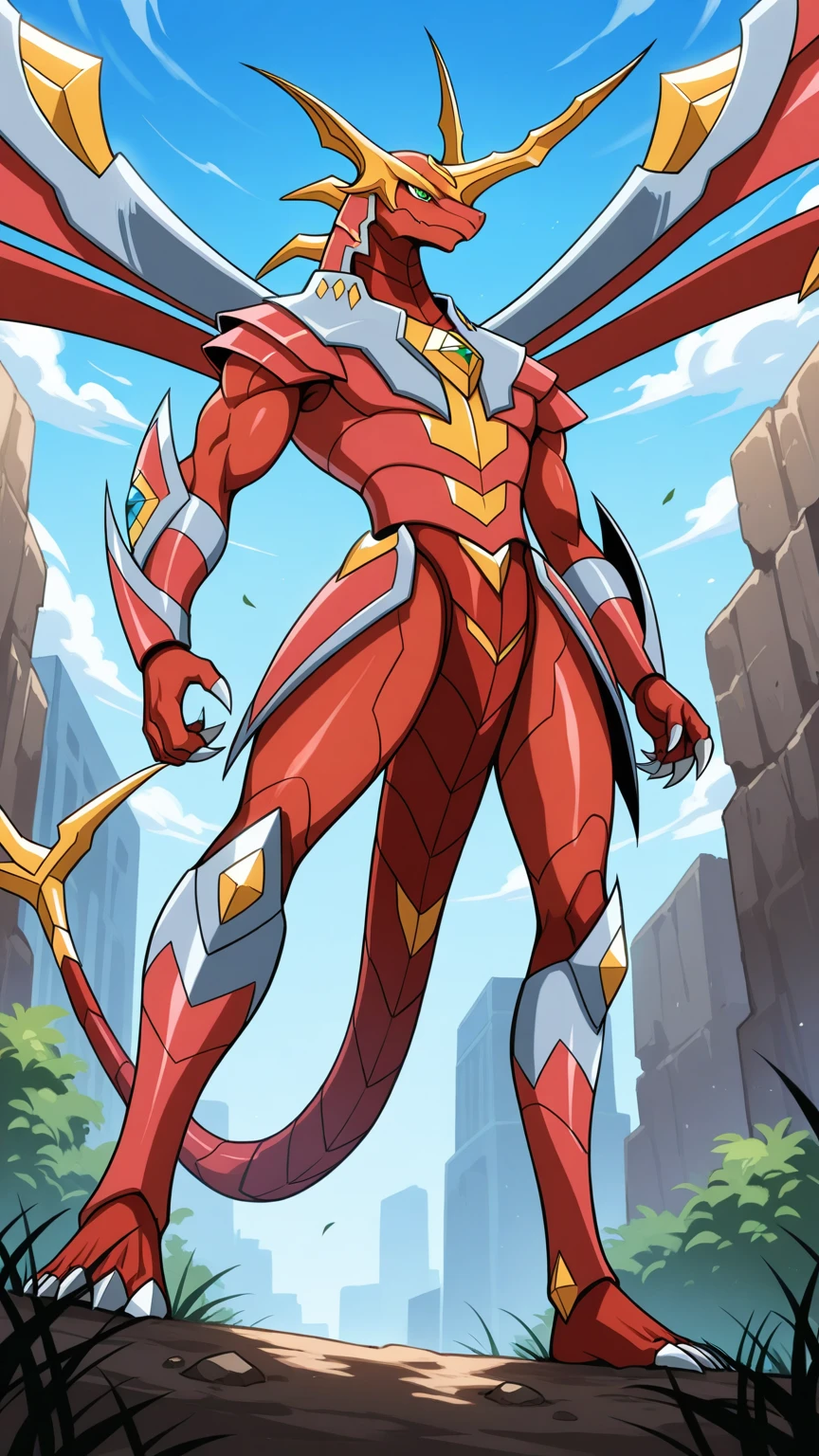 TitaniumDragonoid, Dragon, Wings, Claws, Horn, Green Eyes, Bakugan, Red Skin, Muscular, Humanoid body