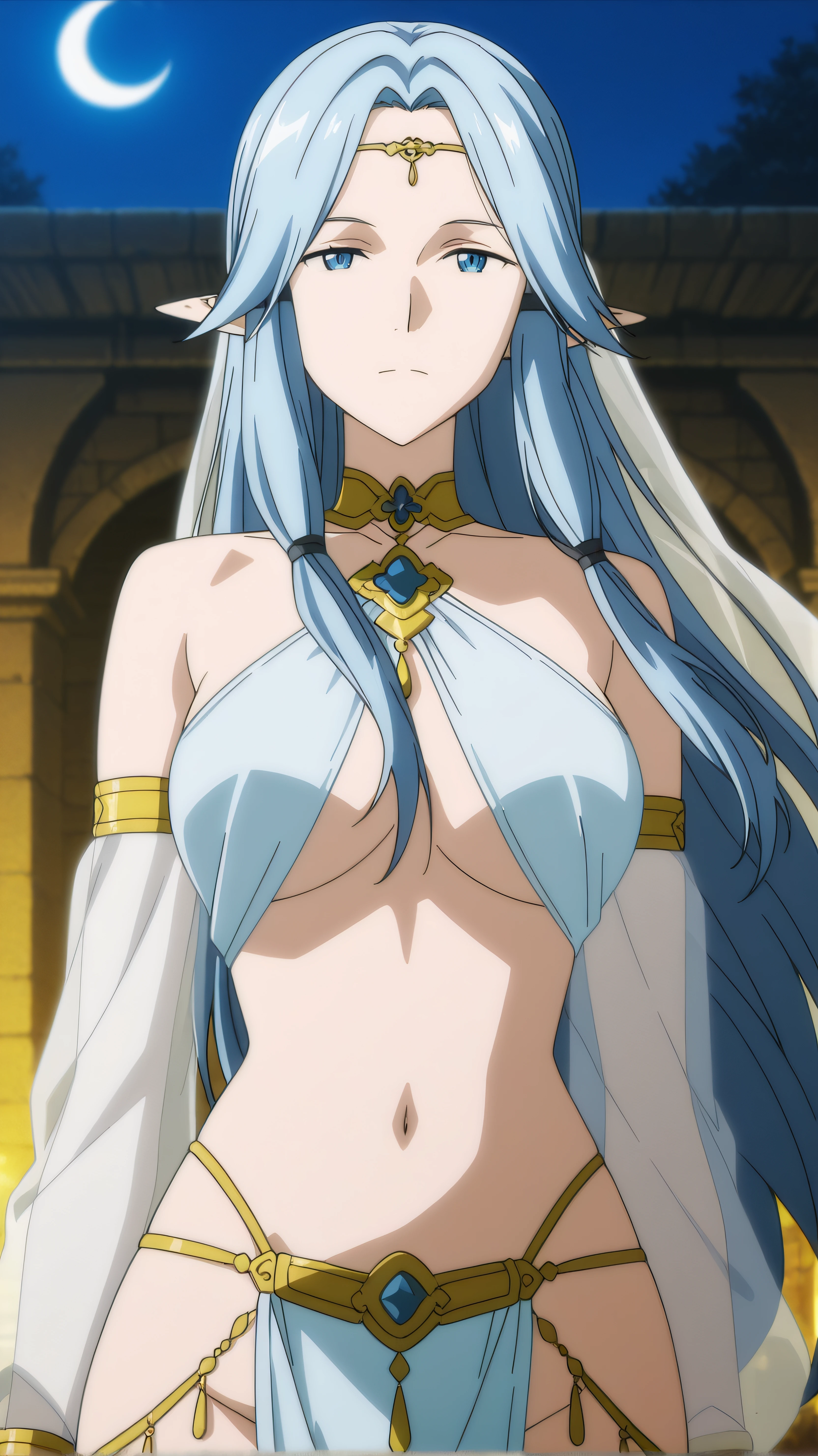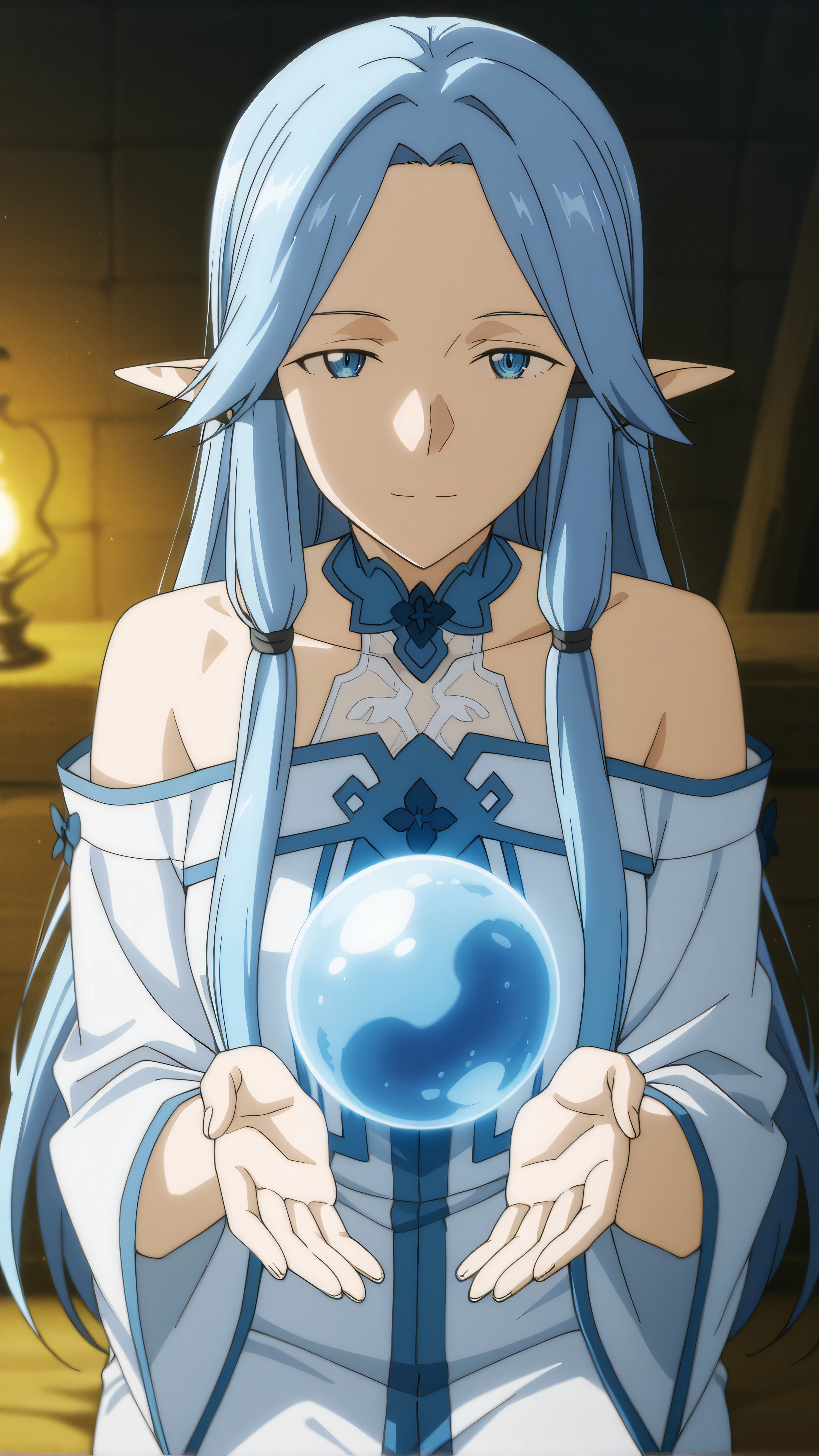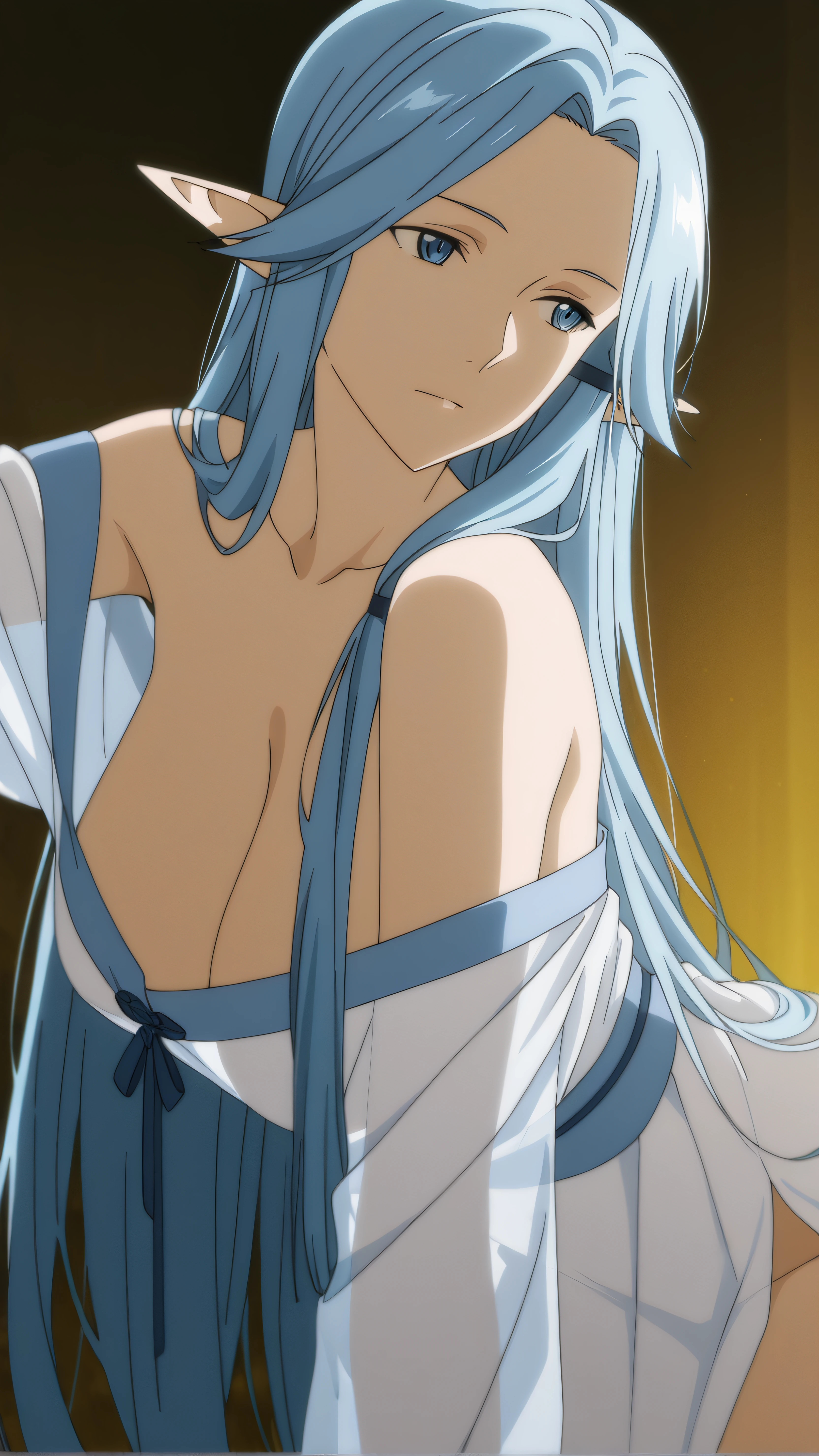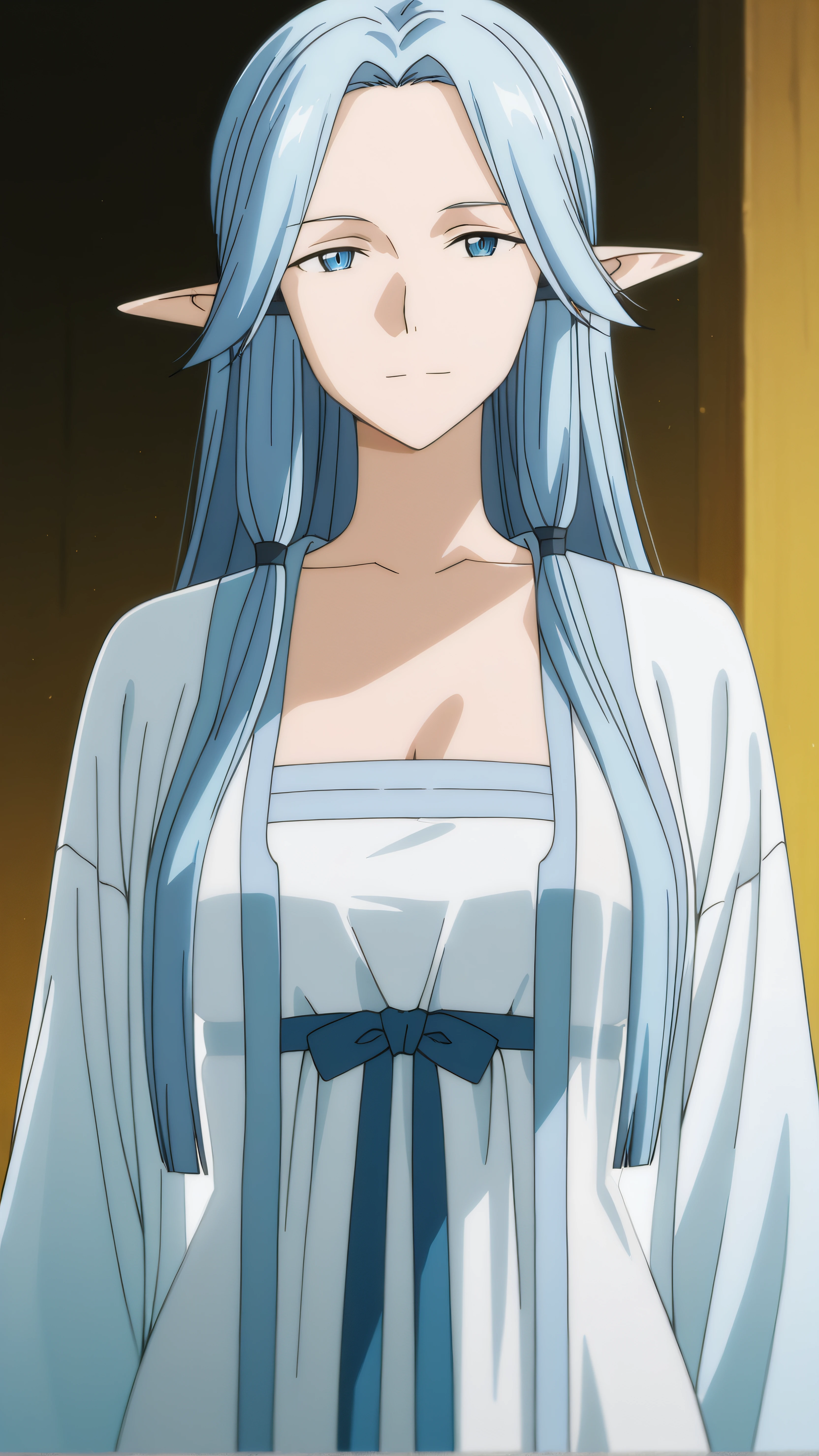 an si-eun,pointy ears, long hair, blue hair, elf, blue eyes,parted bangs,