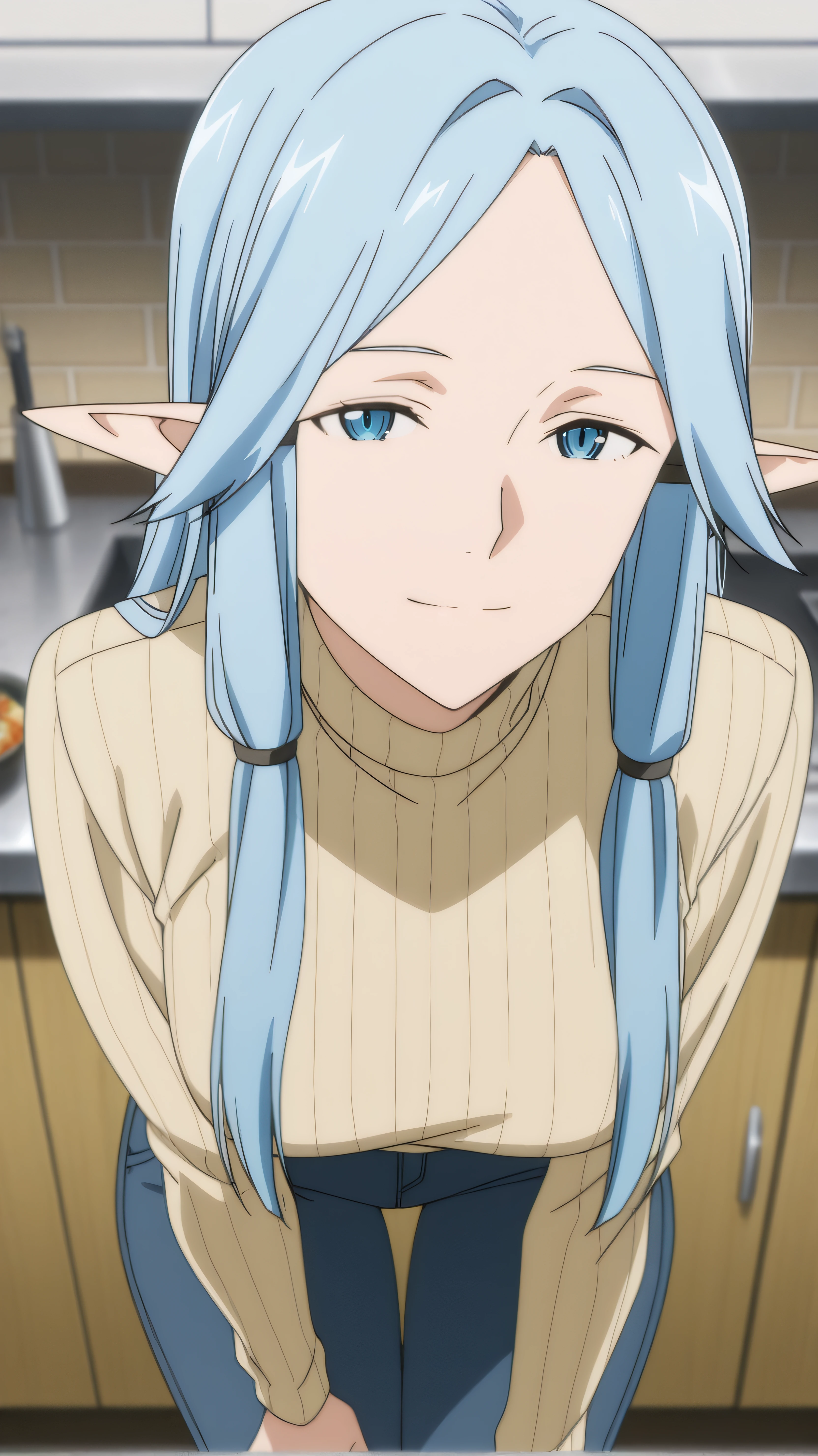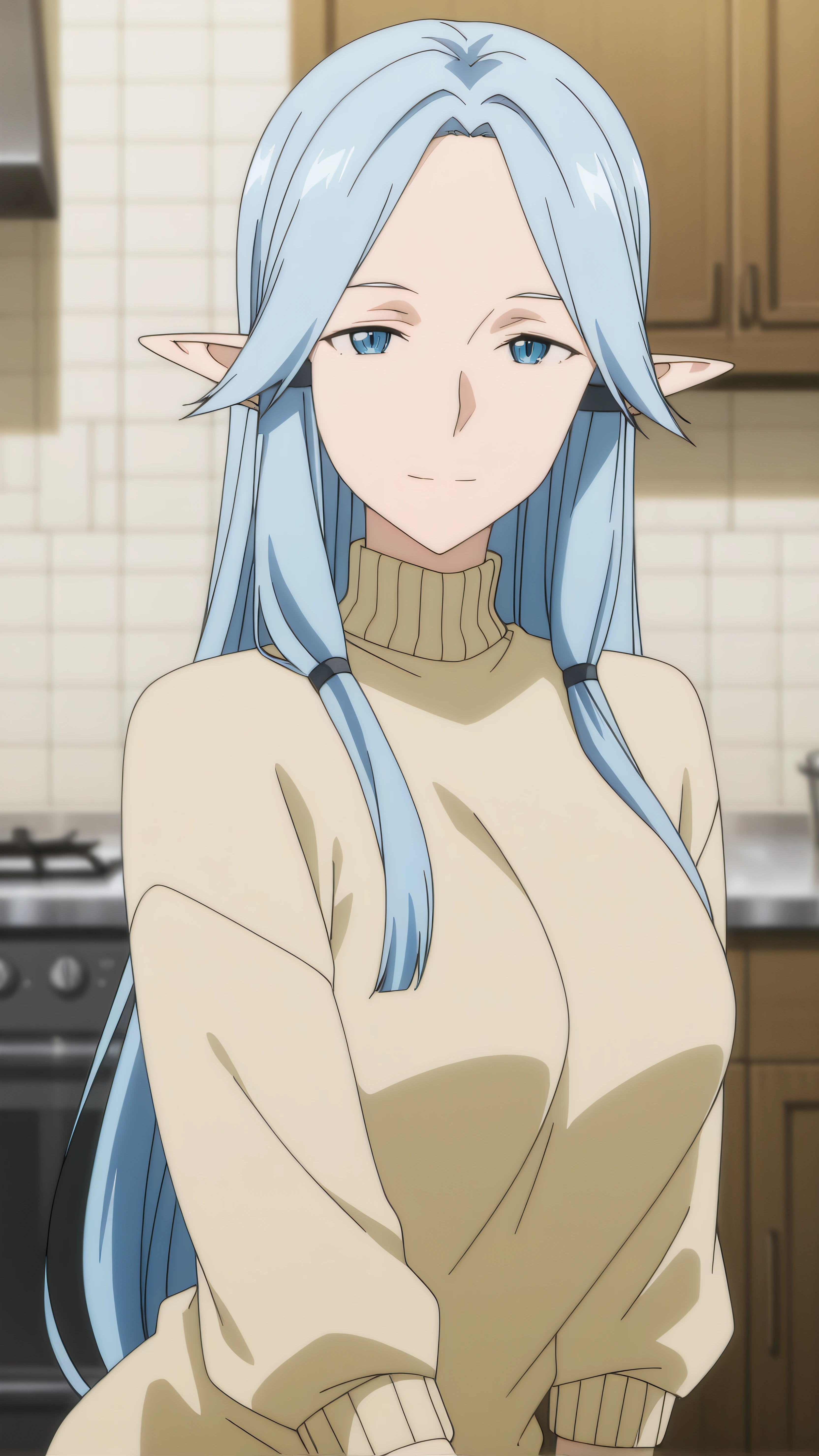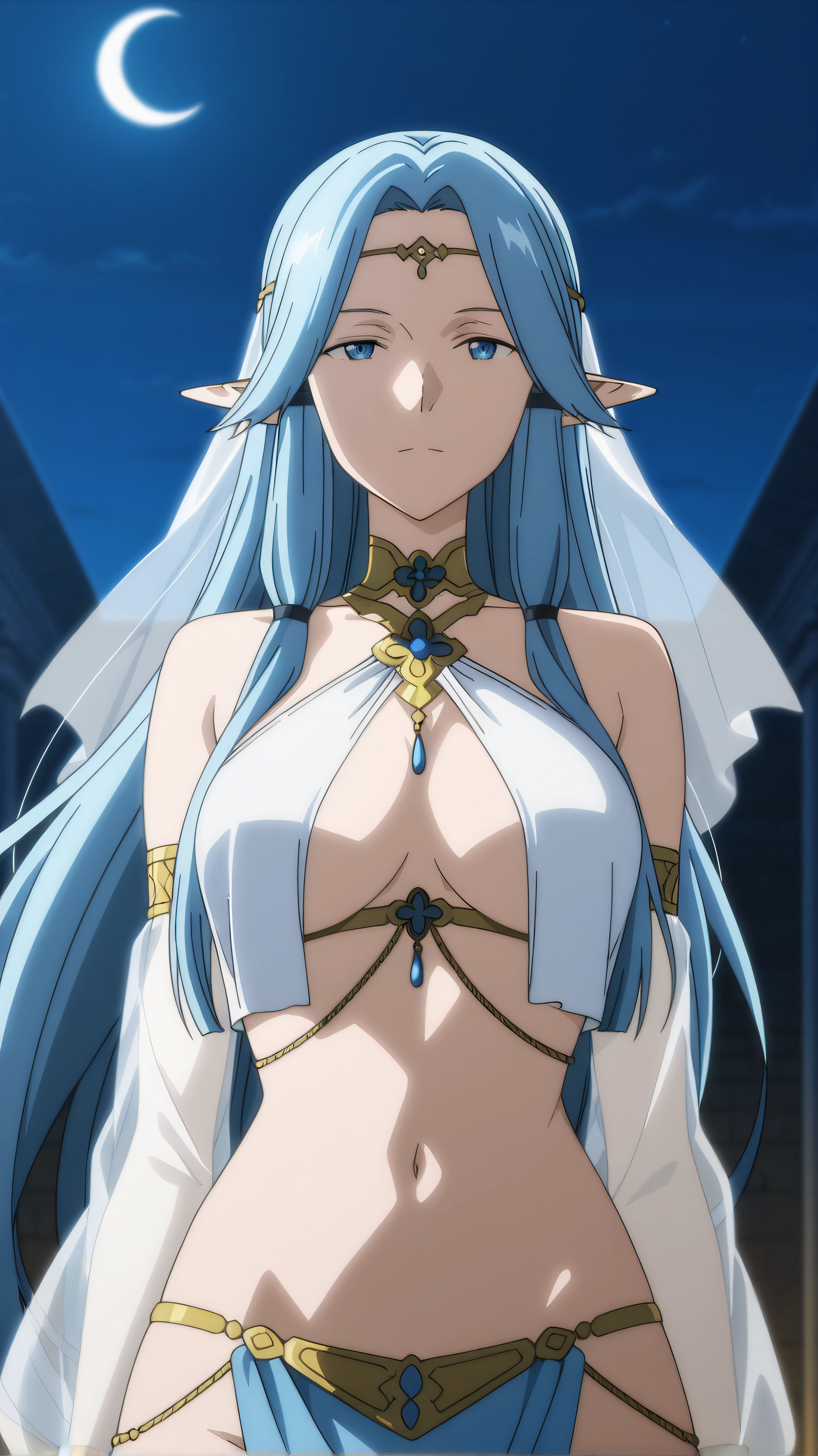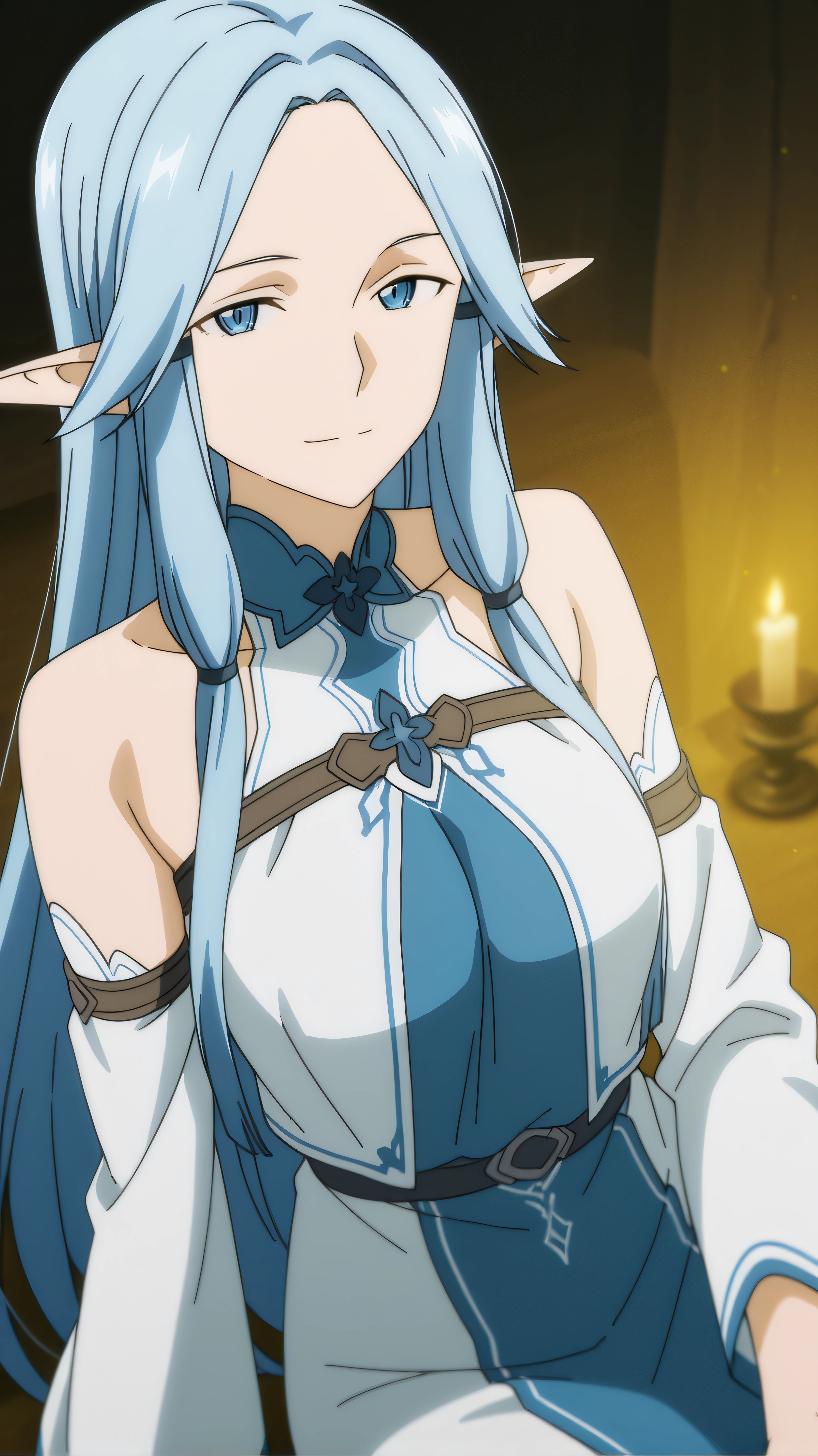 an si-eun,pointy ears, long hair, blue hair, elf, blue eyes,parted bangs,