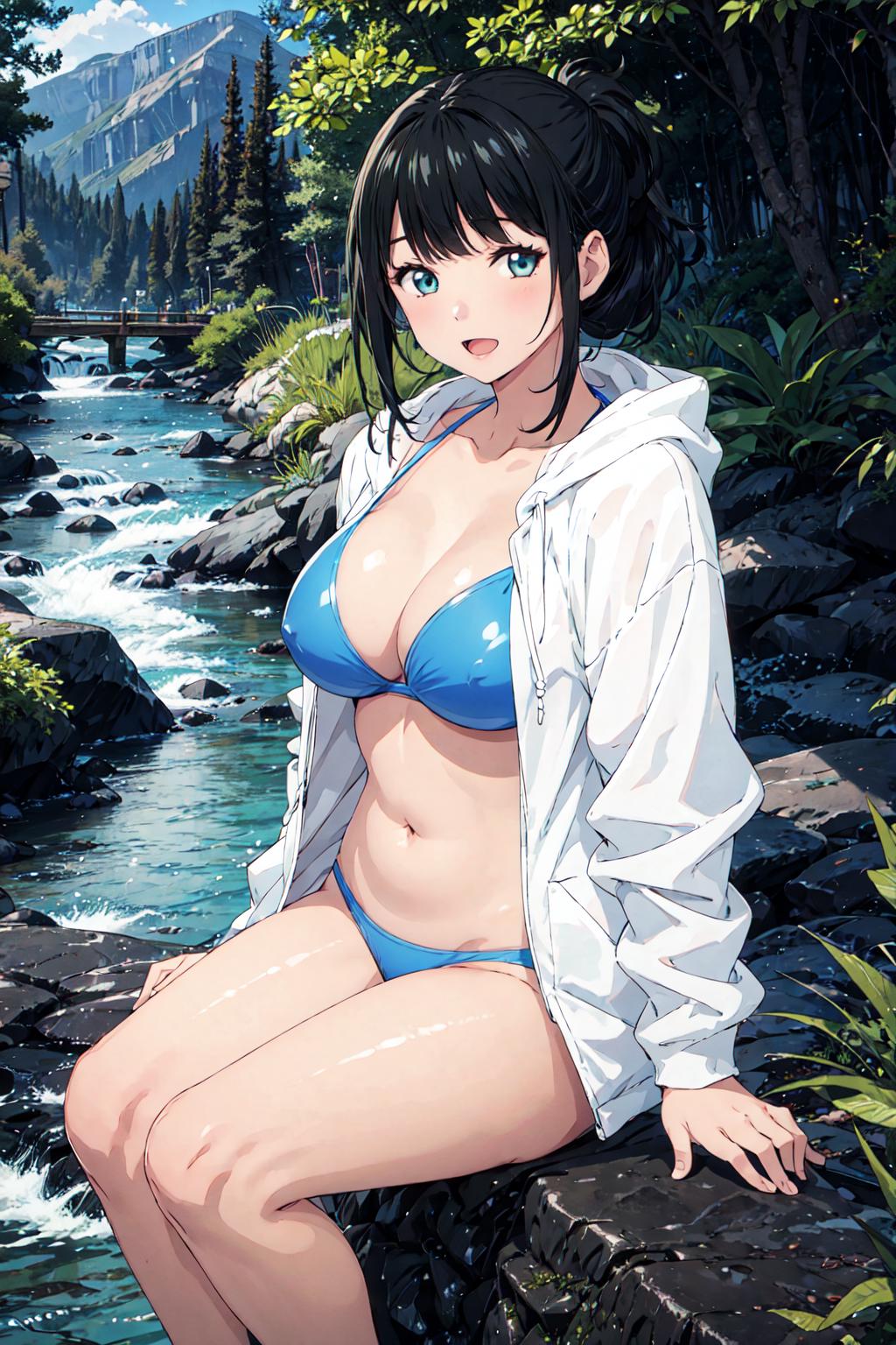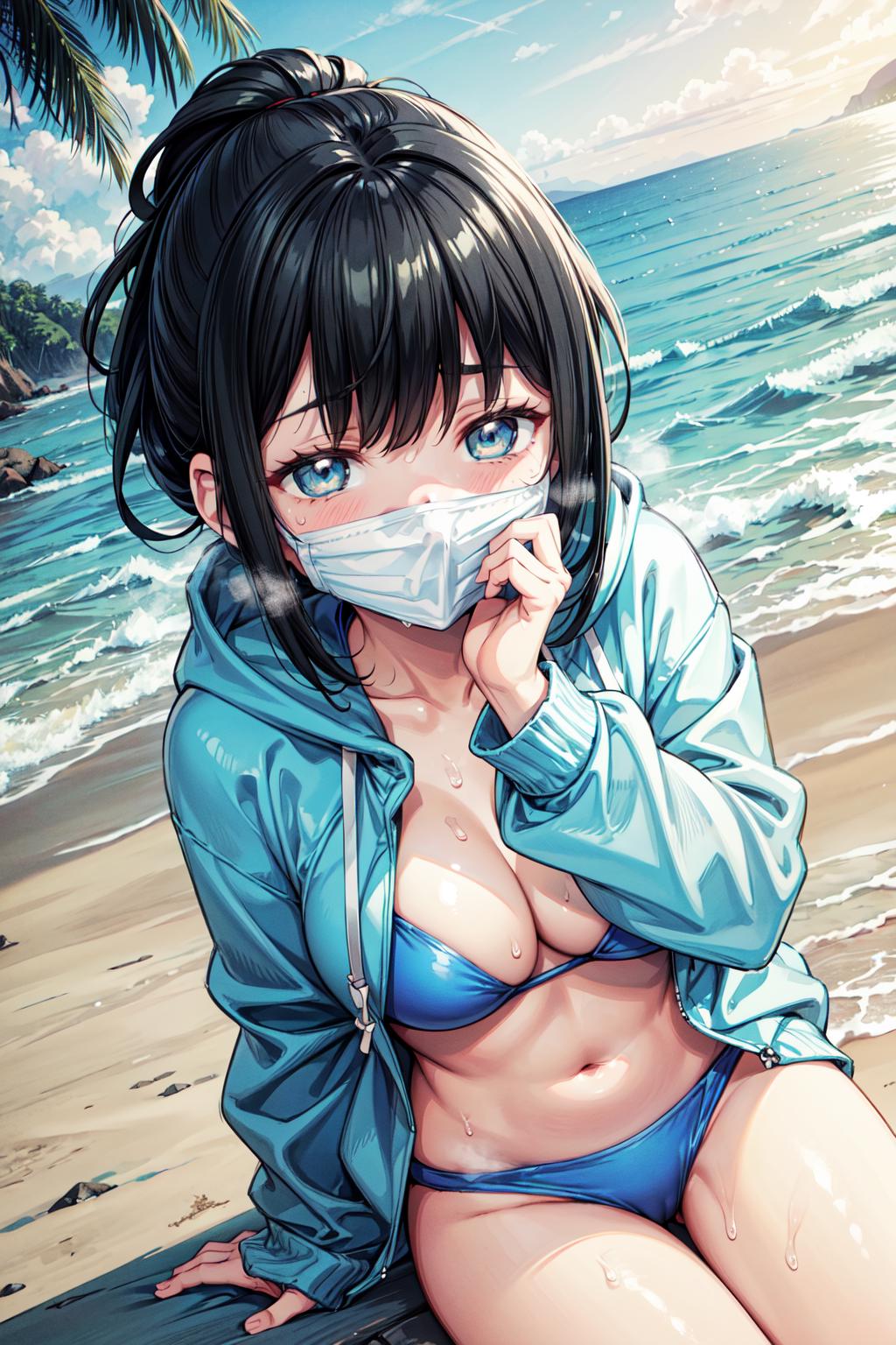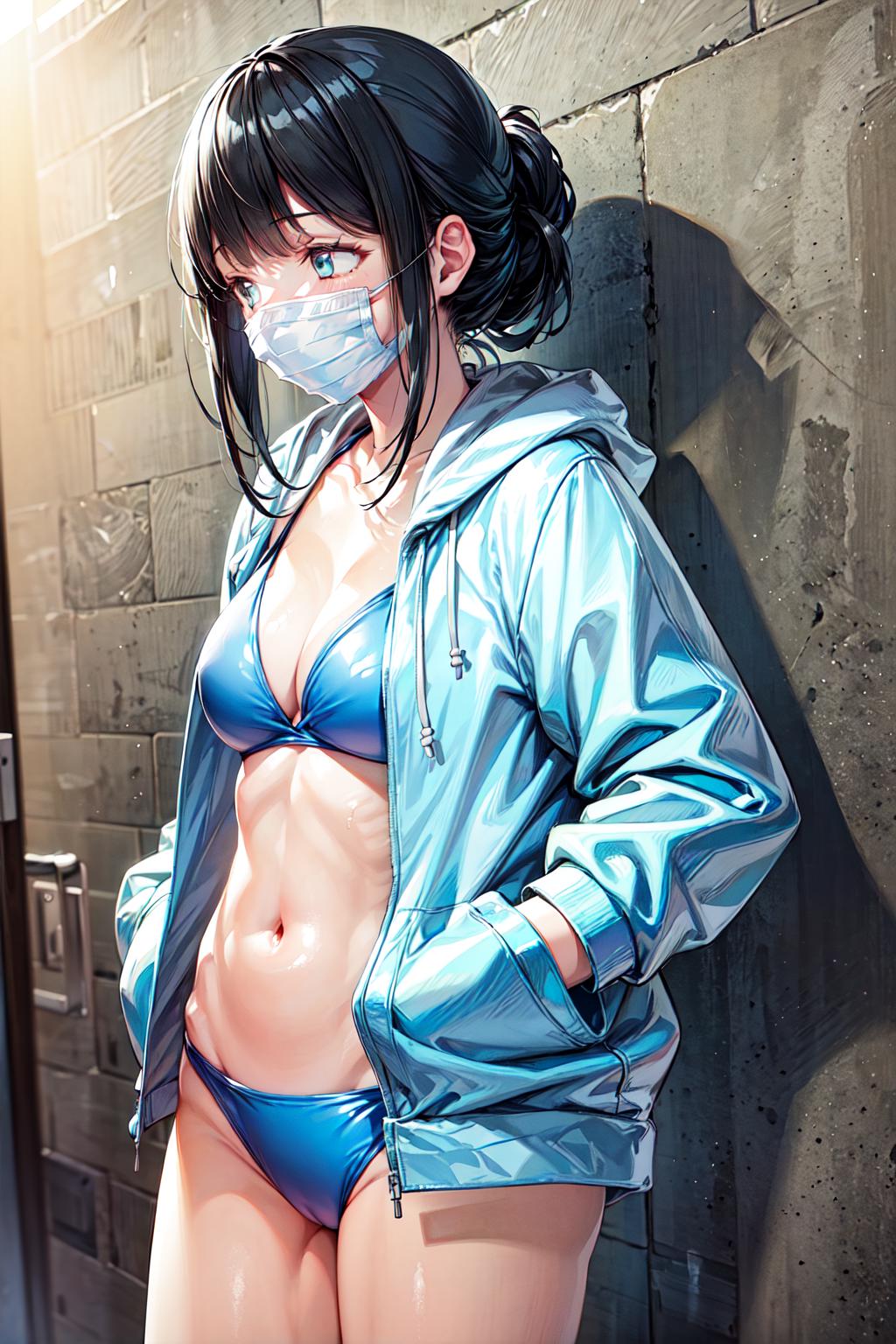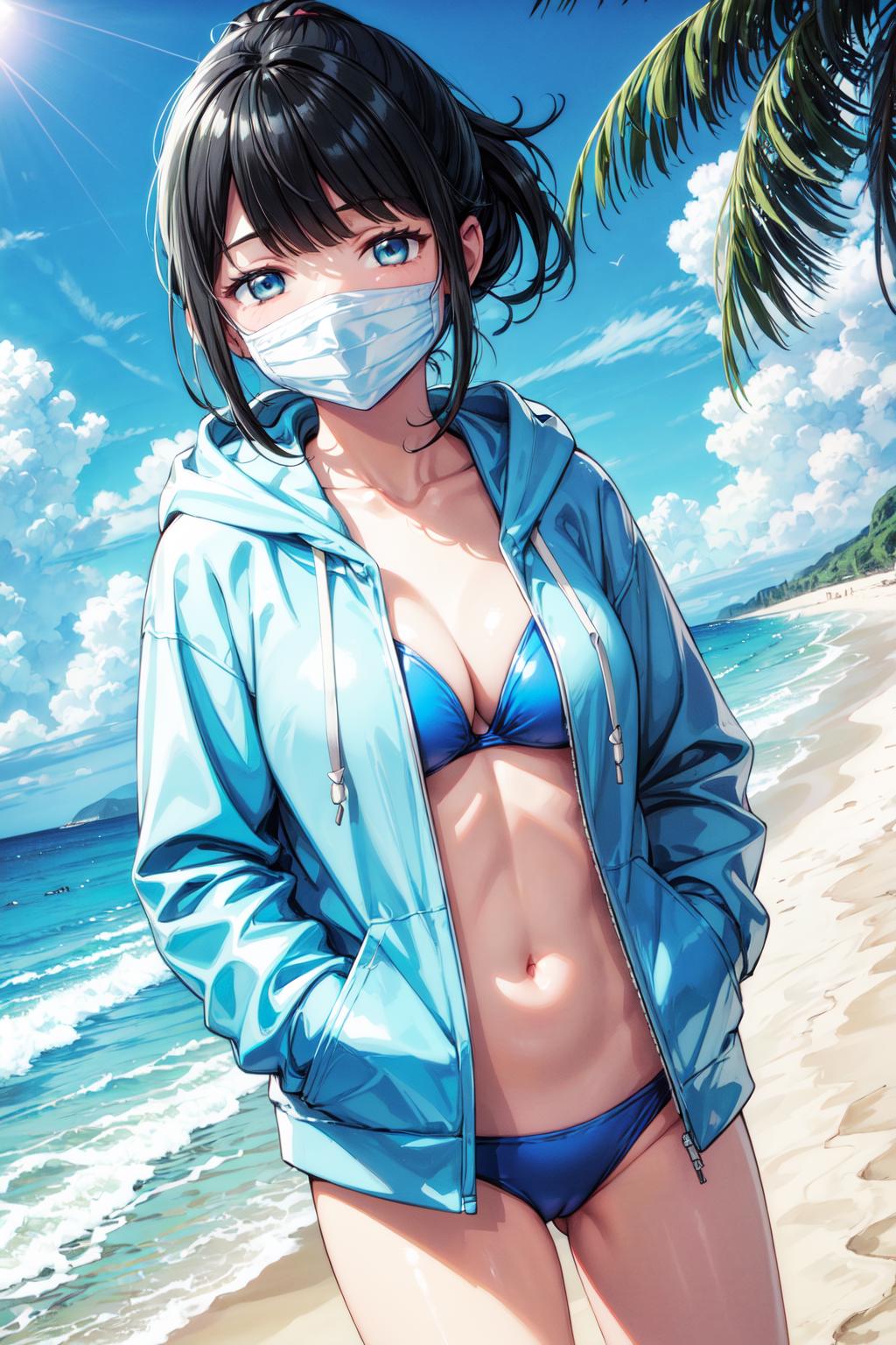 short hair, folded ponytail, swimsuit, blue bikini, hooded jacket