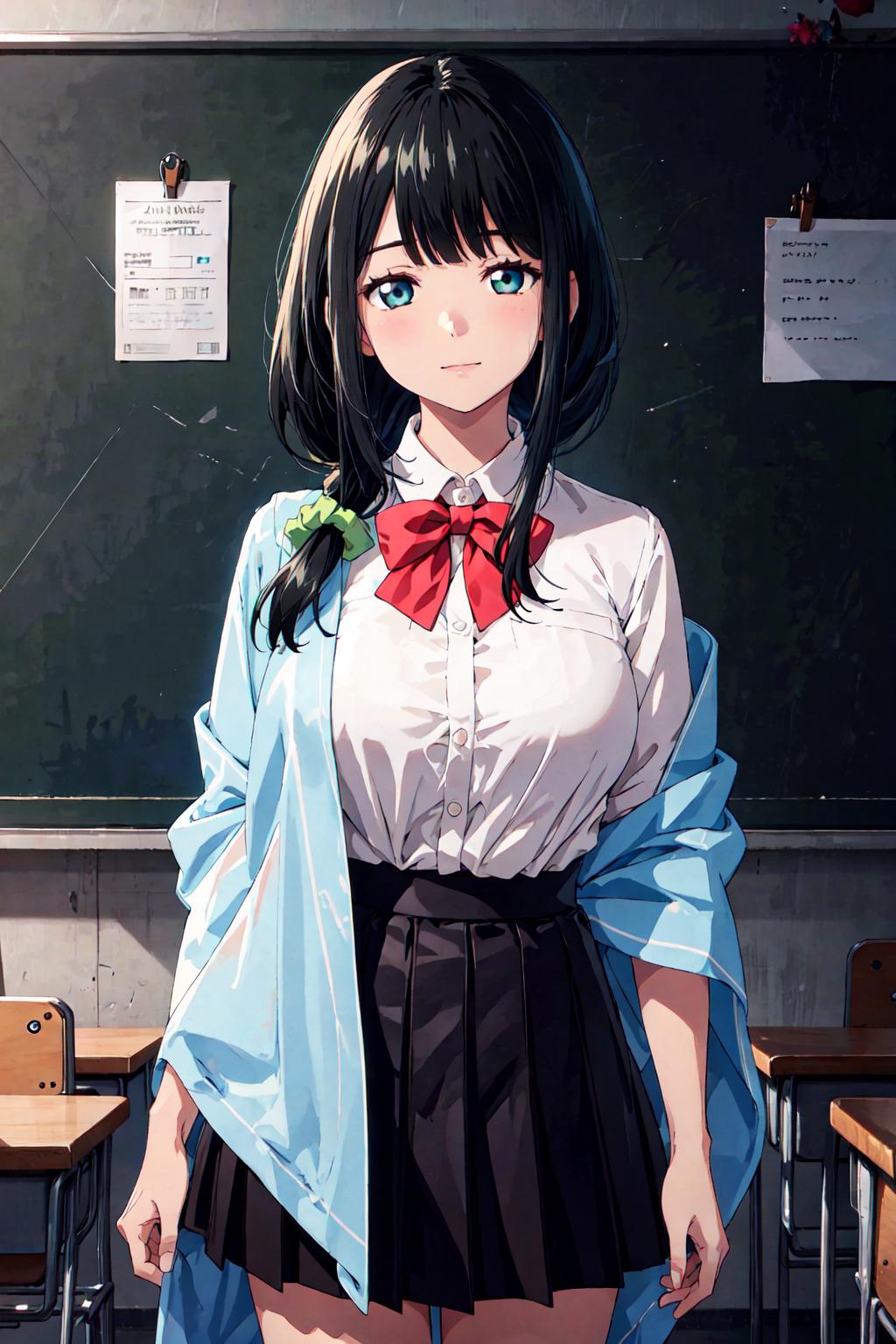 long hair, low side ponytail, shawl, black skirt, white shirt, bangs, red bowtie, green hair scrunchie,