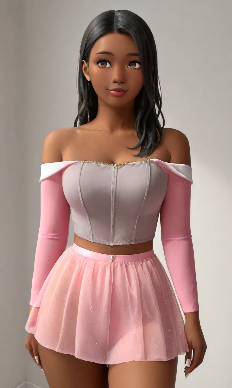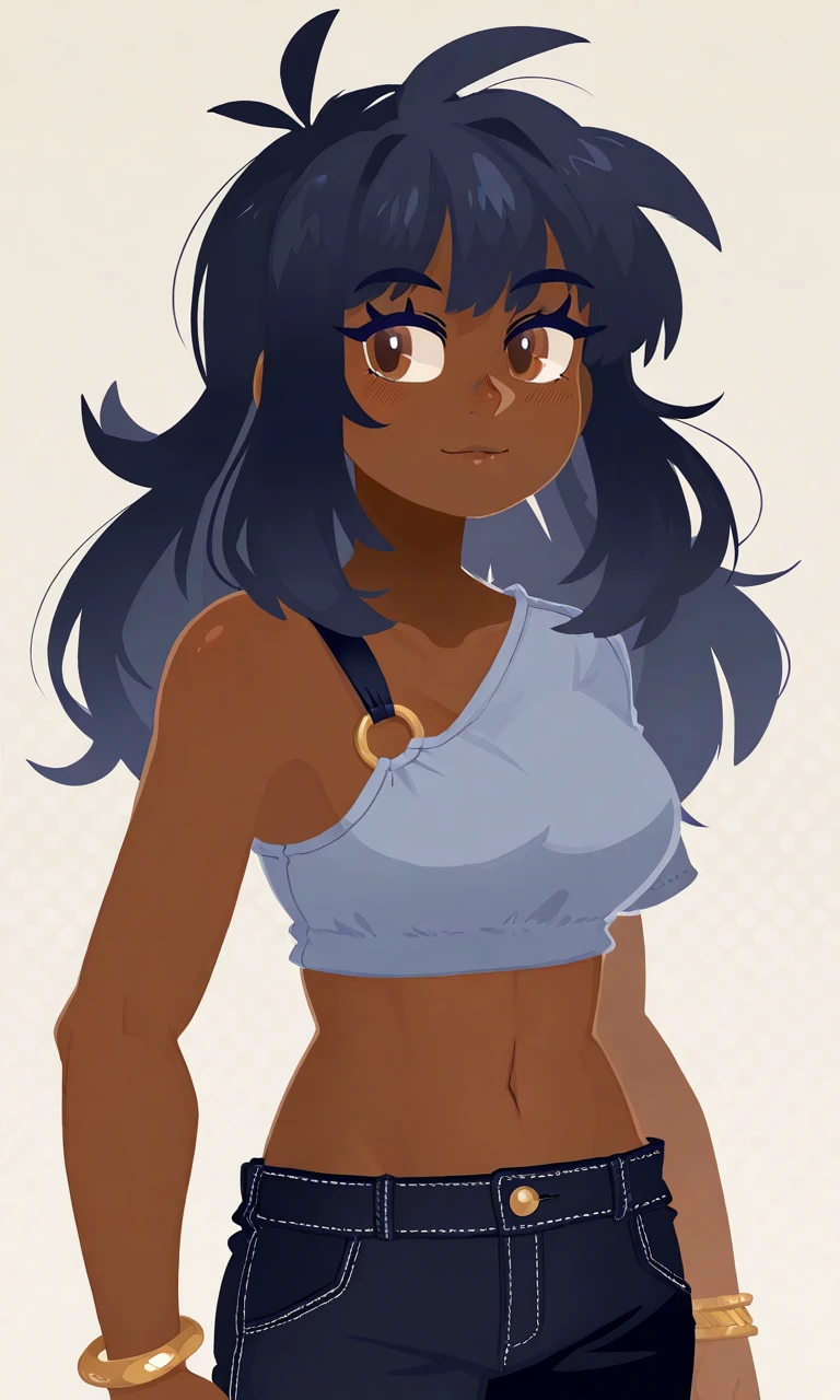 1girl,very dark skin,long hair,black hair,brown eyes,single-shoulder shirt,grey shirt,crop top,navel,bracelet,black pants,o-ring straps