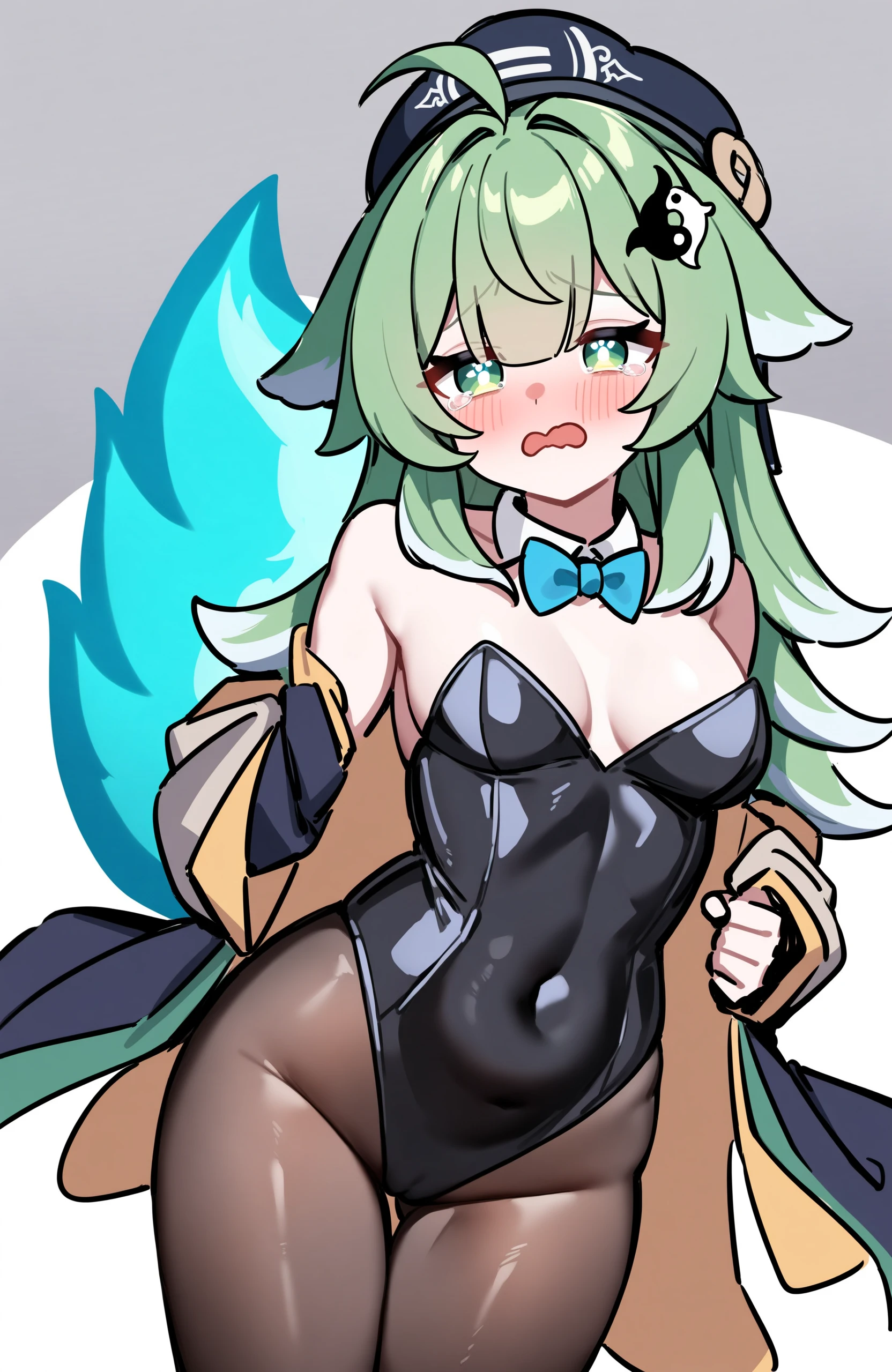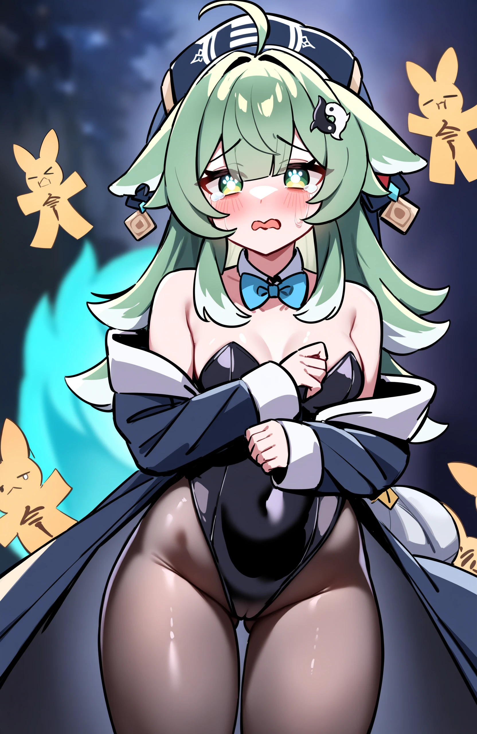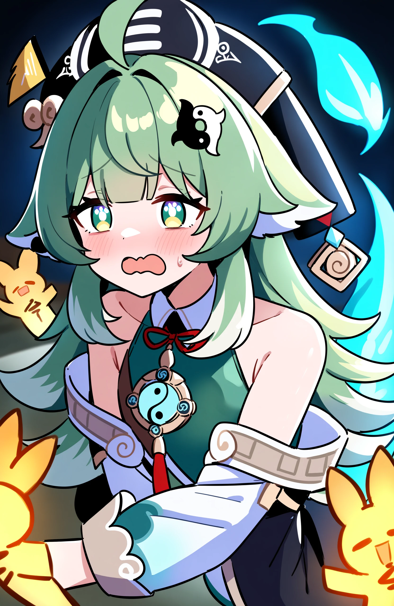prompt:huohuo_(honkai:_star_rail), paw-shaped_pupils, green eyes, green_hair, animal_ears, fox_ears, blue_fire, socks, long_hair, medium_hair, fiery_tail, tail_(honkai:_star_rail), yin_yang, yin_yang_hair_ornament, white_socks, sidelocks, black_footwear, bare_shoulders, zhuang_hat