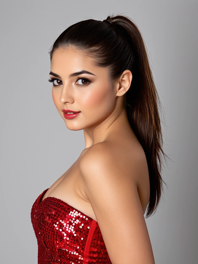 The Look: The ultimate bombshell silhouette—a sultry, floor-length red sequined gown with a gravity-defying sweetheart neckline and a leg slit that goes on forever.