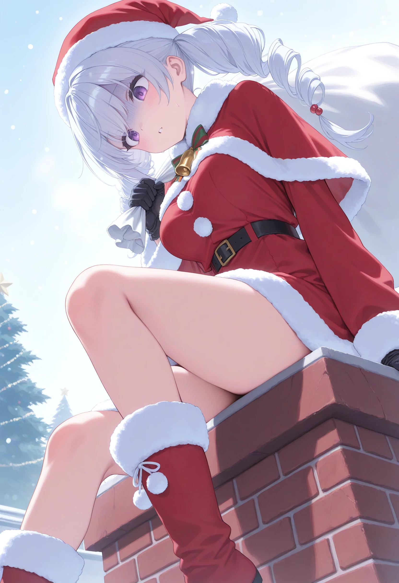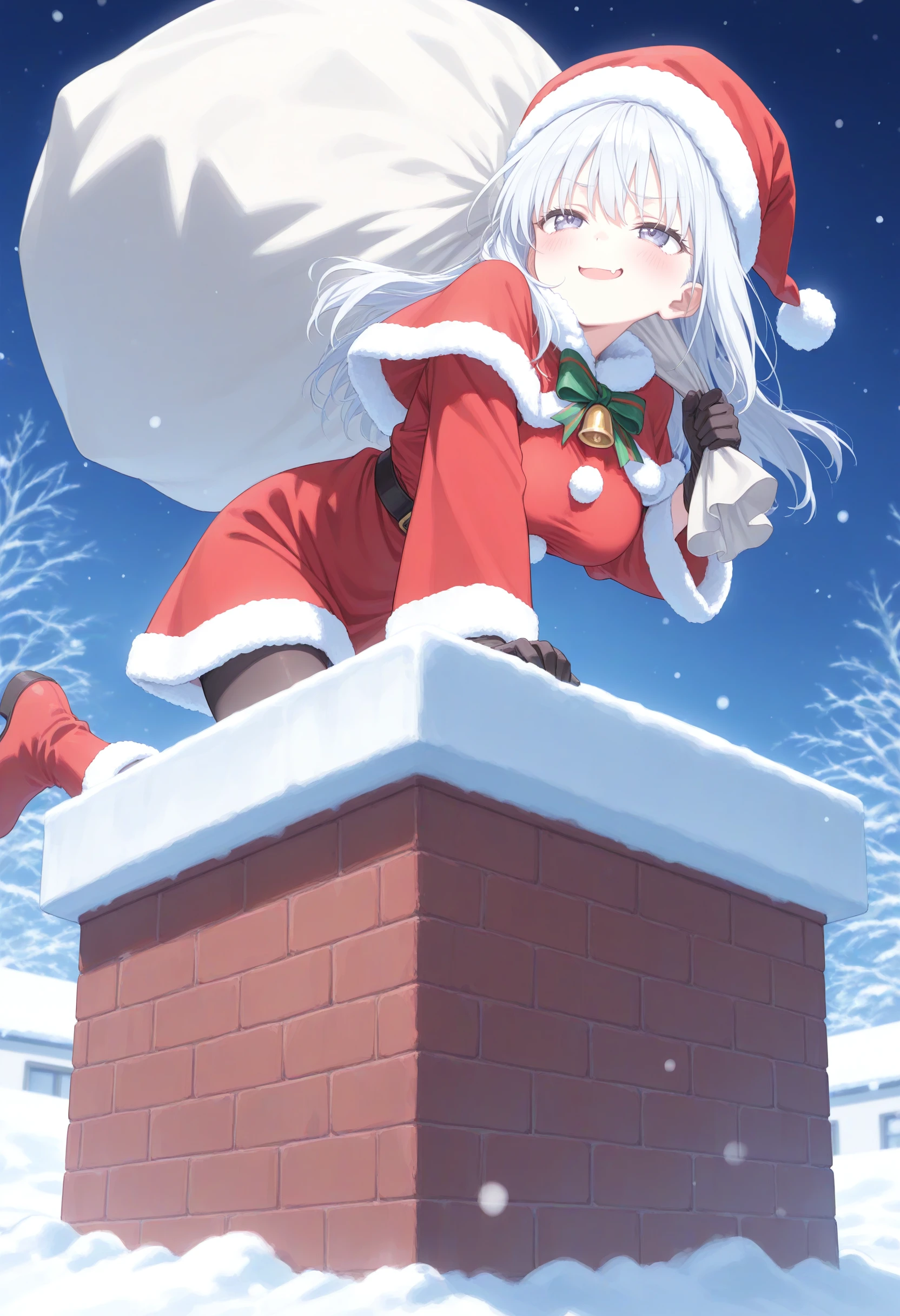 トリガーだけでもある程度は煙突侵入を試みますがサンタ系のプロンプトを入れ、 snowing, night ,brick, rooftop 辺りを入れるとクリスマスっぽさが出ます。足を入れたり顔だけ出したり好みのプロンプトでお試し下さい。
