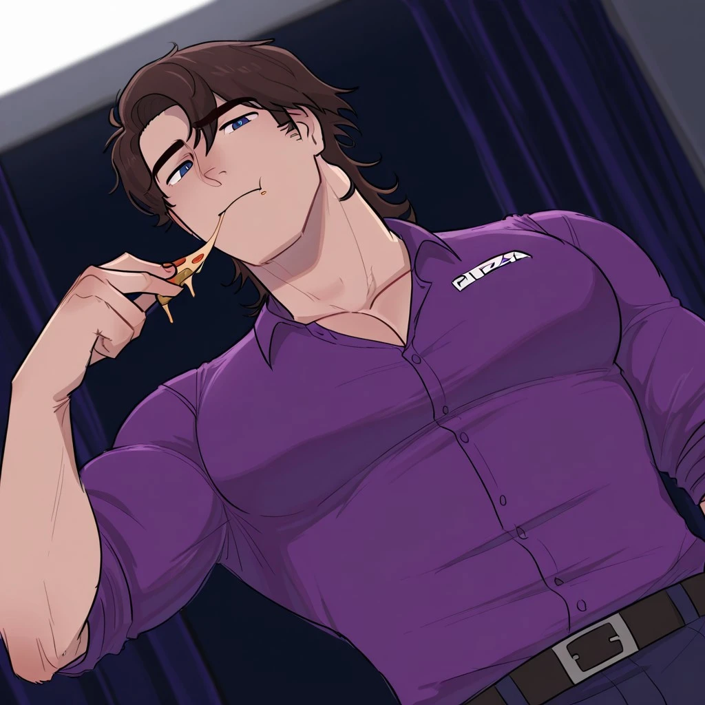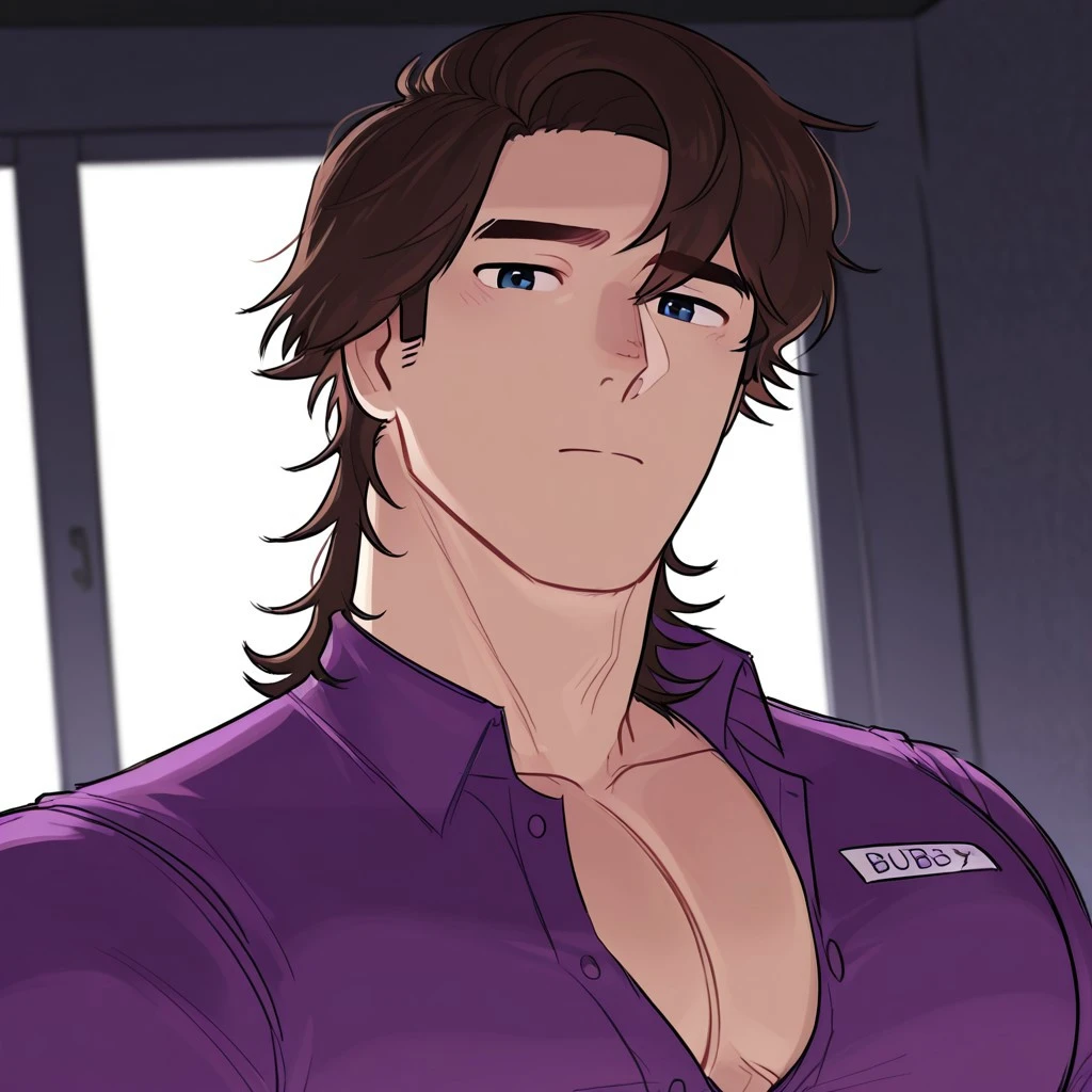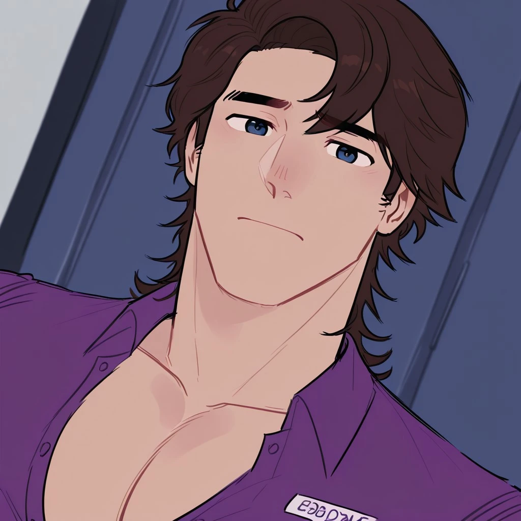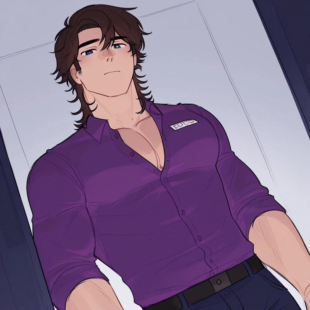 MichaelFNAF, brown hair, mullet, dark blue eyes, buff, massive pecs, male
