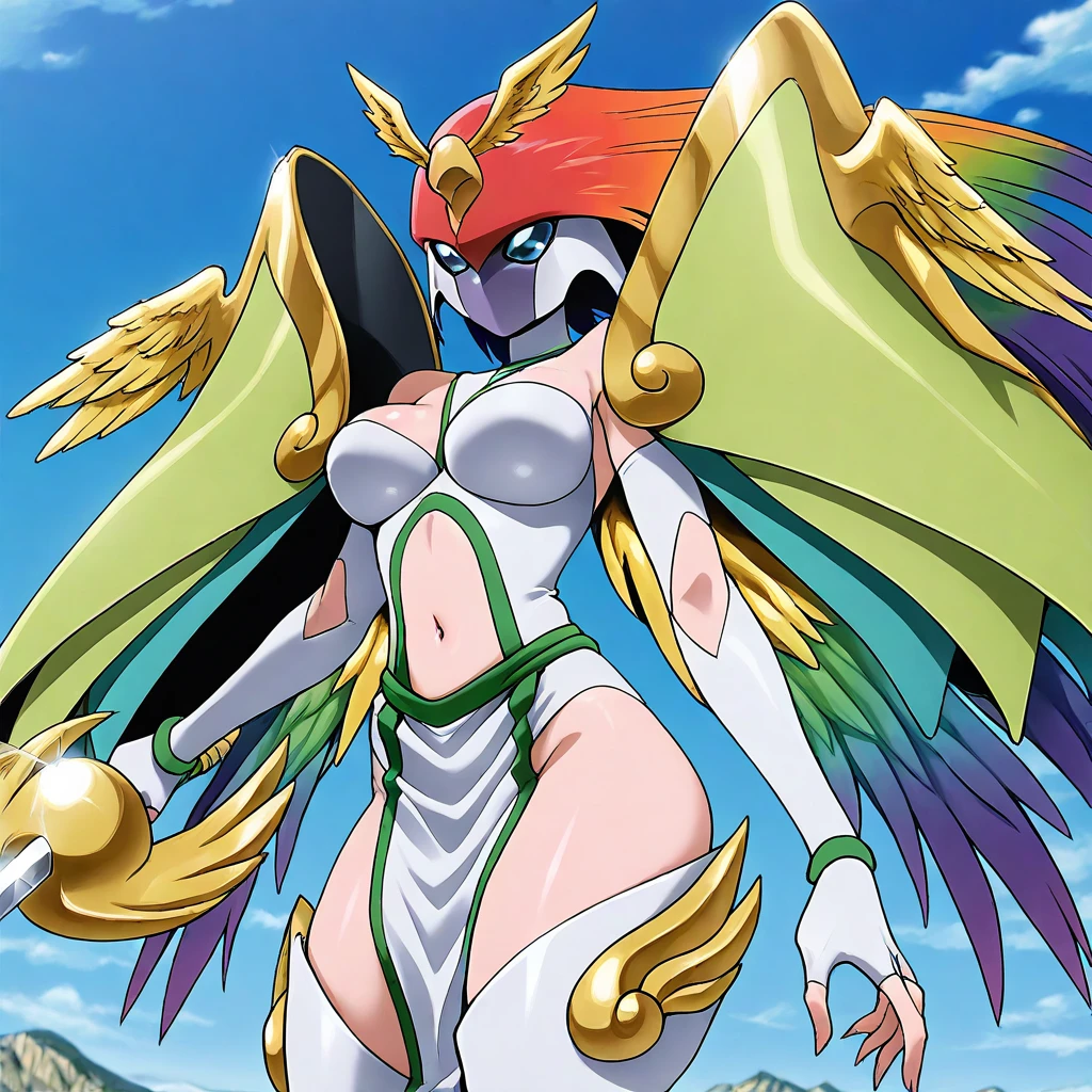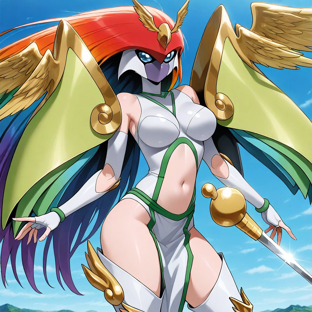 AncientIrismon, 1girl, solo, digimon \(creature\), multicolored hair, purple hair, red hair, purple hair, yellow hair, orange hair, blue hair, long hair, helmet, blue eyes, mask, large breasts, navel, huge shoulder armor, golden wings, curvy, wide hips, navel cutout, clothing cutout, silver white armor, white fingerless gloves, elbow gloves, pelvic curtain, stomach cutout, white silver thighhighs boots, clawed boots, holding sword, rapier, weapon,