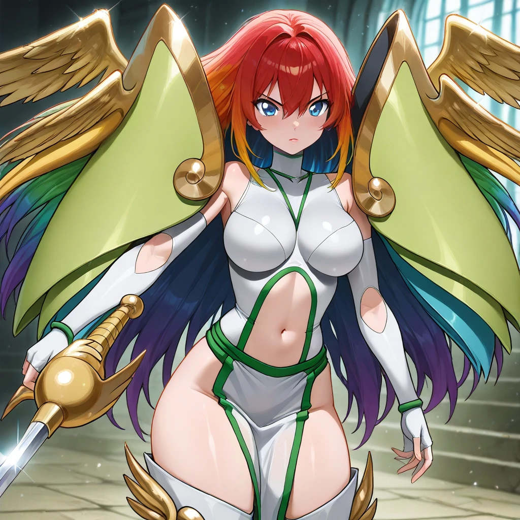 AncientIrismonNoMask, 1girl, solo, digimon \(creature\), multicolored hair, purple hair, red hair, purple hair, yellow hair, orange hair, blue hair, long hair, hair between eyes, hair intakes, blue eyes, pink lips, no mask, no helmet, large breasts, navel, huge shoulder armor, golden wings, curvy, wide hips, navel cutout, clothing cutout, silver white armor, white fingerless gloves, elbow gloves, pelvic curtain, stomach cutout, white silver thighhighs boots, clawed boots, holding sword, rapier, weapon,