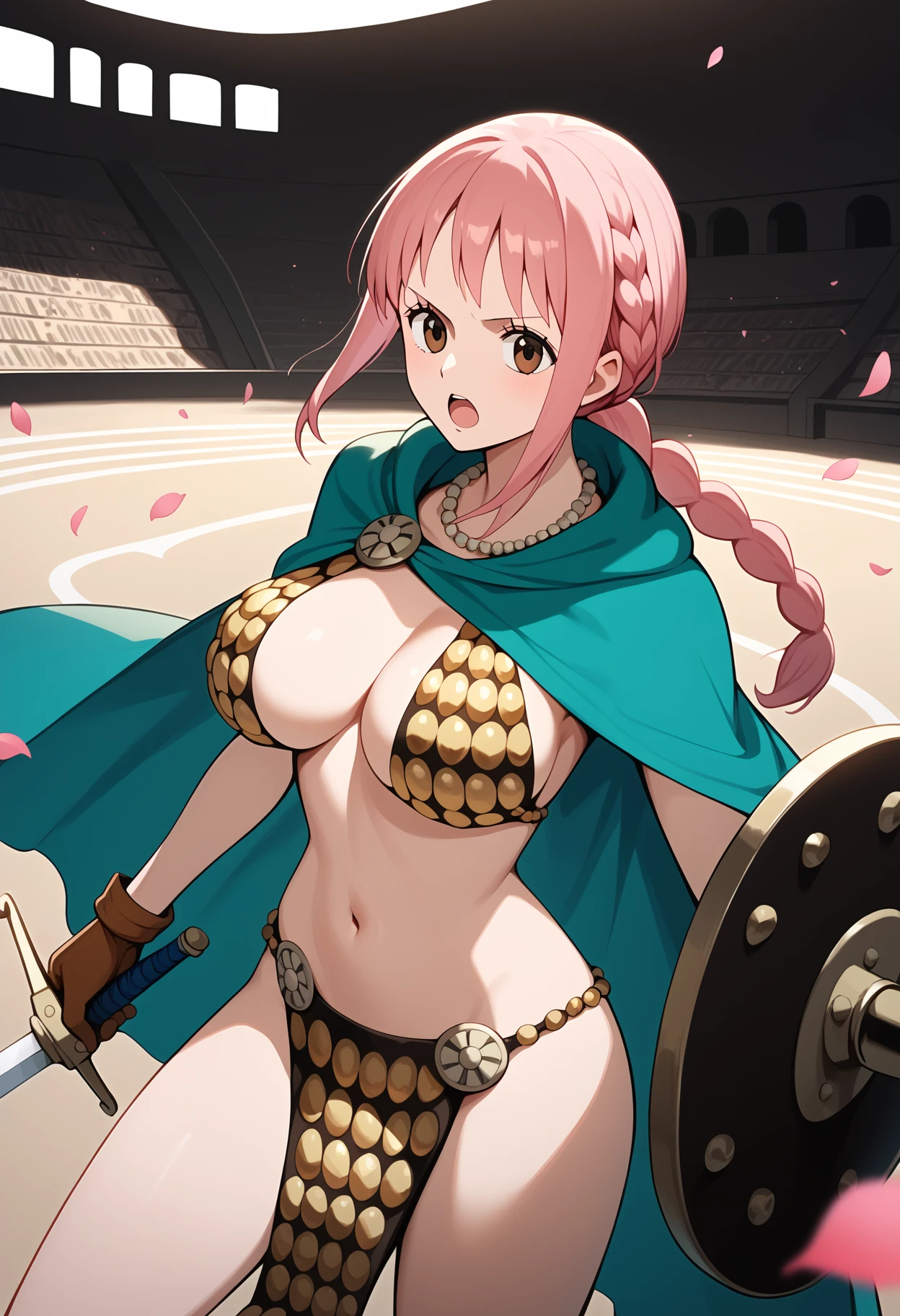 aarebecca, long hair, pink hair, braid, braided ponytail, brown eyes, large breasts, green cape, necklace, cleavage, gold trim, bikini armor, brown gloves, pelvic curtain