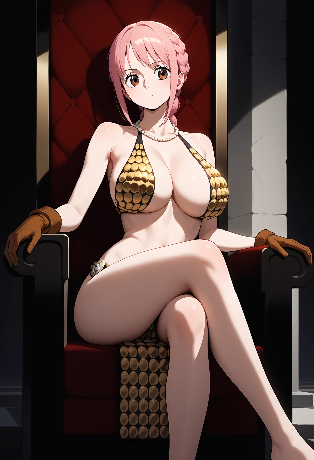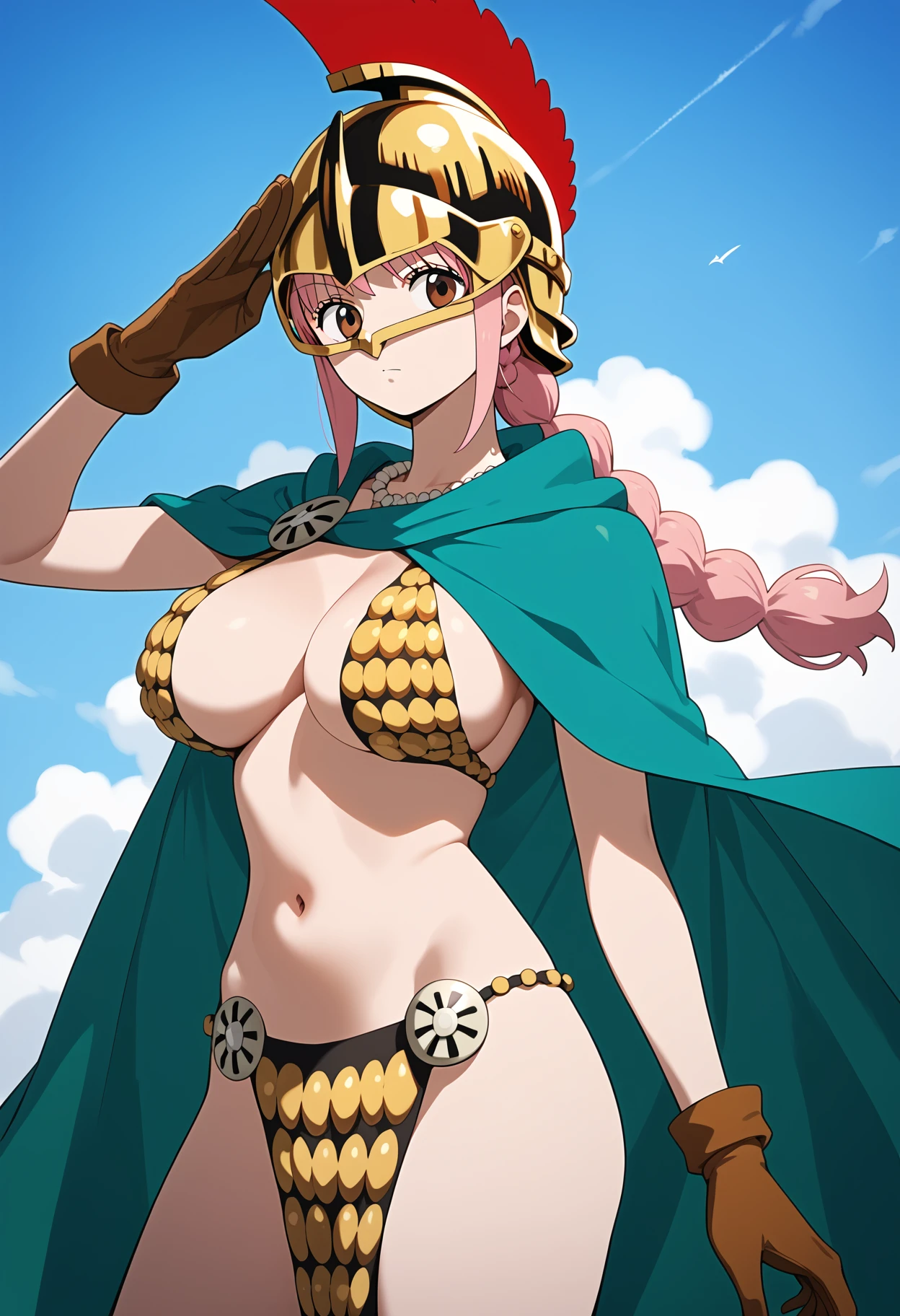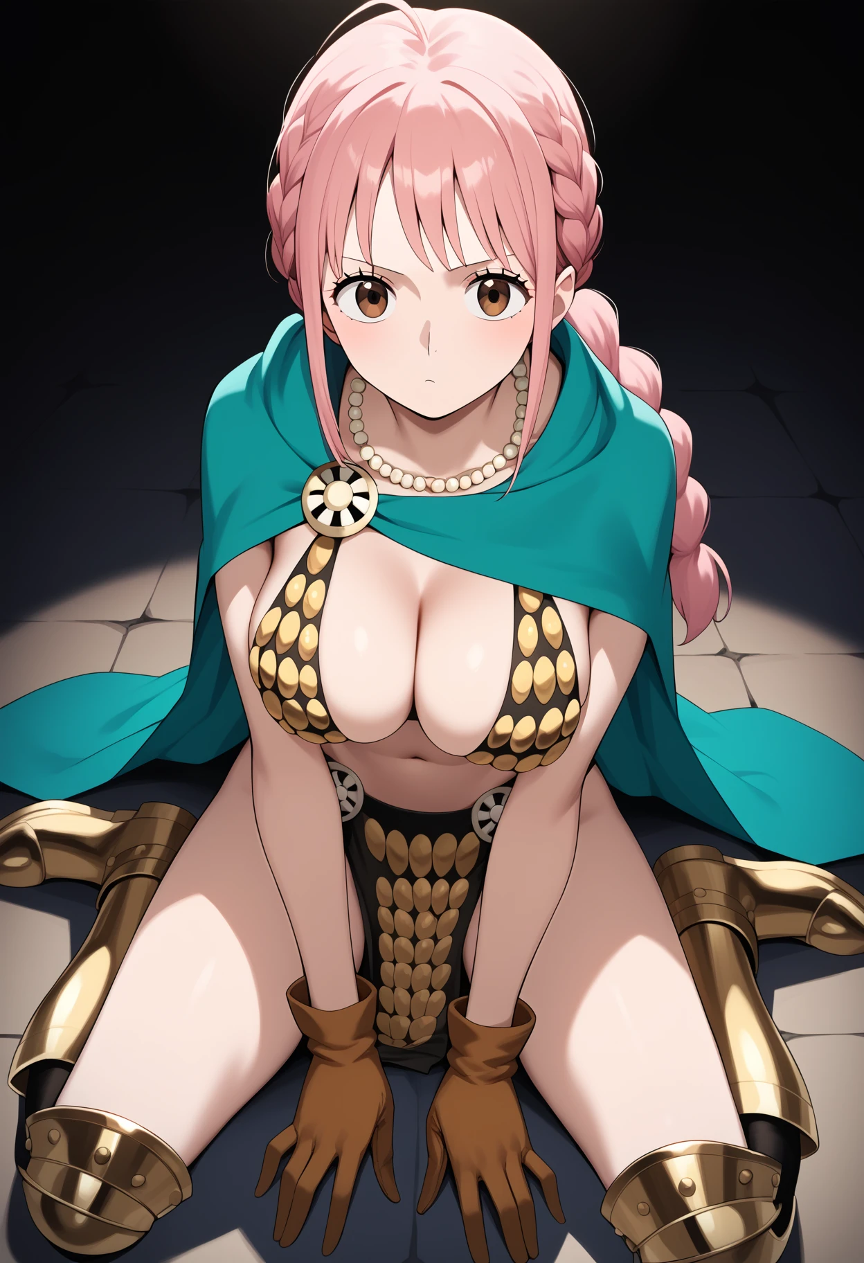 outfit1aarebecca, long hair, pink hair, braid, braided ponytail, brown eyes, large breasts, green cape, necklace, cleavage, gold trim, bikini armor, brown gloves, pelvic curtain