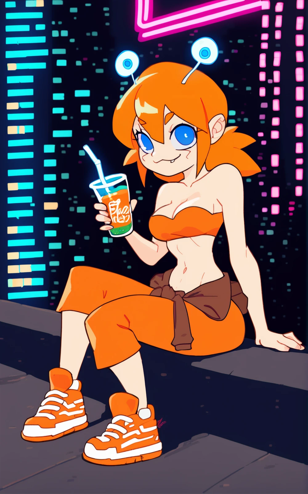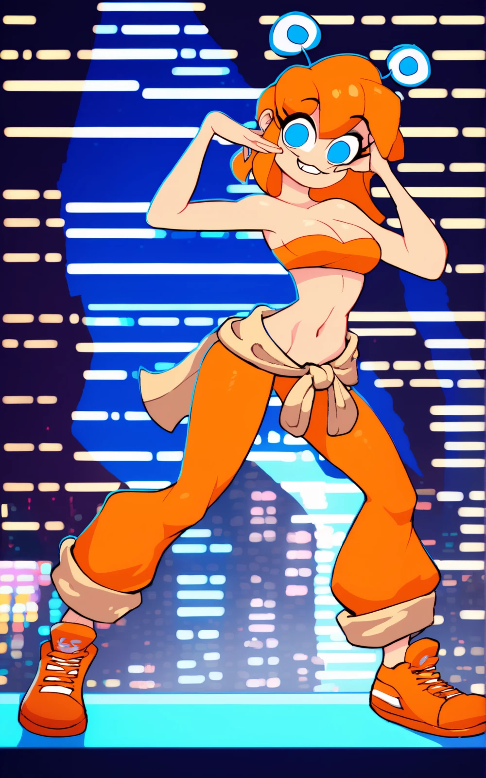 For her Outfit 1: navel, pants, midriff, orange hair, bare shoulders, shoes, orange pants,orange bandeau, orange shoes, clothes around waist