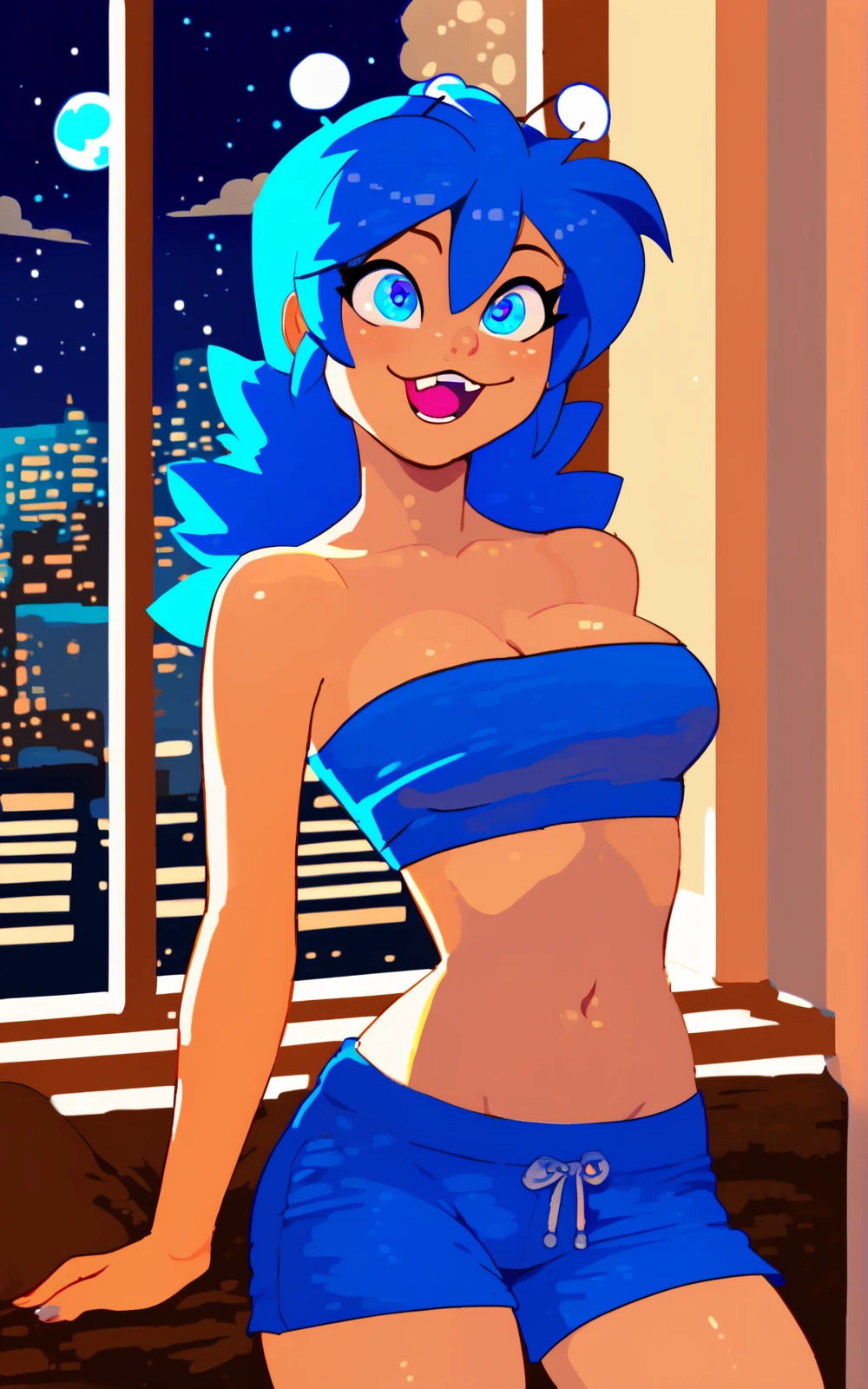 For her Outfit 2: blue shorts,biker shorts,blue bandeau, navel, midriff, blue hair