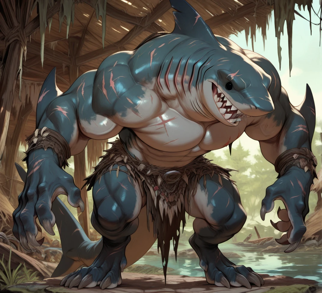 Pony Tags: shark, wereshark, anthro, sharp teeth, black eyes, beady eyes, shark fins, tail, shark tail, gills, claws, muscular, etc...