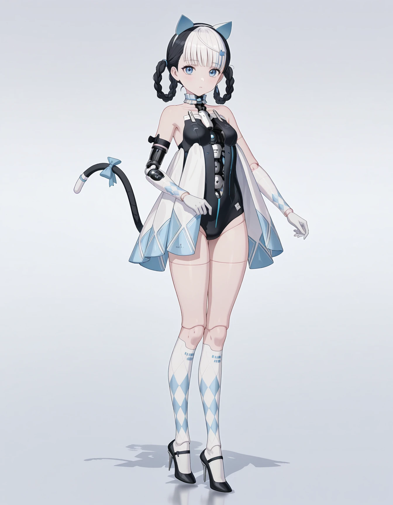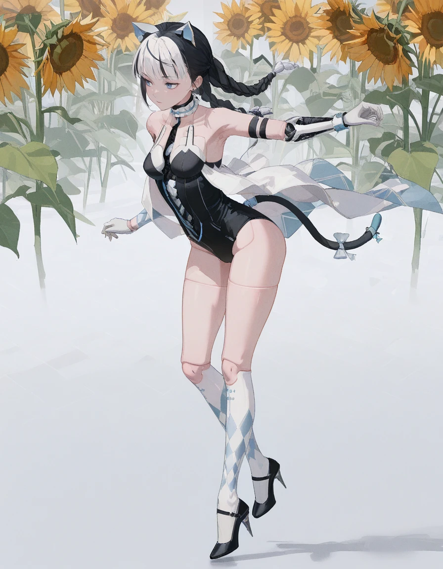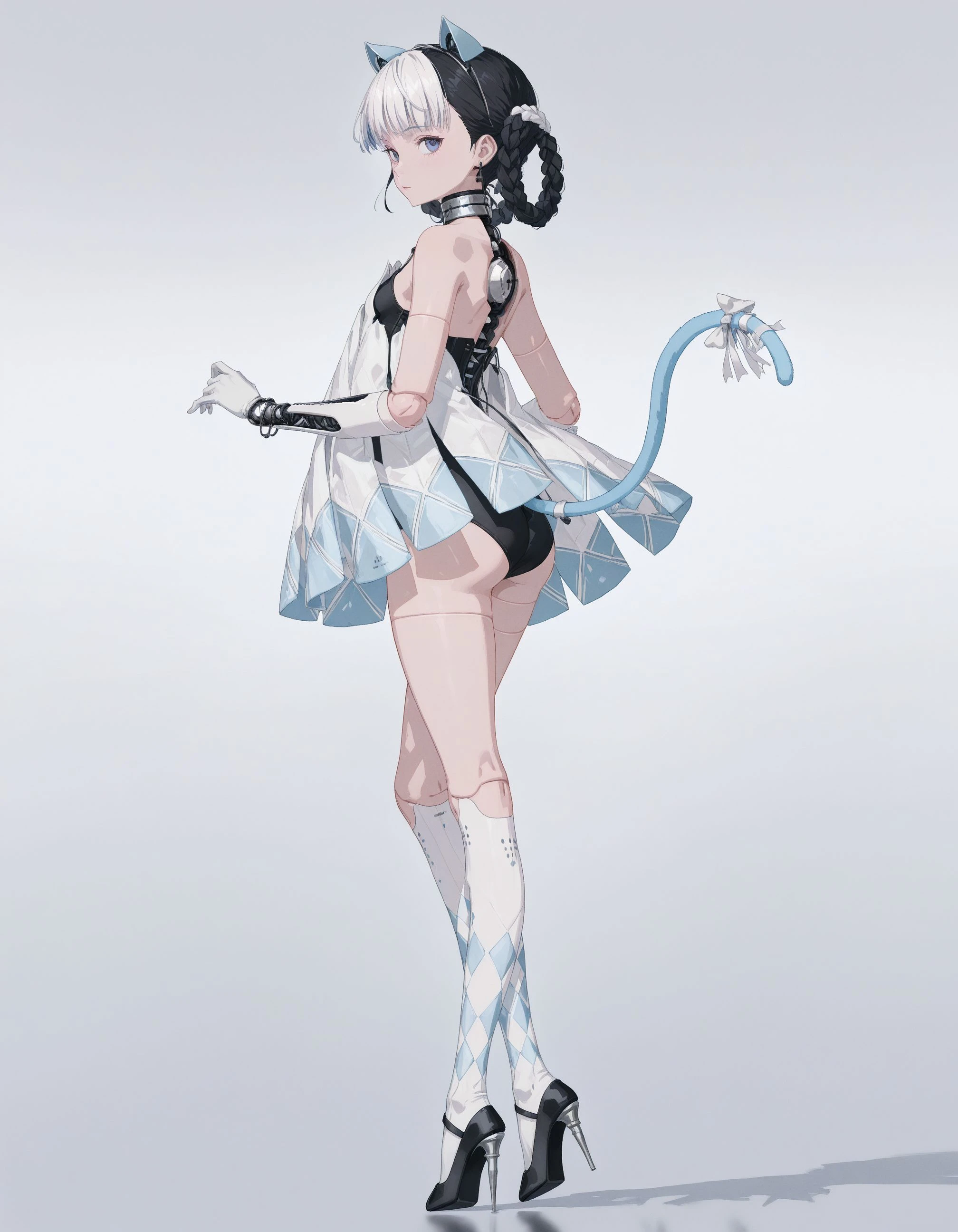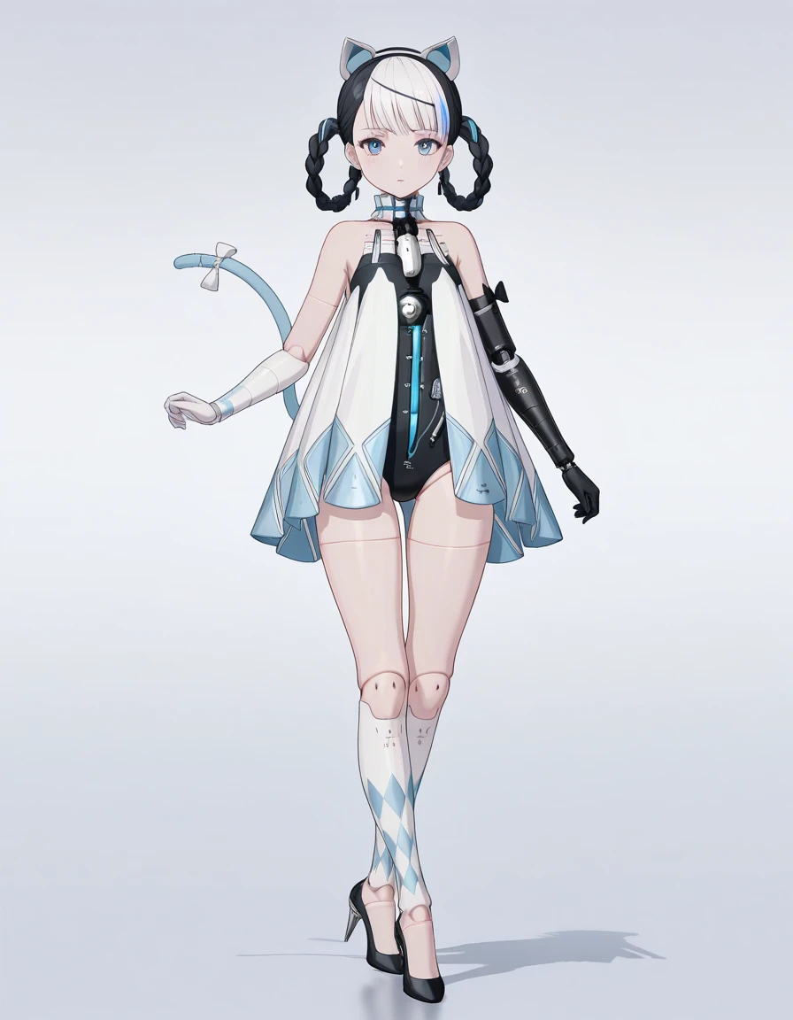 mai_pgr_bbnt_ll,multicolored_hair,white_hair,black_hair,twin_braids,braided bun,fake_cat_ears,fake_tail,blue_tail,tail bow,mechanical_parts,mechanical_arms,doll_joints,black_leotard,white_dress,white gloves,white socks,black high_heels,stiletto_heels