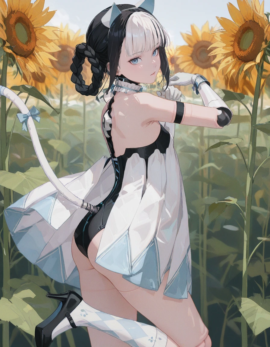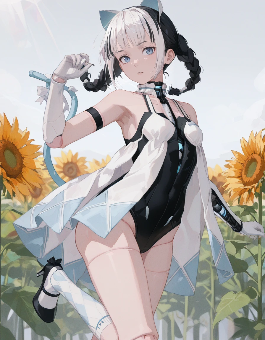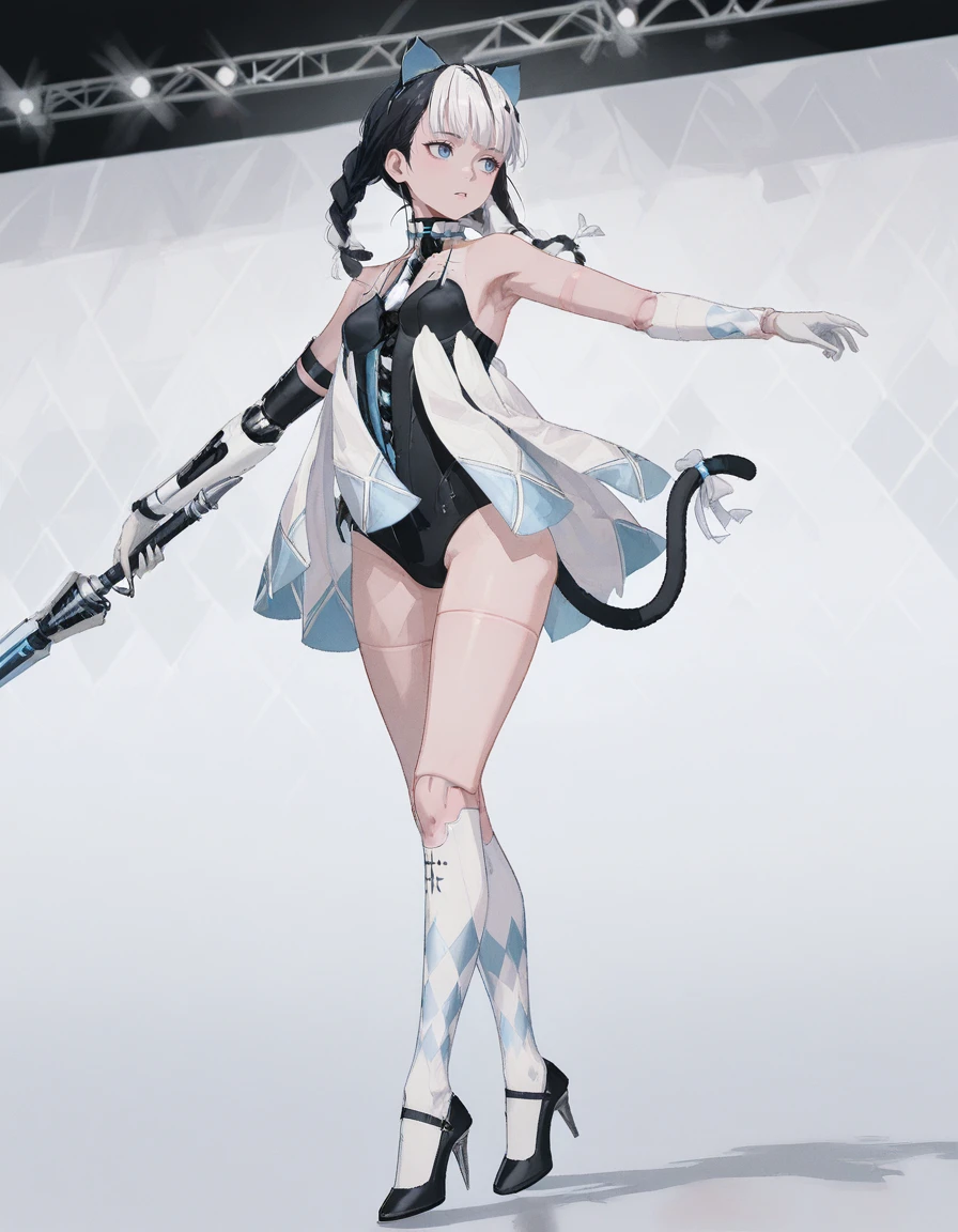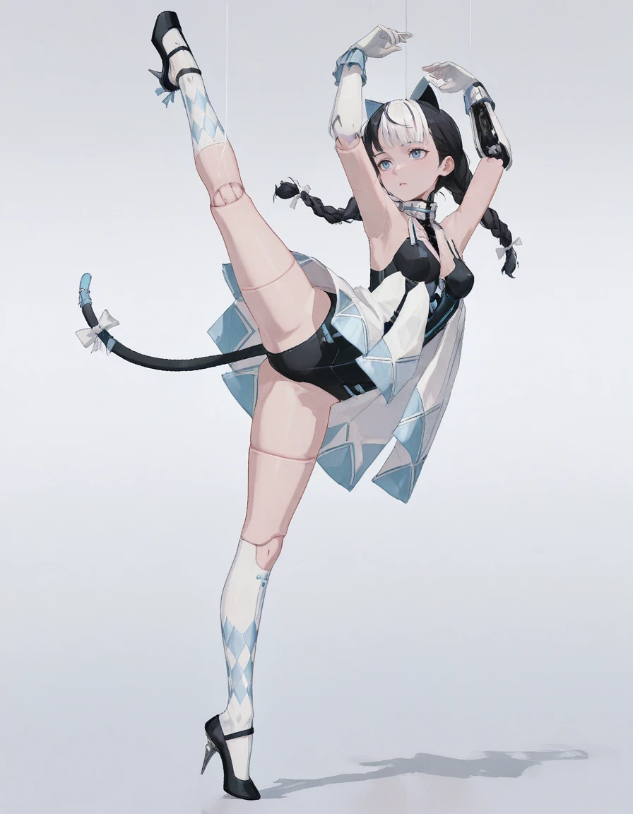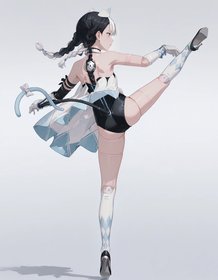 mai_pgr_bbnt_ll,multicolored_hair,white_hair,black_hair,twin_braids,braided bun,fake_cat_ears,fake_tail,blue_tail,tail bow,mechanical_parts,mechanical_arms,doll_joints,black_leotard,white_dress,white gloves,white socks,black high_heels,stiletto_heels