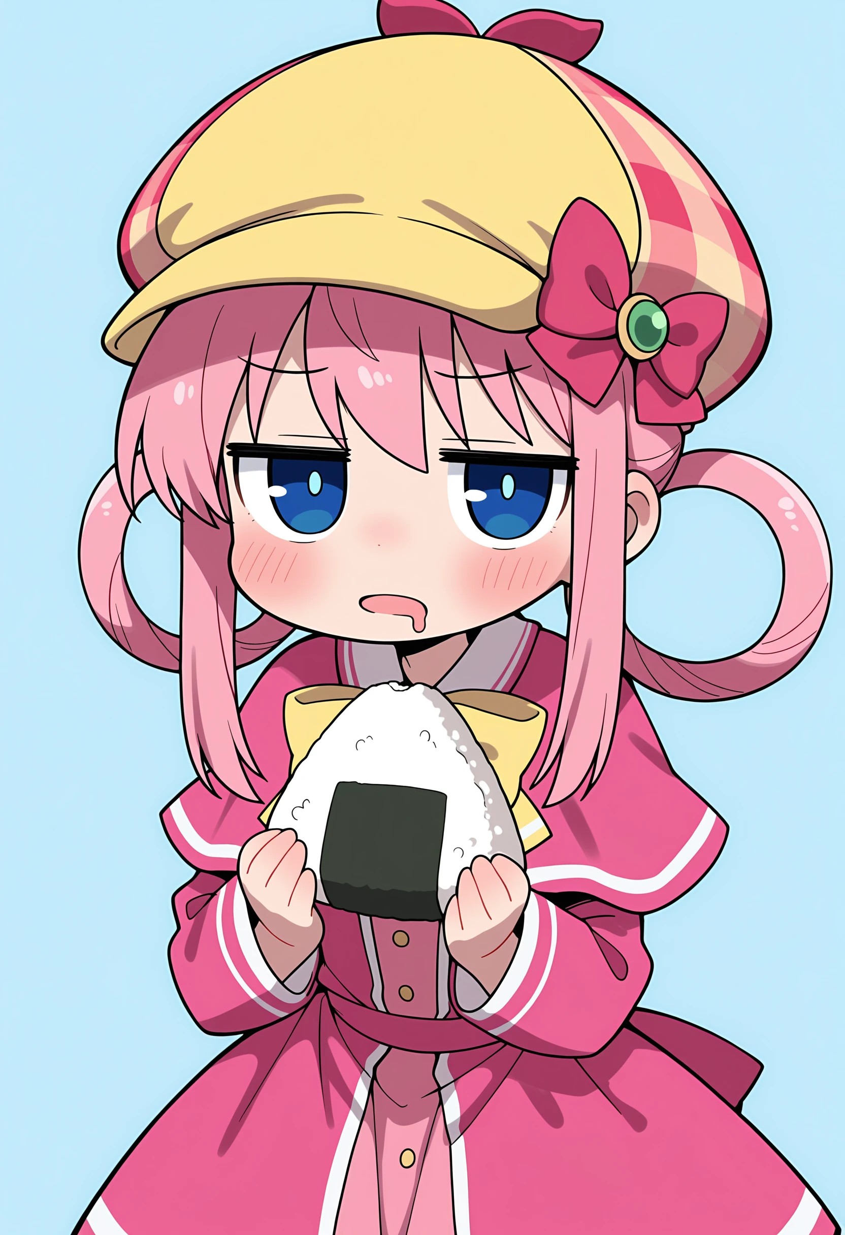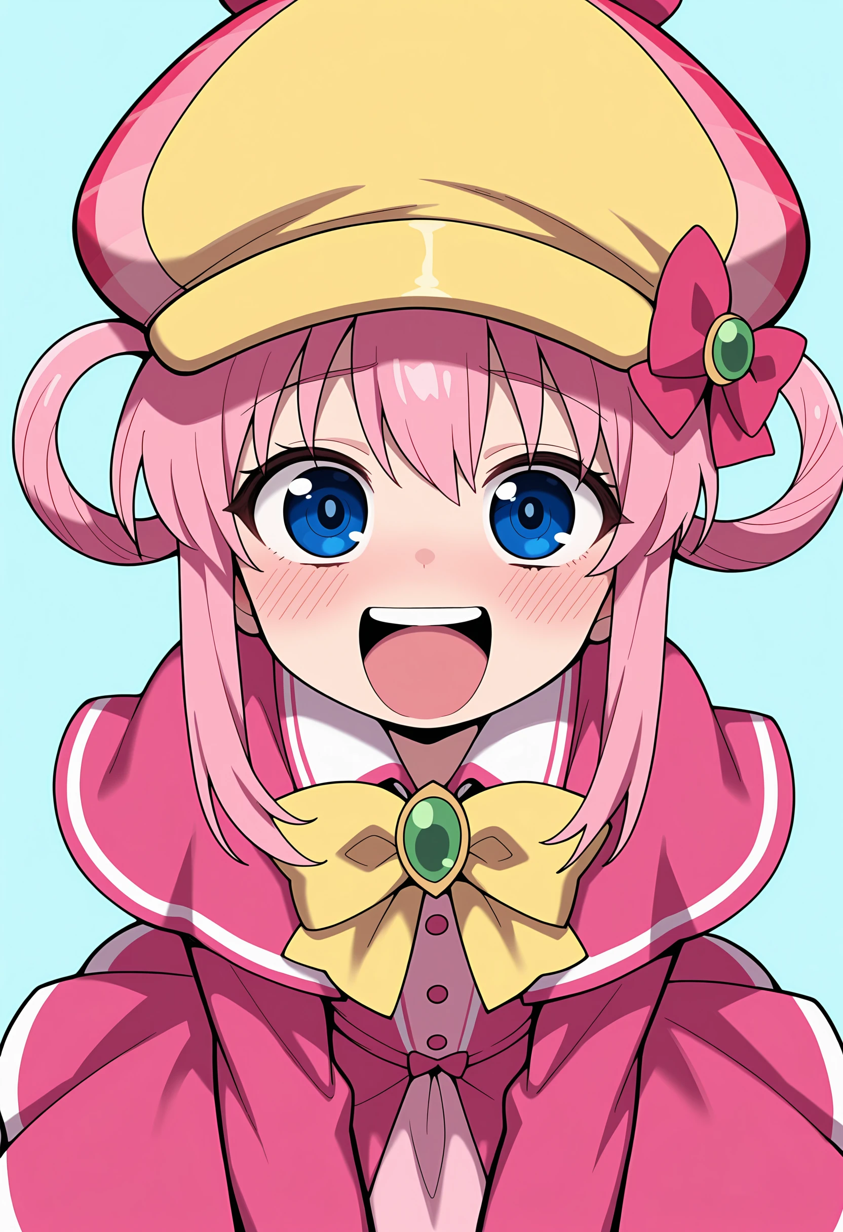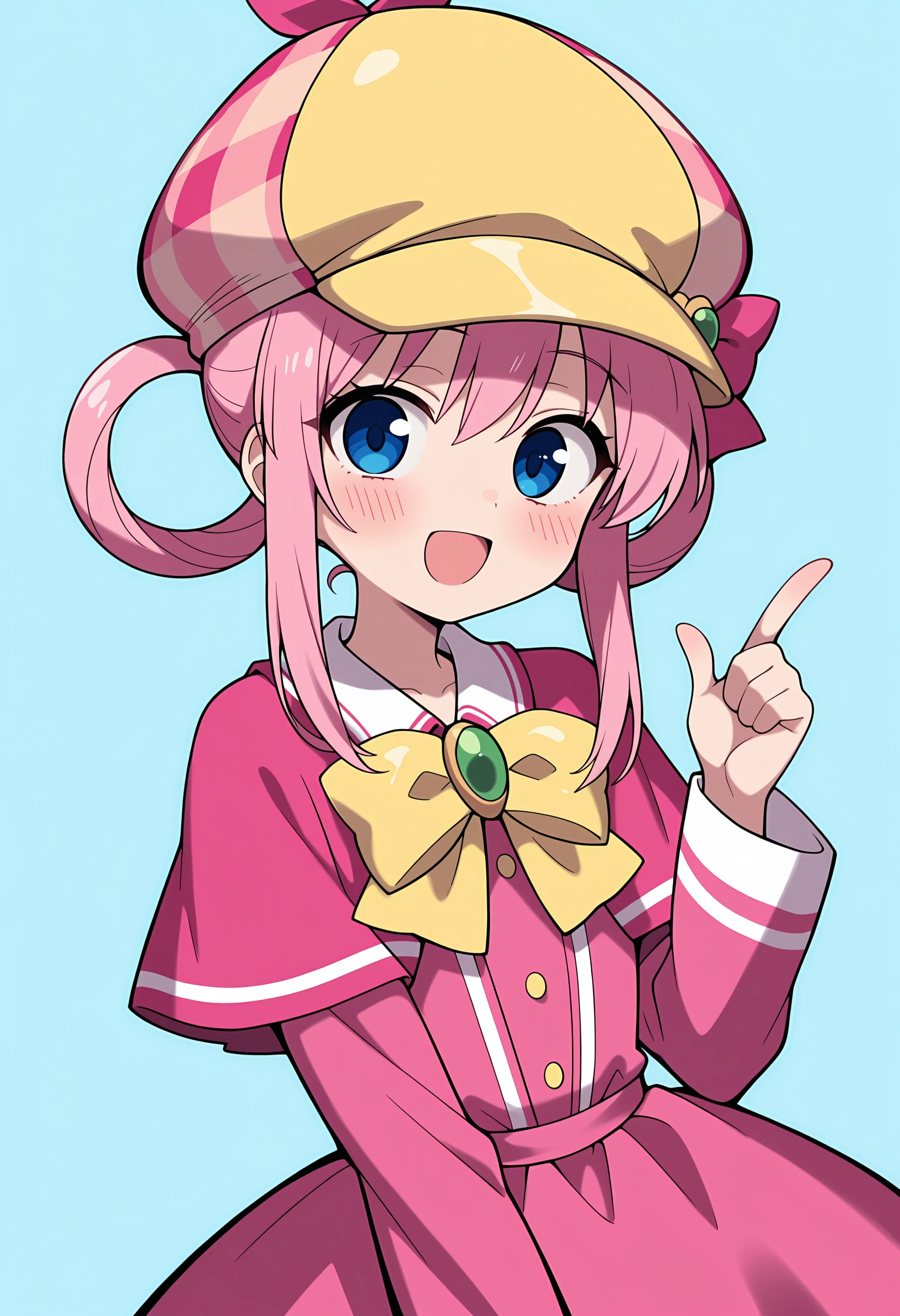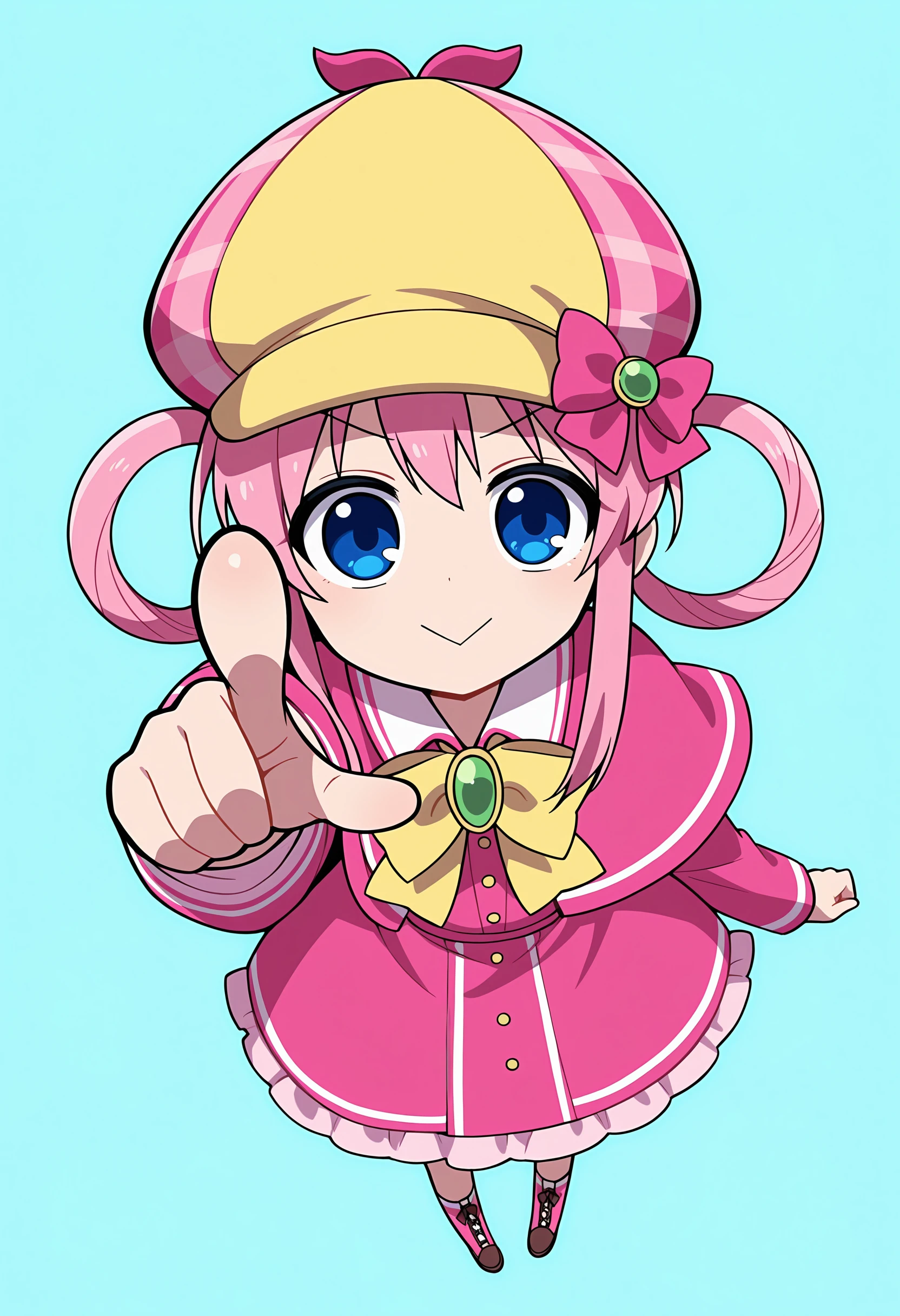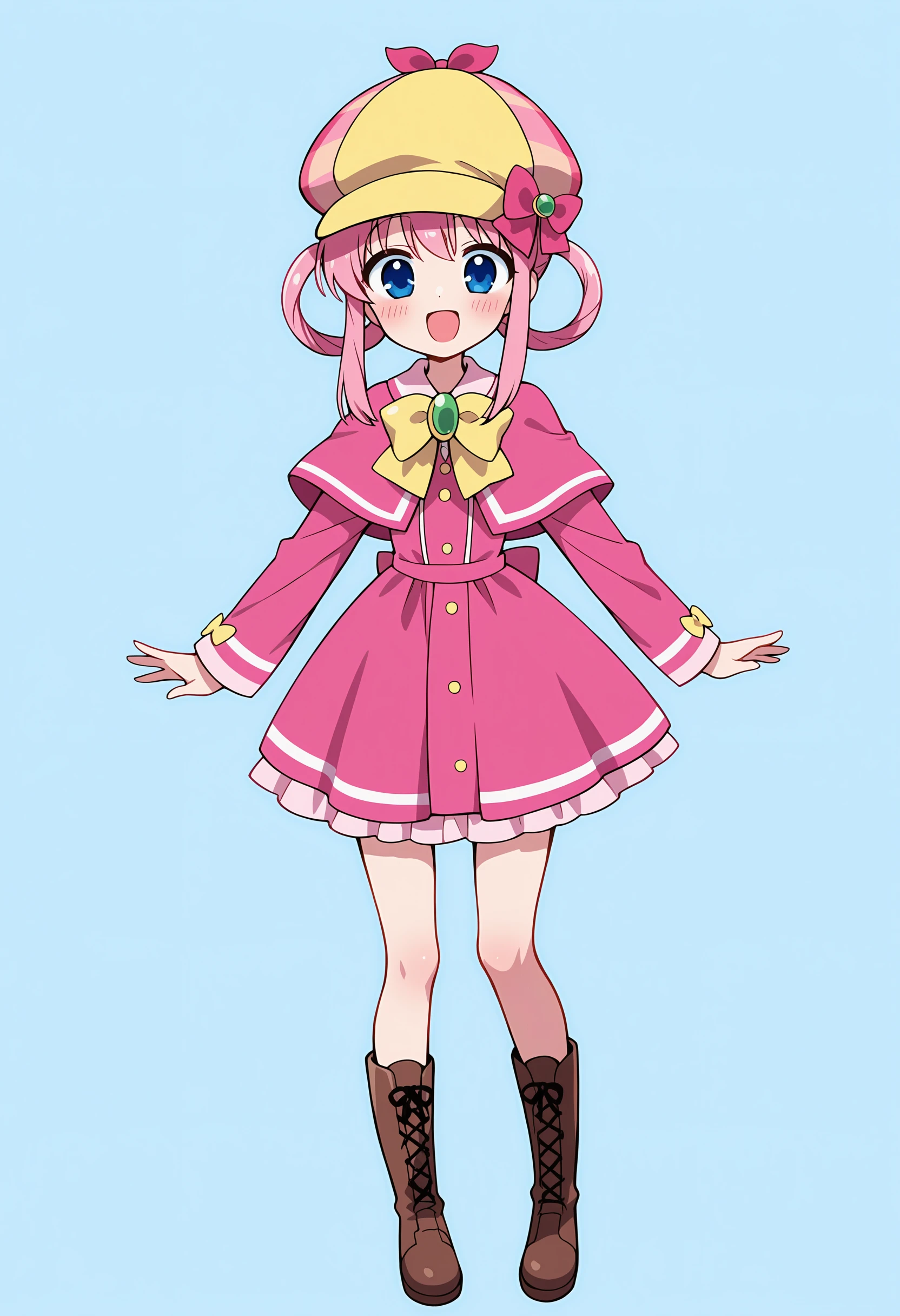 sshrilf, blue eyes, pink hair, hair rings, deerstalker, pink dress, capelet