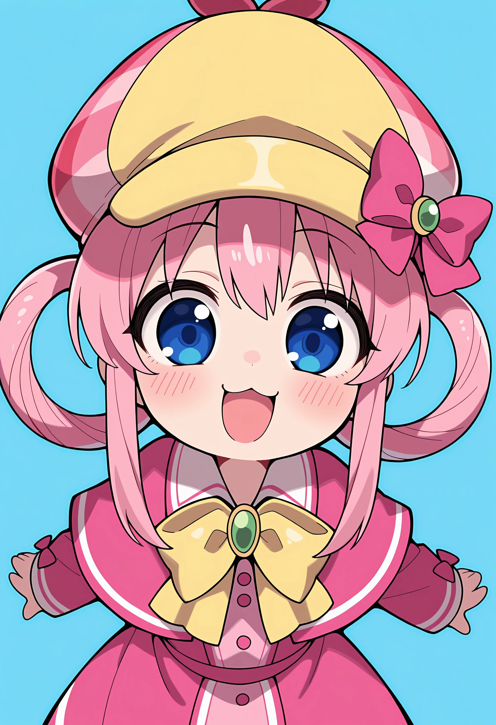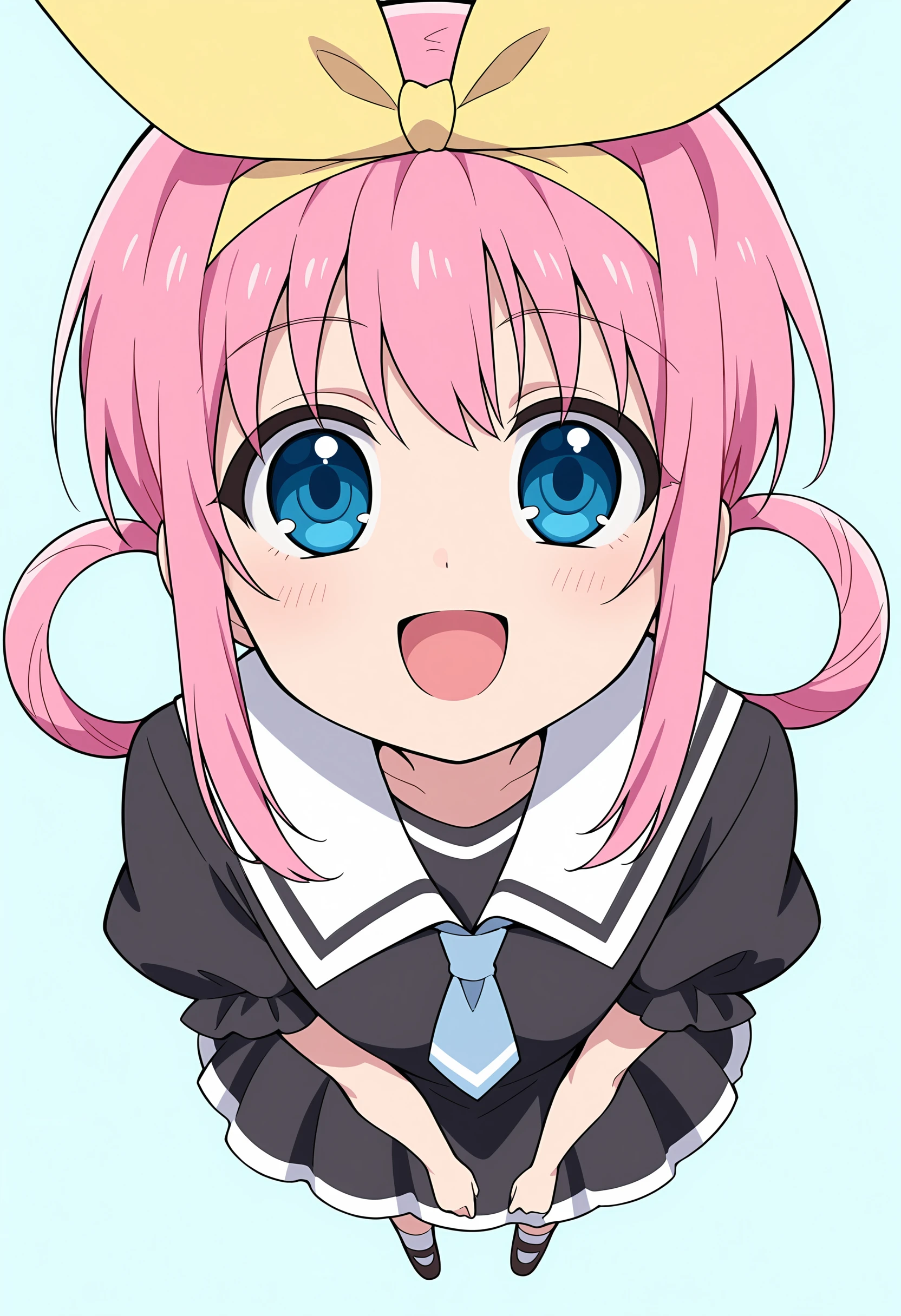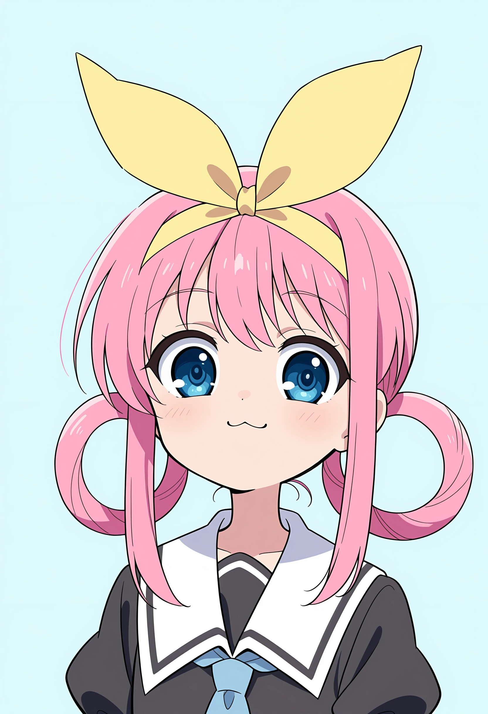 Outfit "Black Serafuku": blue eyes, pink hair, hair rings, black serafuku, hair bow