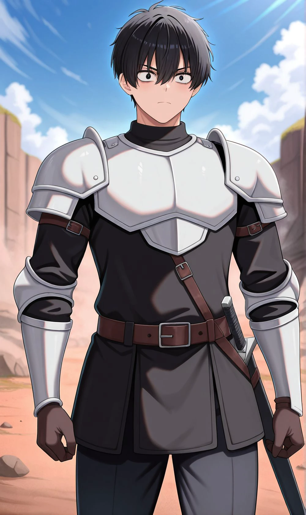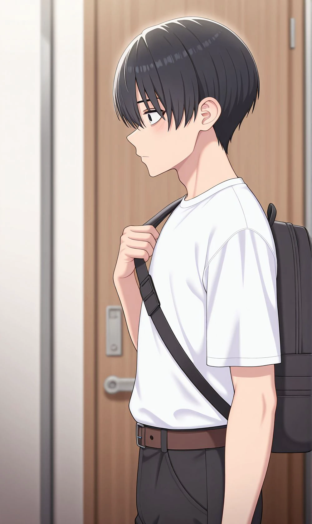 solo,black hair, white shirt, black pants, backBag ,short sleeves, from side, holding,